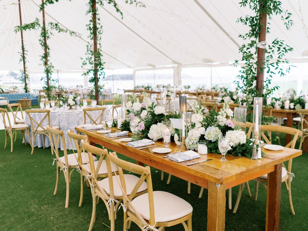 - Furniture and Decor: White or light-colored furniture pieces, including whitewashed wooden chairs, flowy linen tablecloths, and soft seating areas with plush pillows, create a breezy aesthetic. Simple florals with roses, baby’s breath, and eucalyptus add a fresh touch.