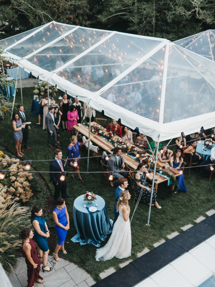 Below, Aly + Gavin’s downtown Rehoboth Beach Wedding under multiple clear top tents, configured to fit the backyard space, mixing farmhouse tables with rounds and cross back chairs for guest seating. They held their ceremony overlooking Silver Lake. You can see the full gallery and all wedding vendors, here.