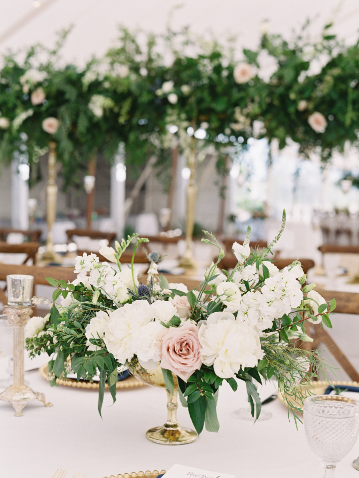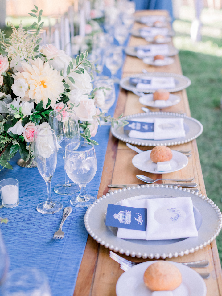 Loving the soft blue toile linens with the wood tones of the sailcloth tent poles and cross back chairs. Greenery accents draped in the tent top offer a classic coastal, yet garden party look.
