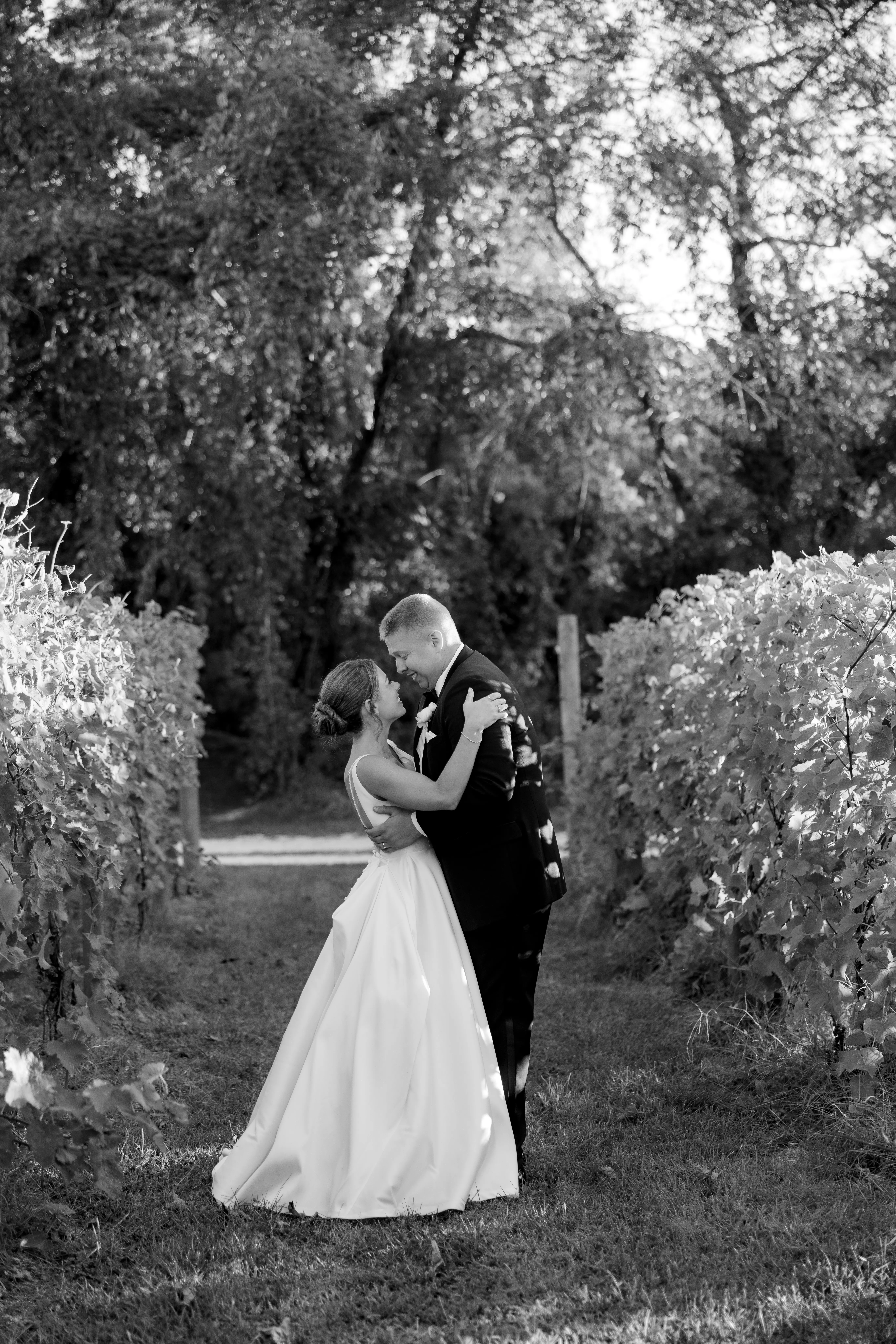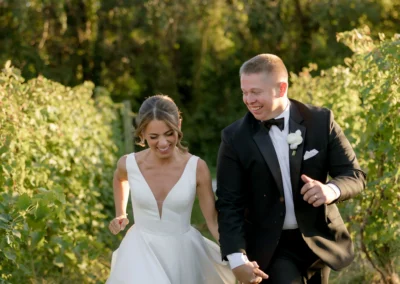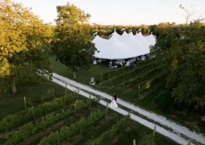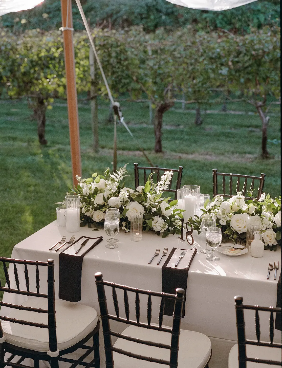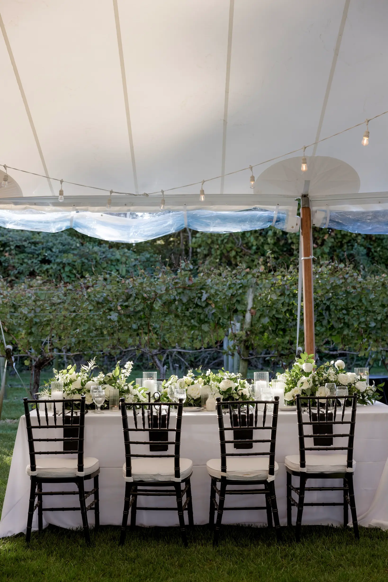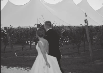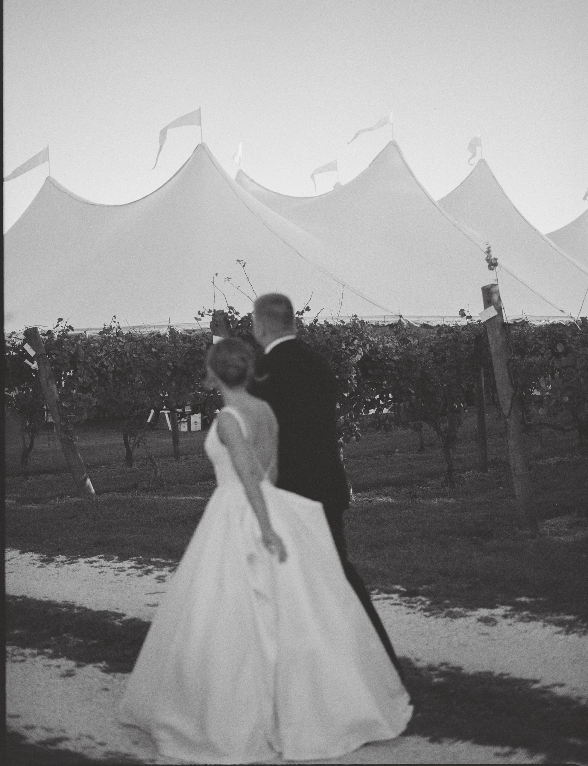 Set among the vineyard rows at Isaac Smith Vineyard, this October wedding brought together classic black and white wedding design, natural greenery, and a beautiful sailcloth tent reception. The result was an outdoor celebration that felt polished, timeless, and perfectly suited to the vineyard setting.