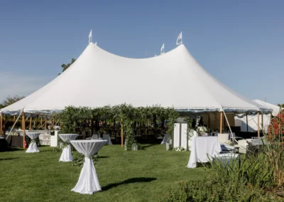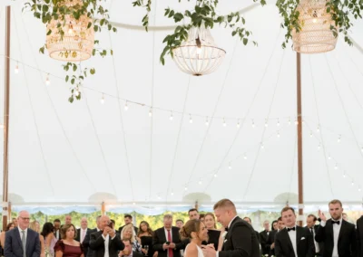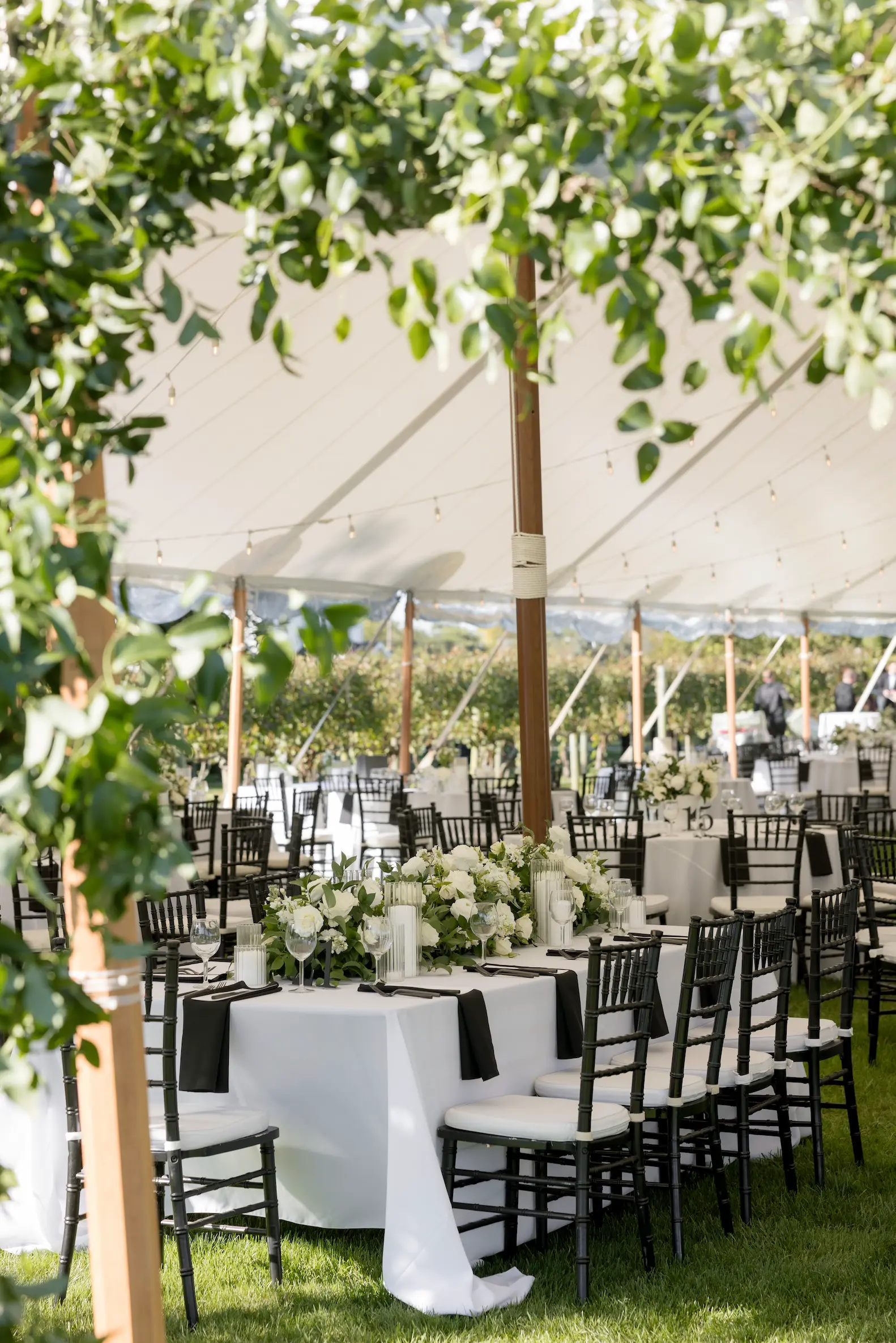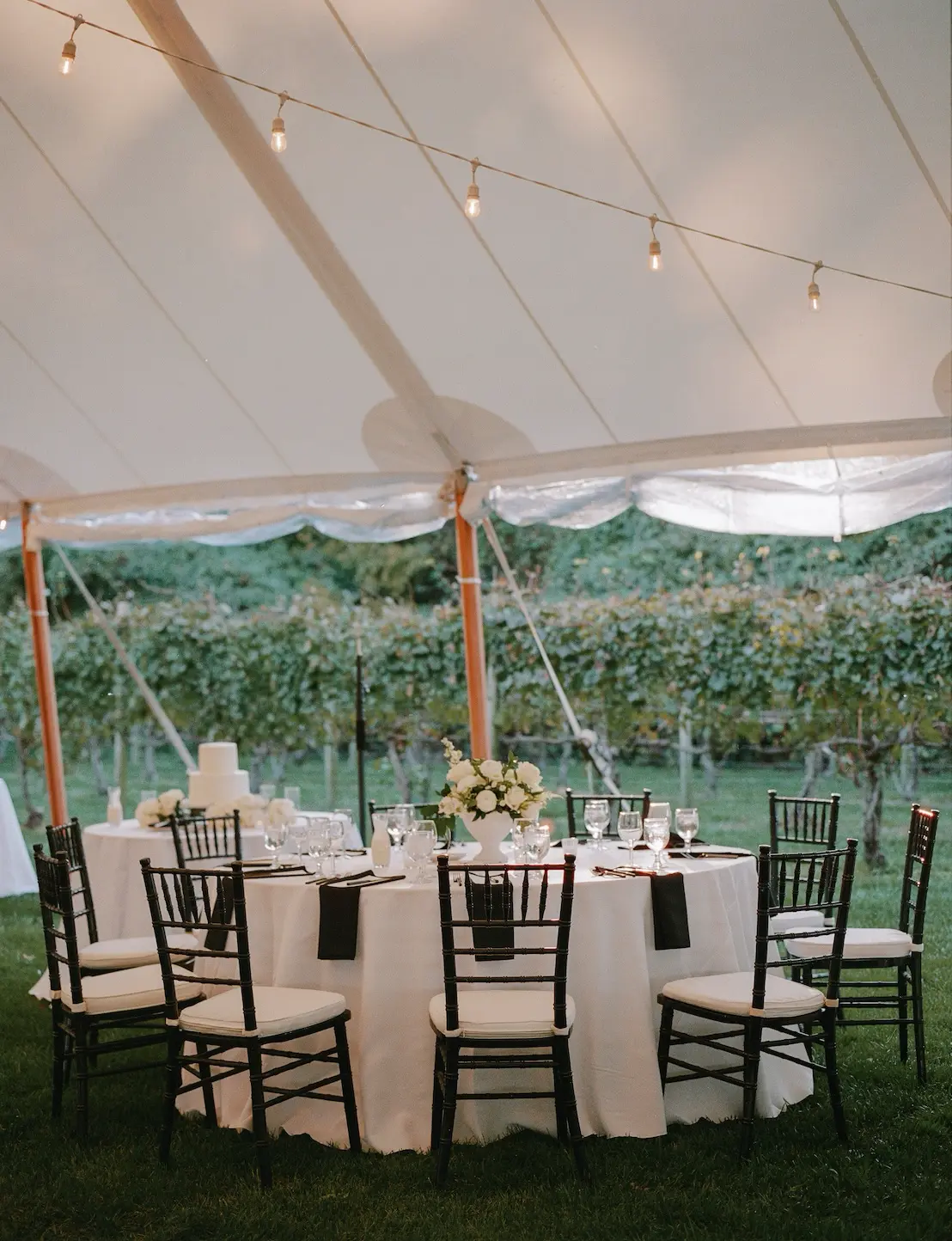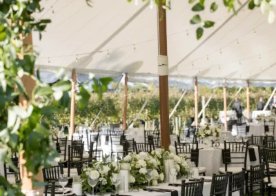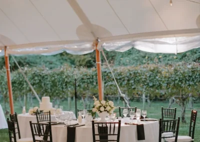 For this wedding, Collective Event Group provided the tenting and event rentals that helped transform the vineyard lawn into a refined reception space. The sailcloth tent created a bright, open setting for dinner and dancing, while the black and white palette added a formal, elegant feel throughout the celebration.