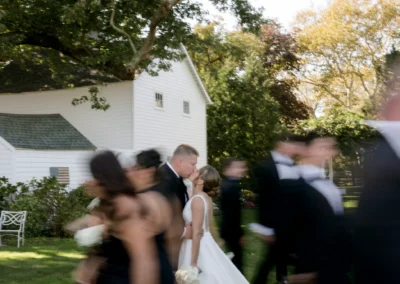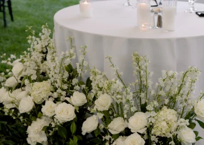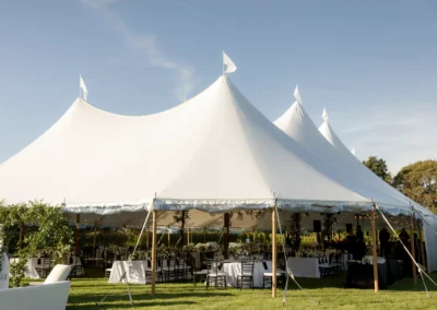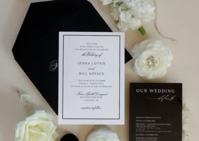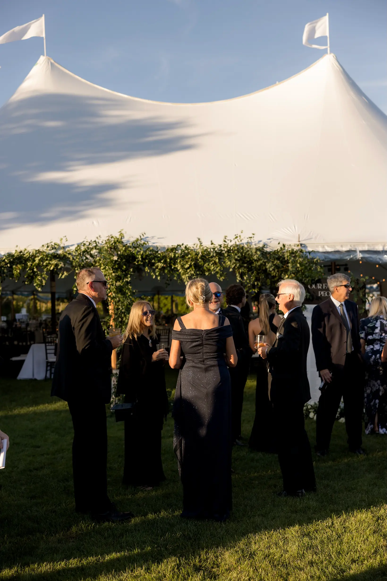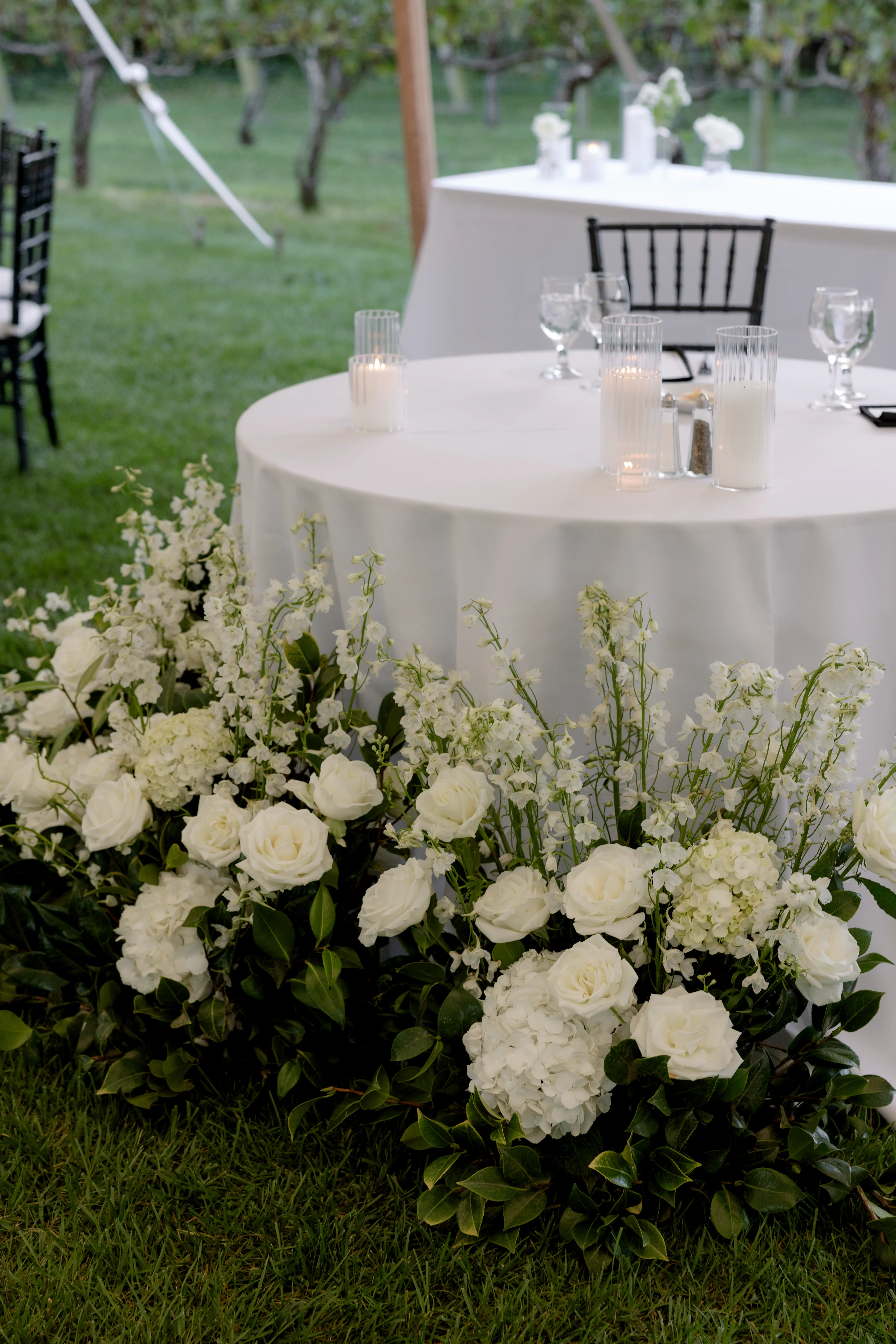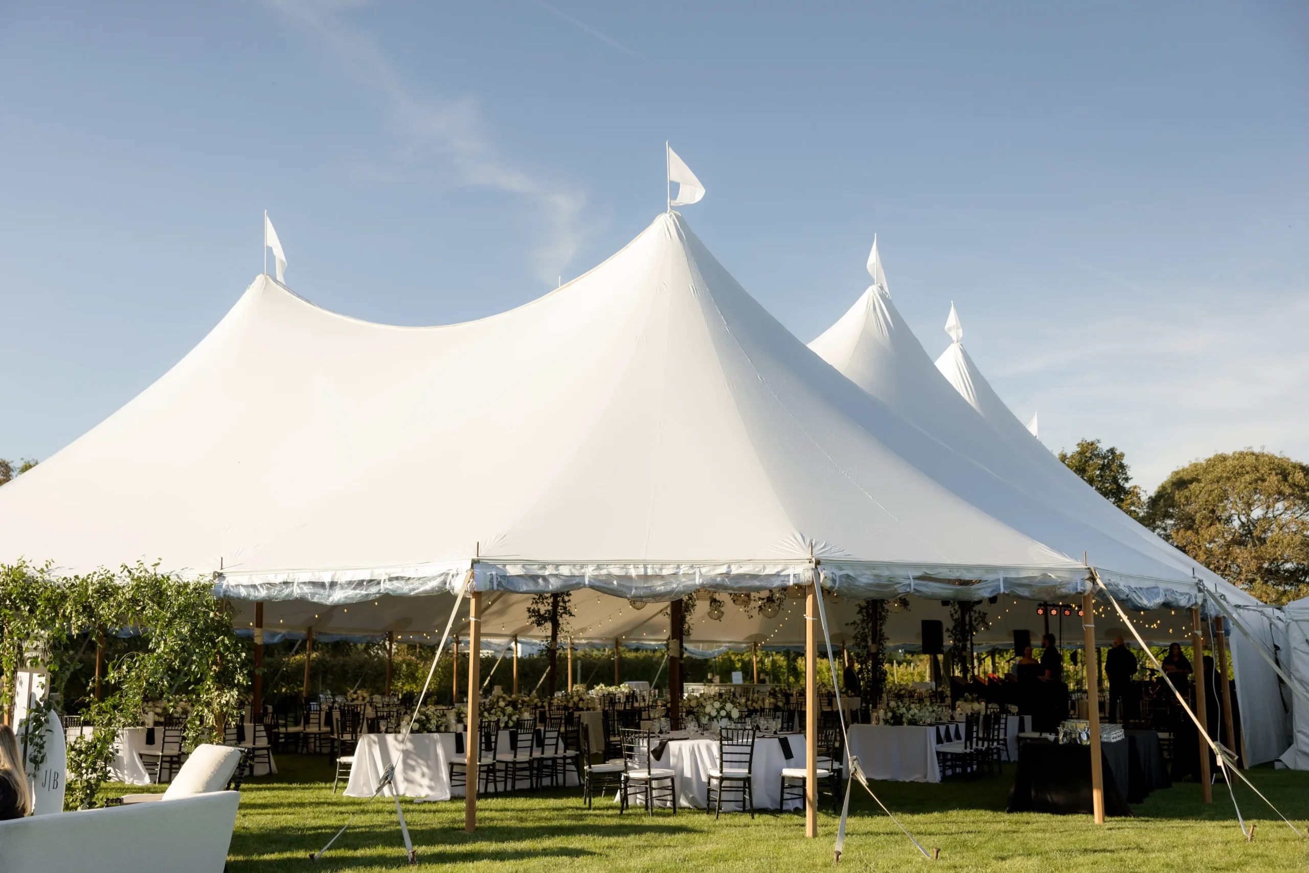 For this wedding, Collective Event Group provided the tenting and event rentals that helped transform the vineyard lawn into a refined reception space. The sailcloth tent created a bright, open setting for dinner and dancing, while the black and white palette added a formal, elegant feel throughout the celebration.