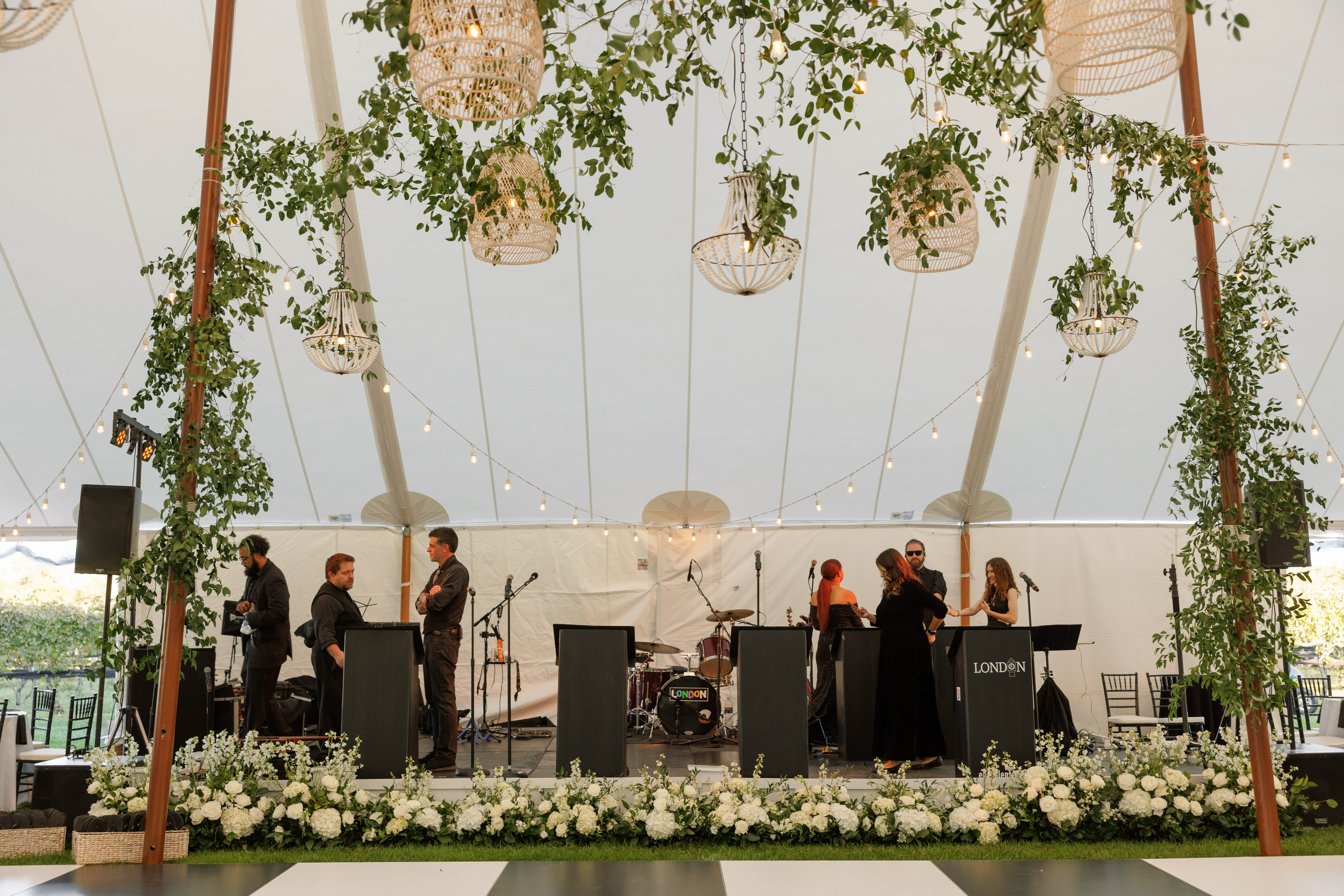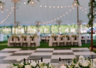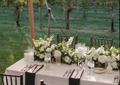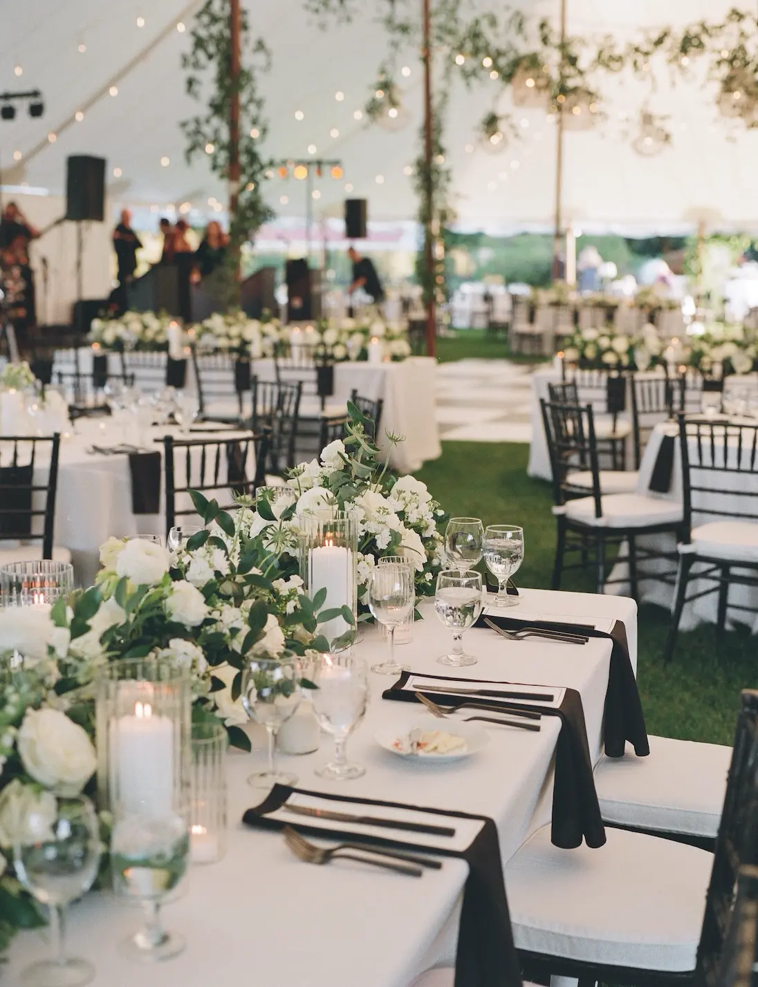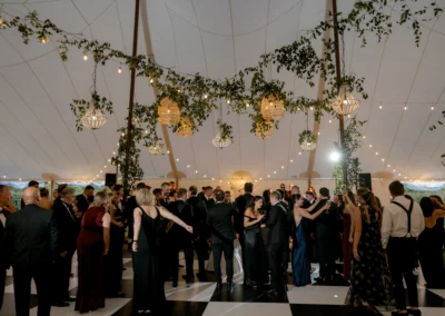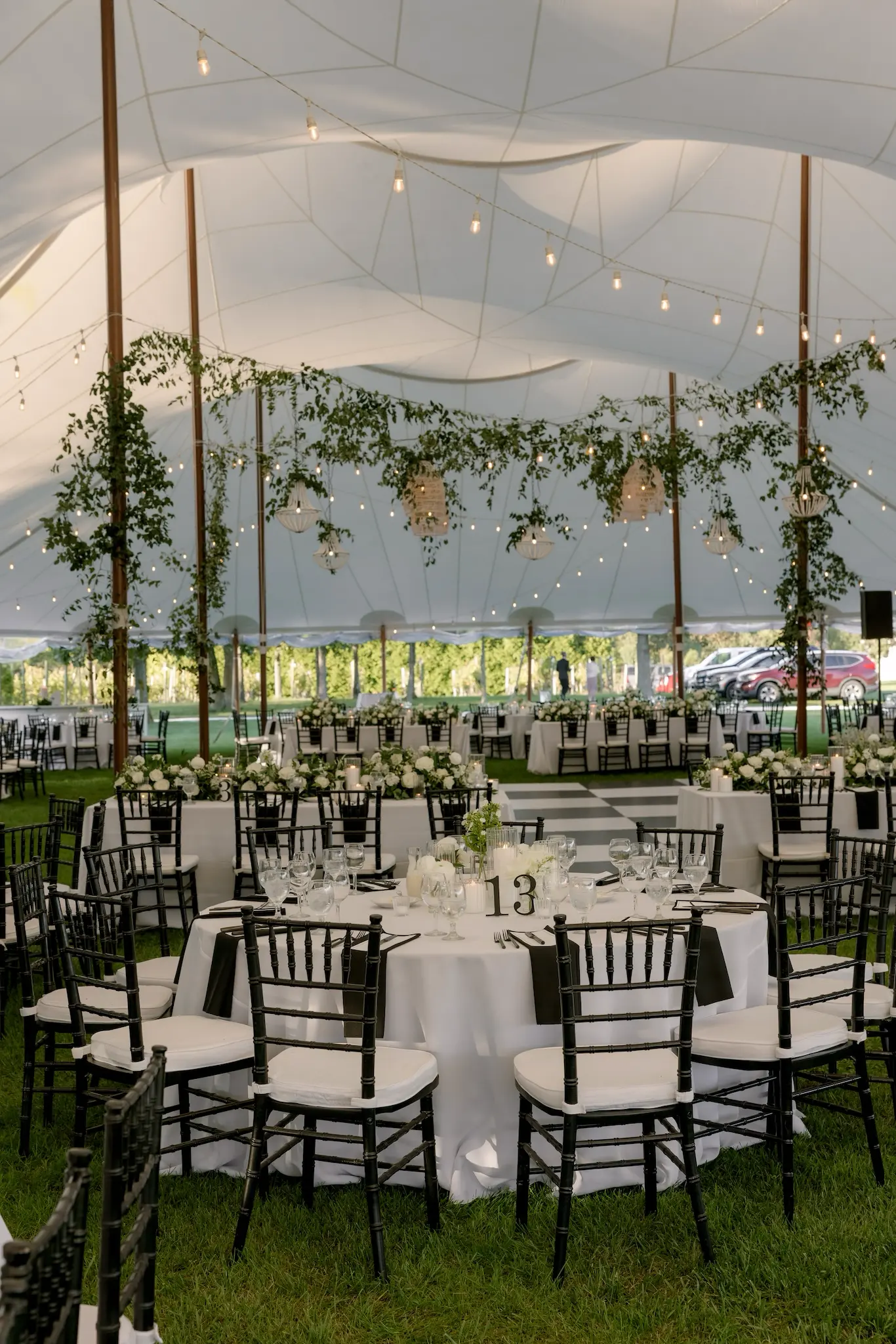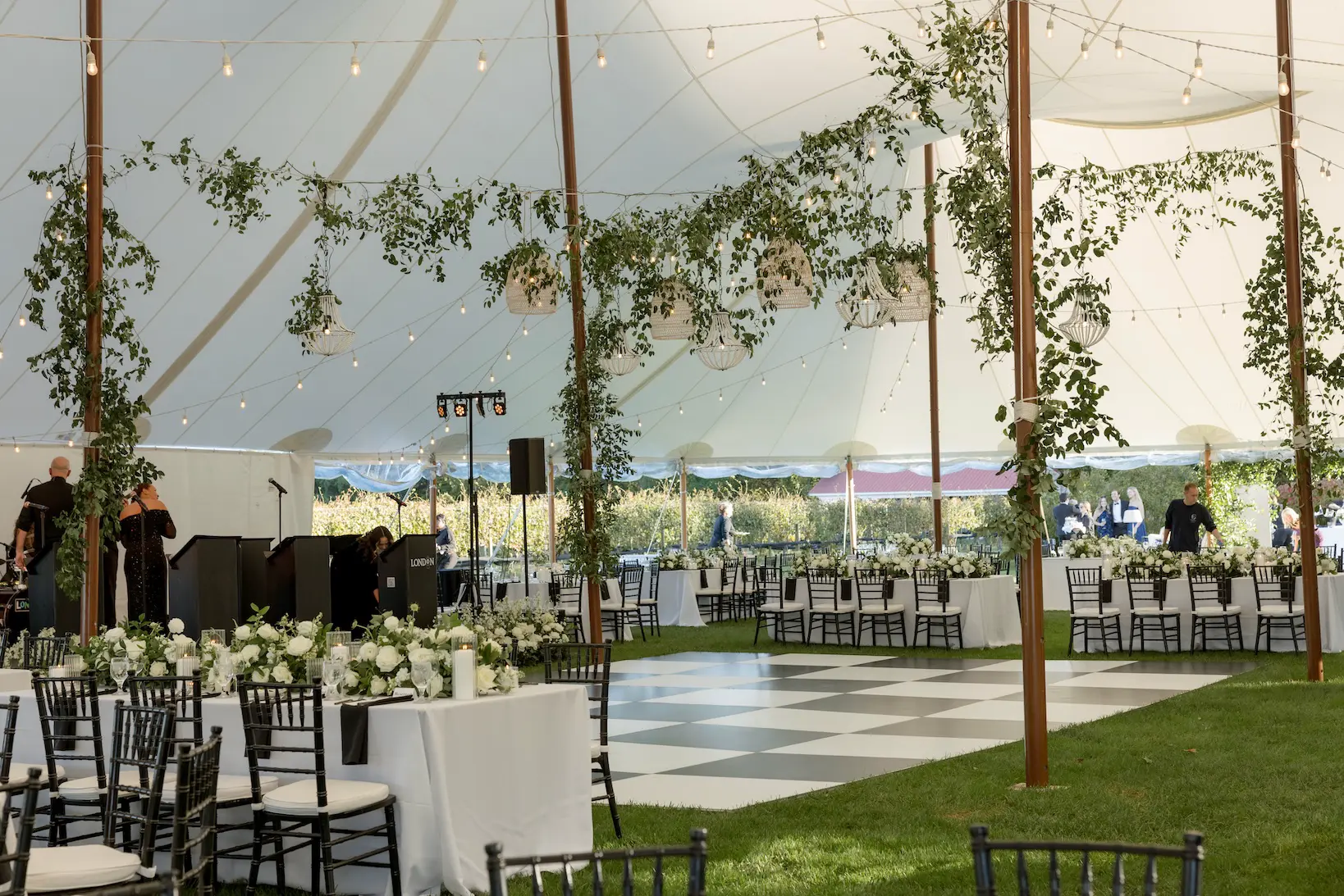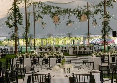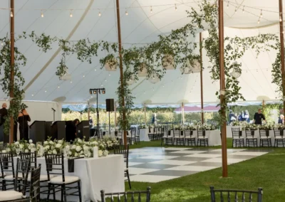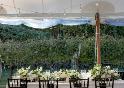 Inside the tent, the design featured a black and white dance floor, crisp white linens, black chiavari chairs, warm lighting, and lush greenery suspended above the reception space. The combination of vineyard views, candlelit tables, and natural textures gave the event a classic look without feeling overly formal.