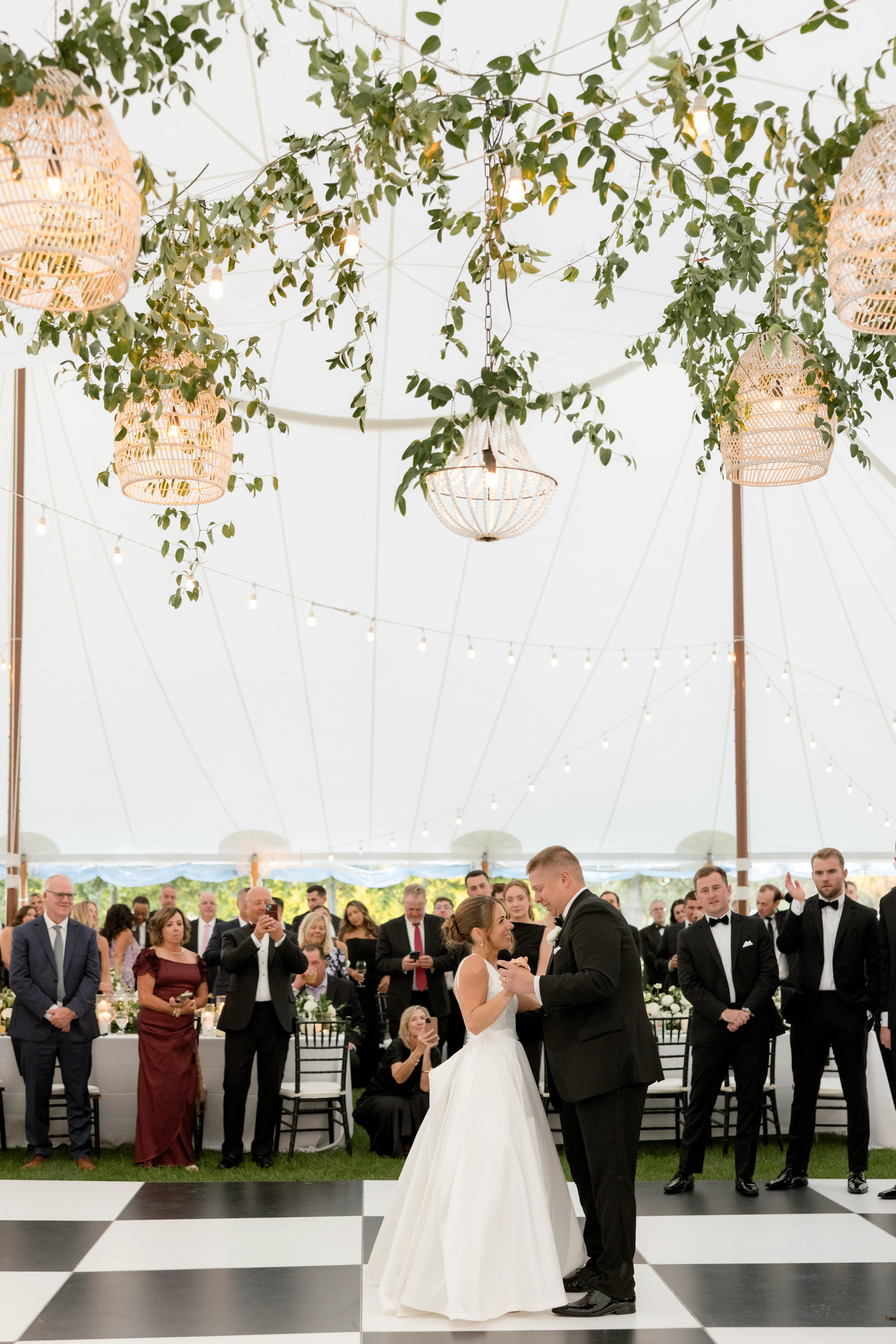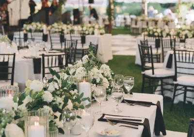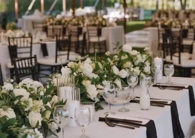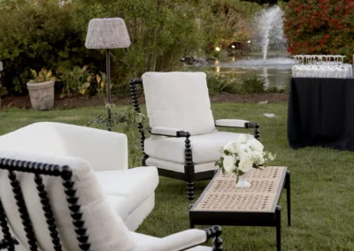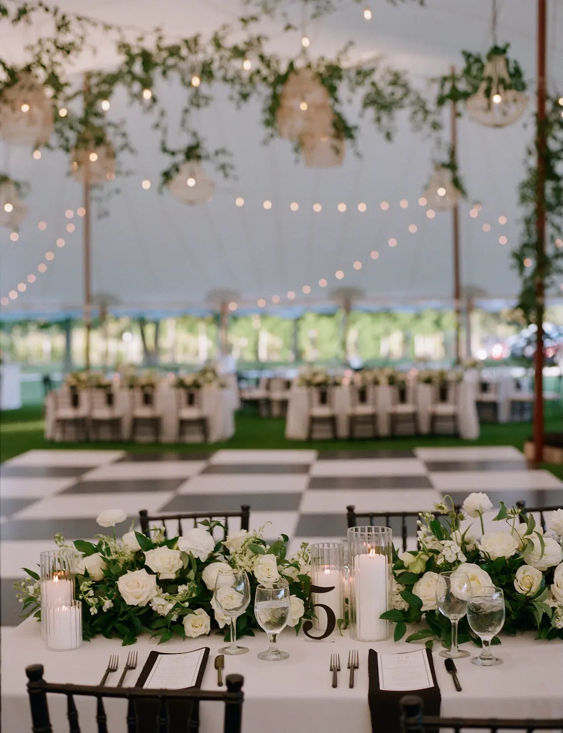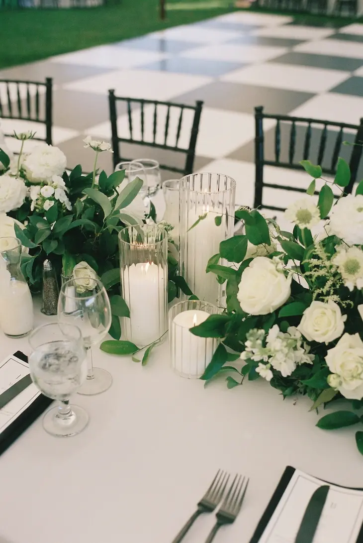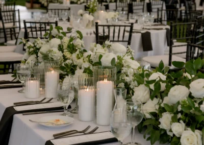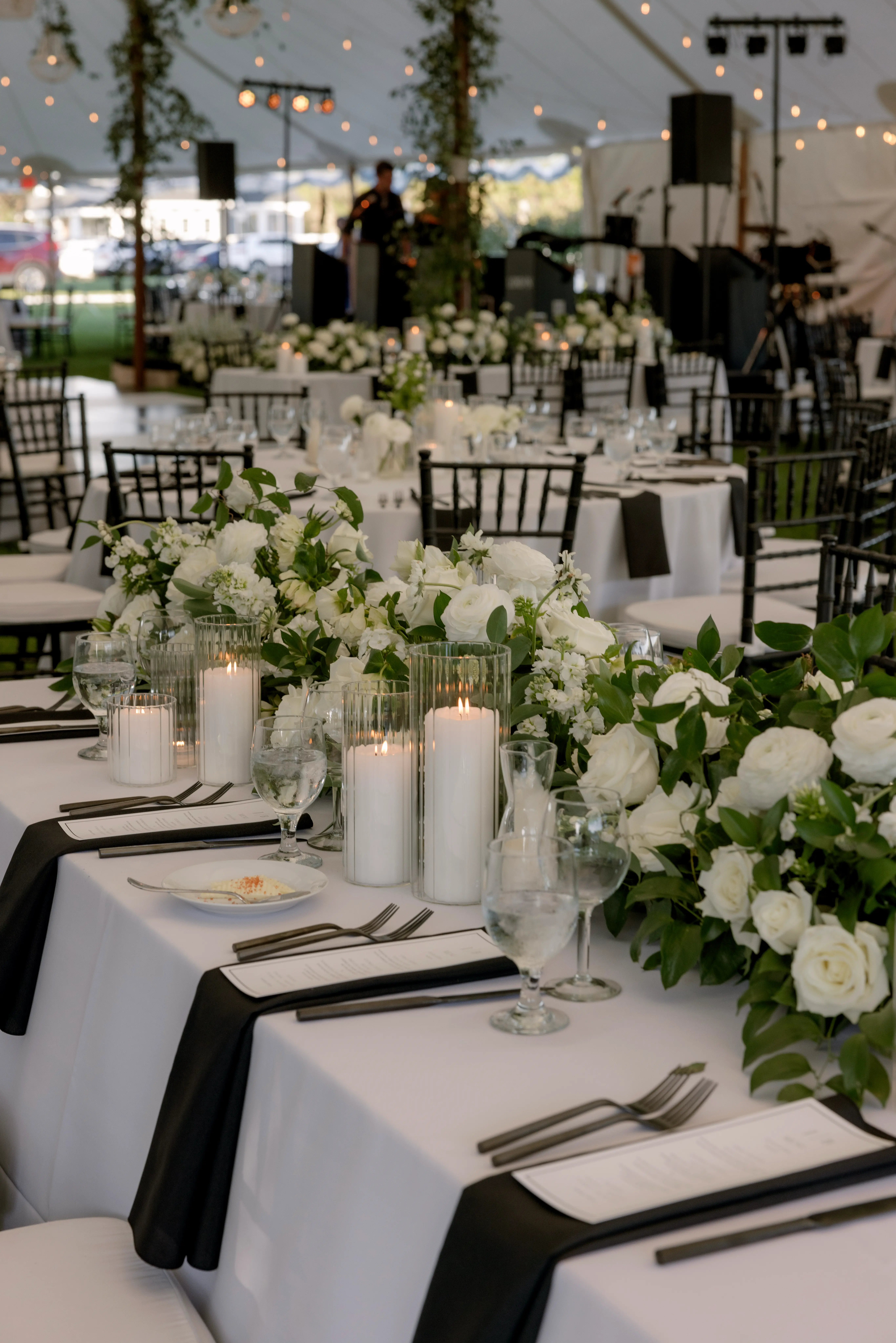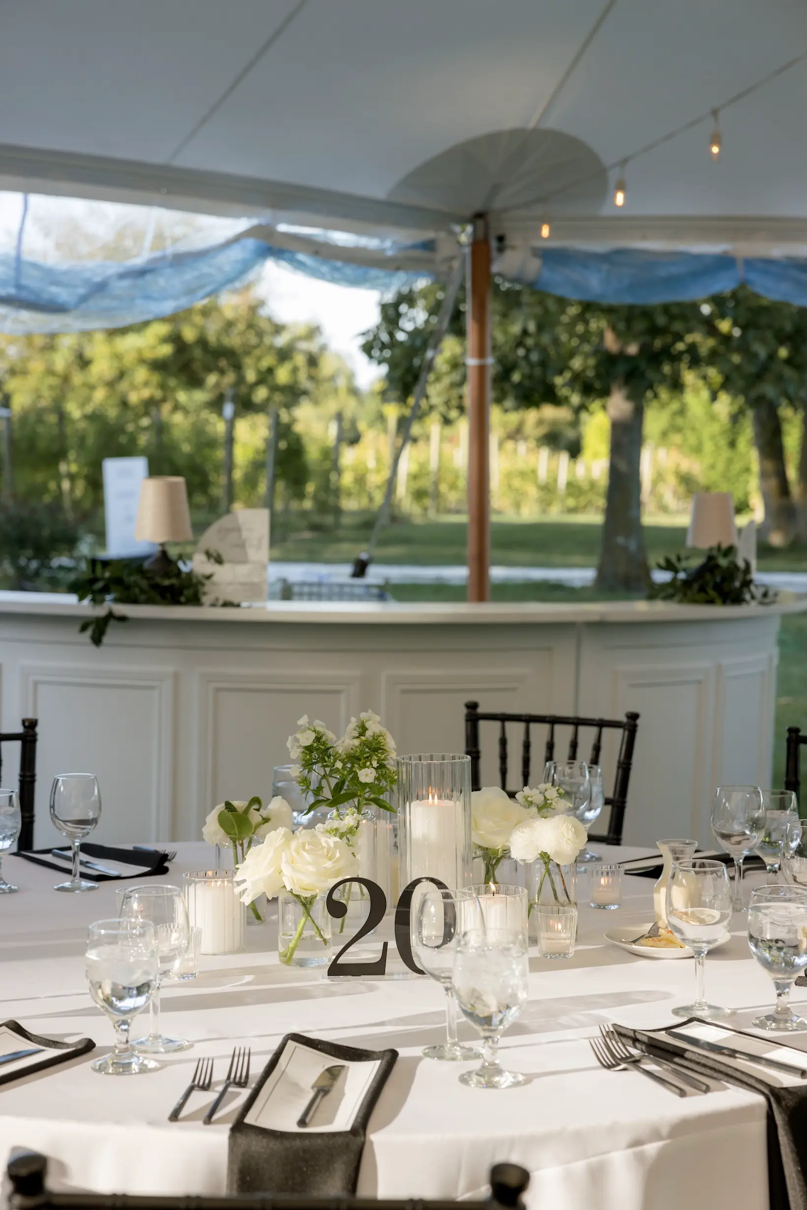 Inside the tent, the design featured a black and white dance floor, crisp white linens, black chiavari chairs, warm lighting, and lush greenery suspended above the reception space. The combination of vineyard views, candlelit tables, and natural textures gave the event a classic look without feeling overly formal.