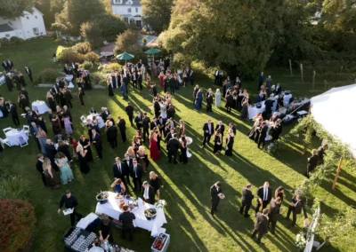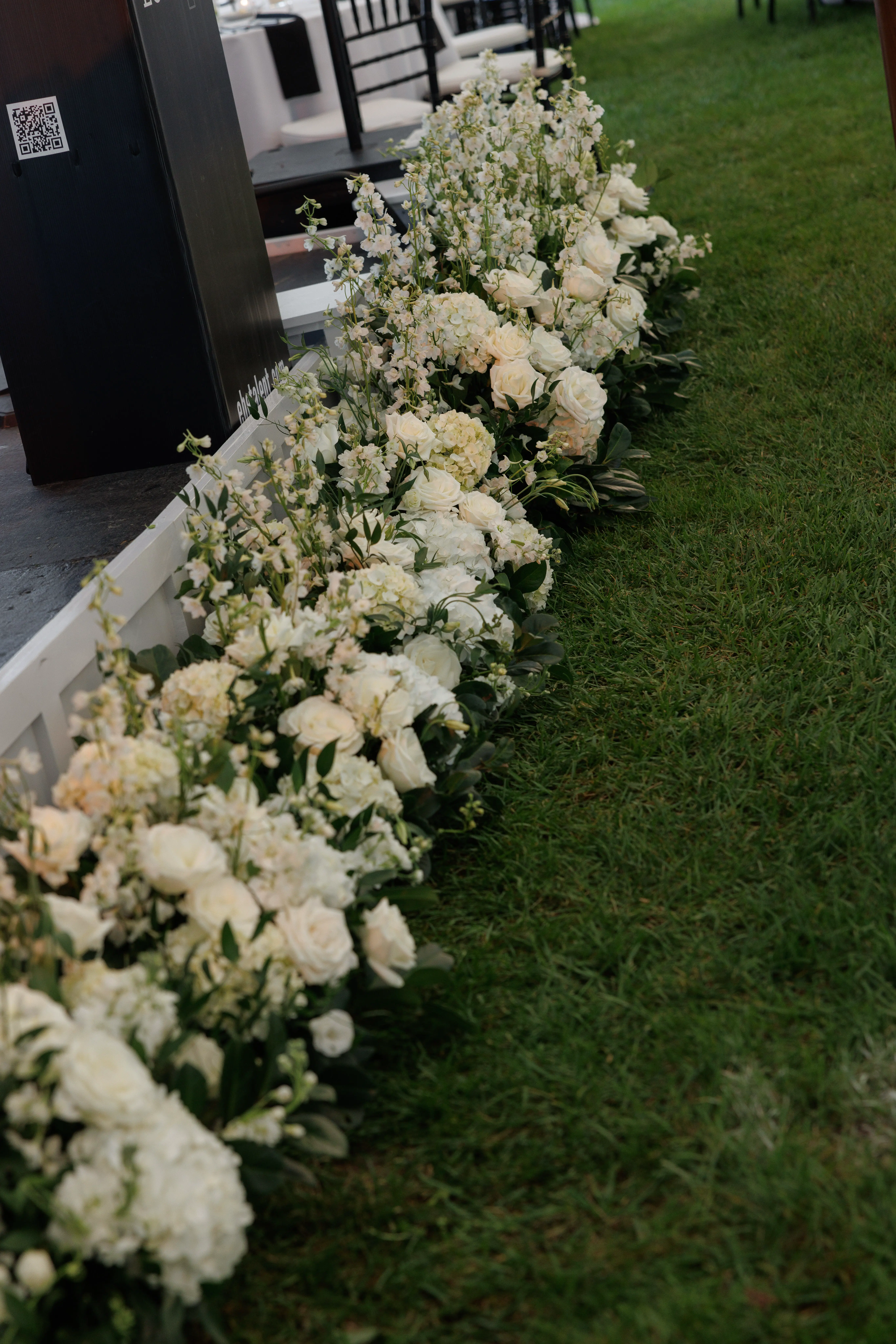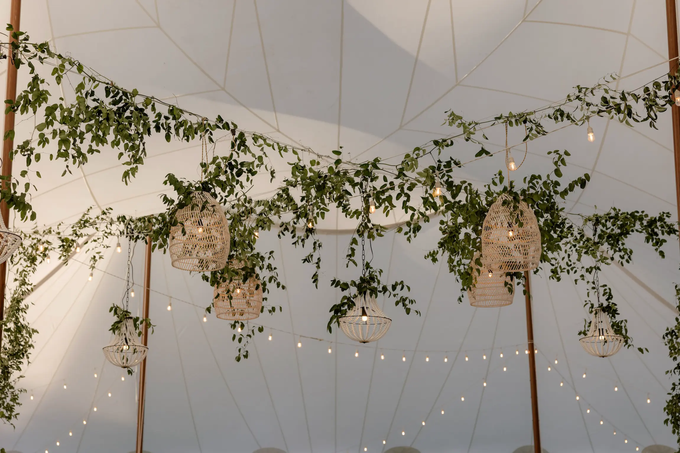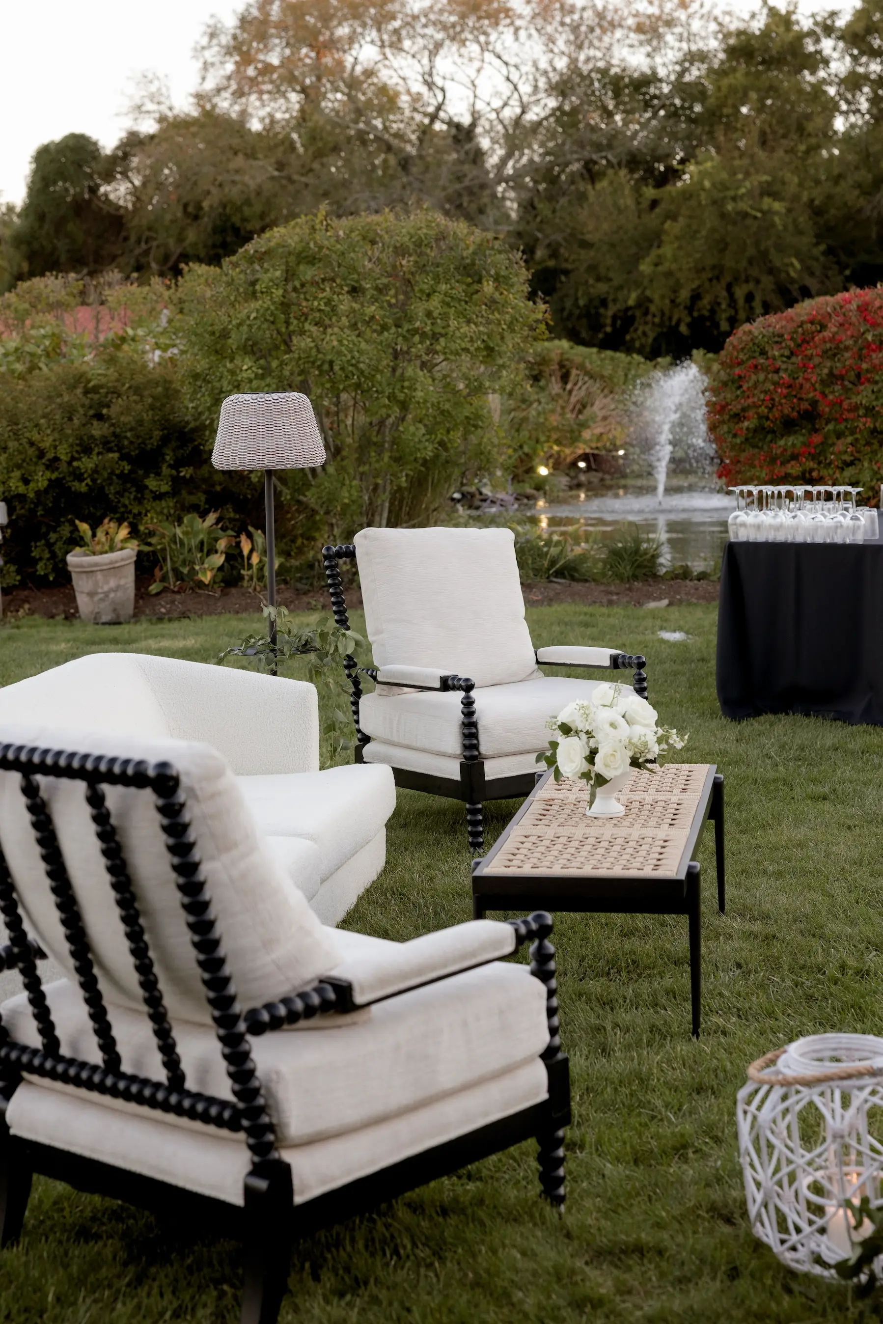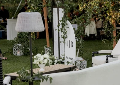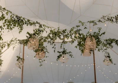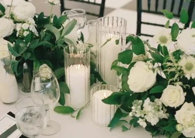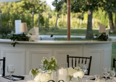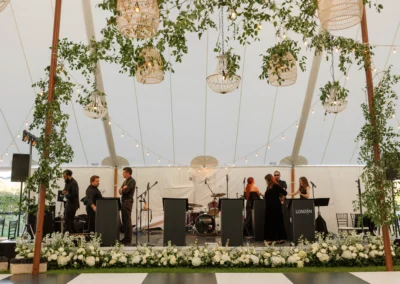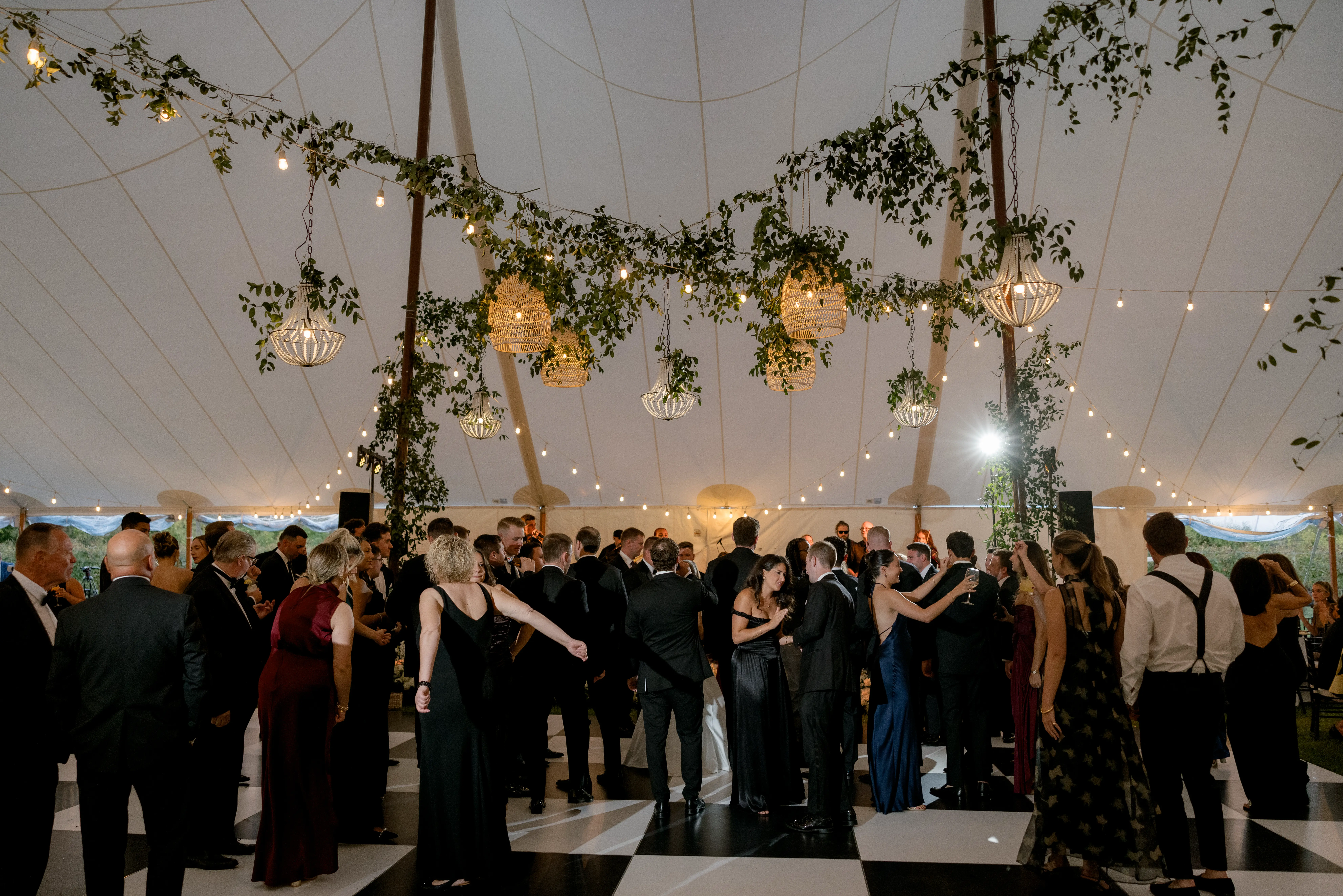 Inside the tent, the design featured a black and white dance floor, crisp white linens, black chiavari chairs, warm lighting, and lush greenery suspended above the reception space. The combination of vineyard views, candlelit tables, and natural textures gave the event a classic look without feeling overly formal.