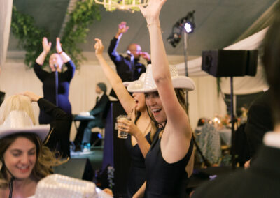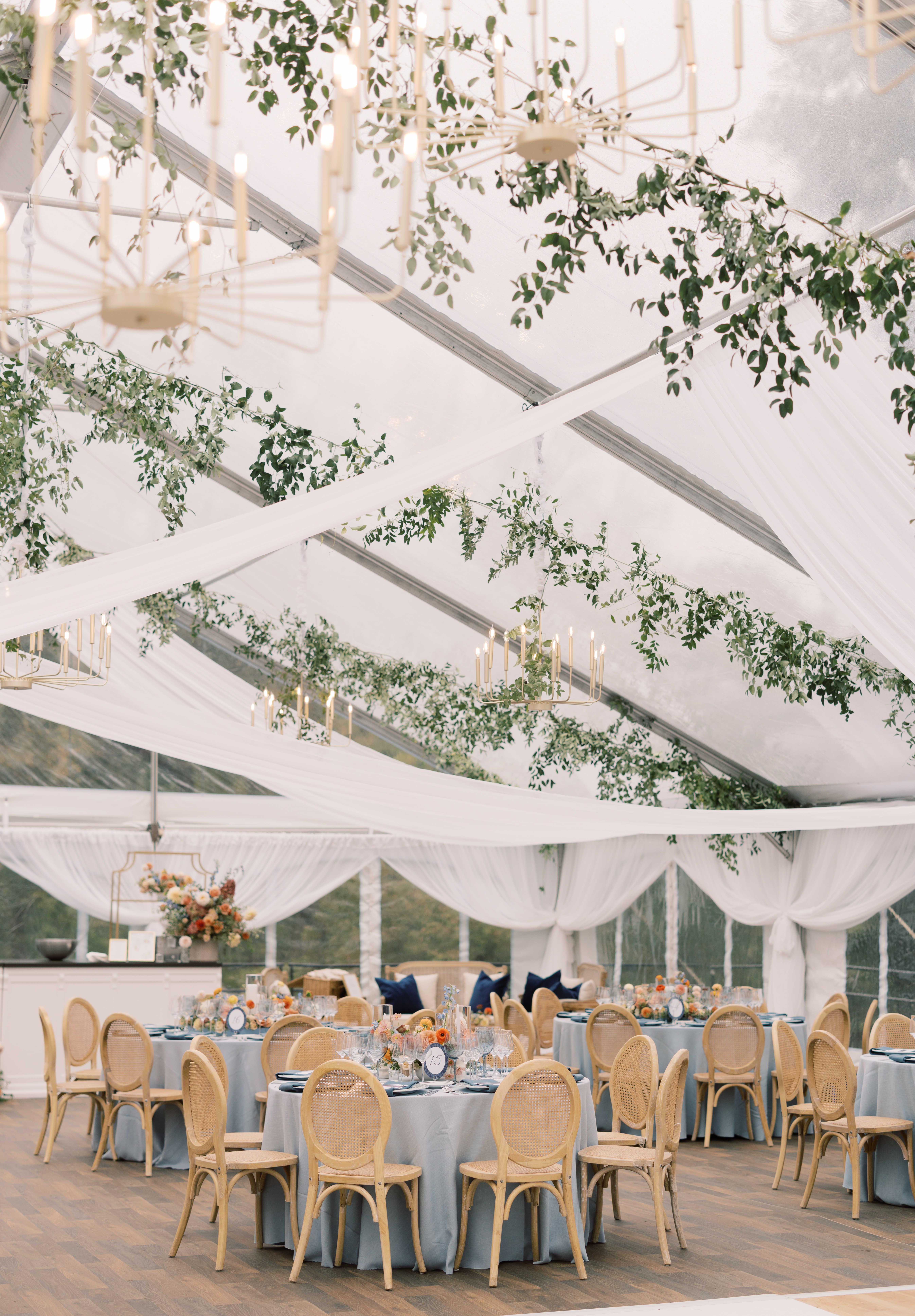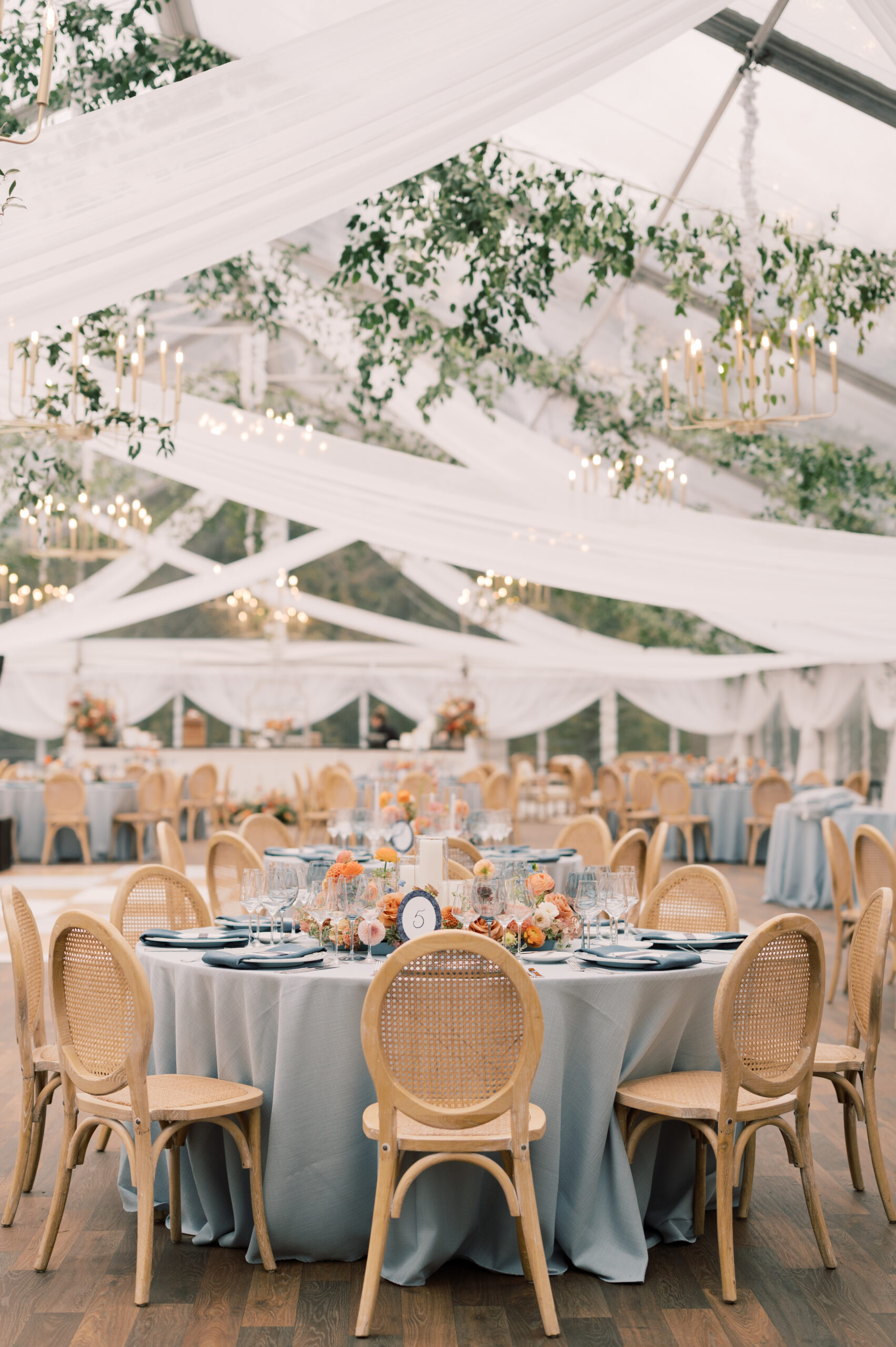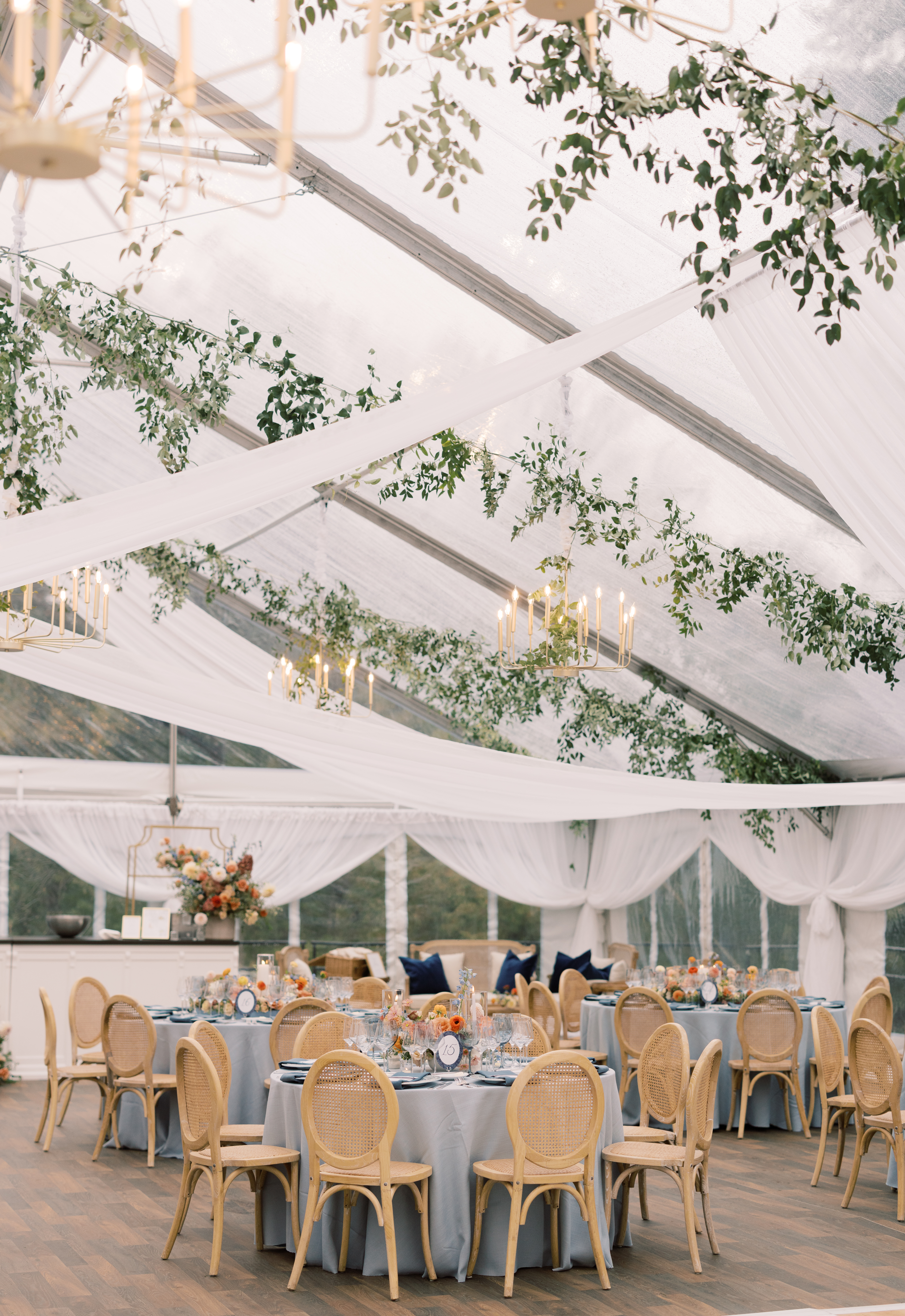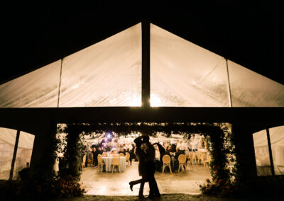 A clear top tent framed the surrounding trees and shifting sky, allowing natural light by day and a soft glow by night. Beneath it, elevated flooring with a vinyl hardwood overlay created a polished reception space that blended elegance with stability—proof that function and beauty can coexist effortlessly. Crossback ceremony chairs, classic tables, and discreet heating ensured guest comfort throughout the evening.