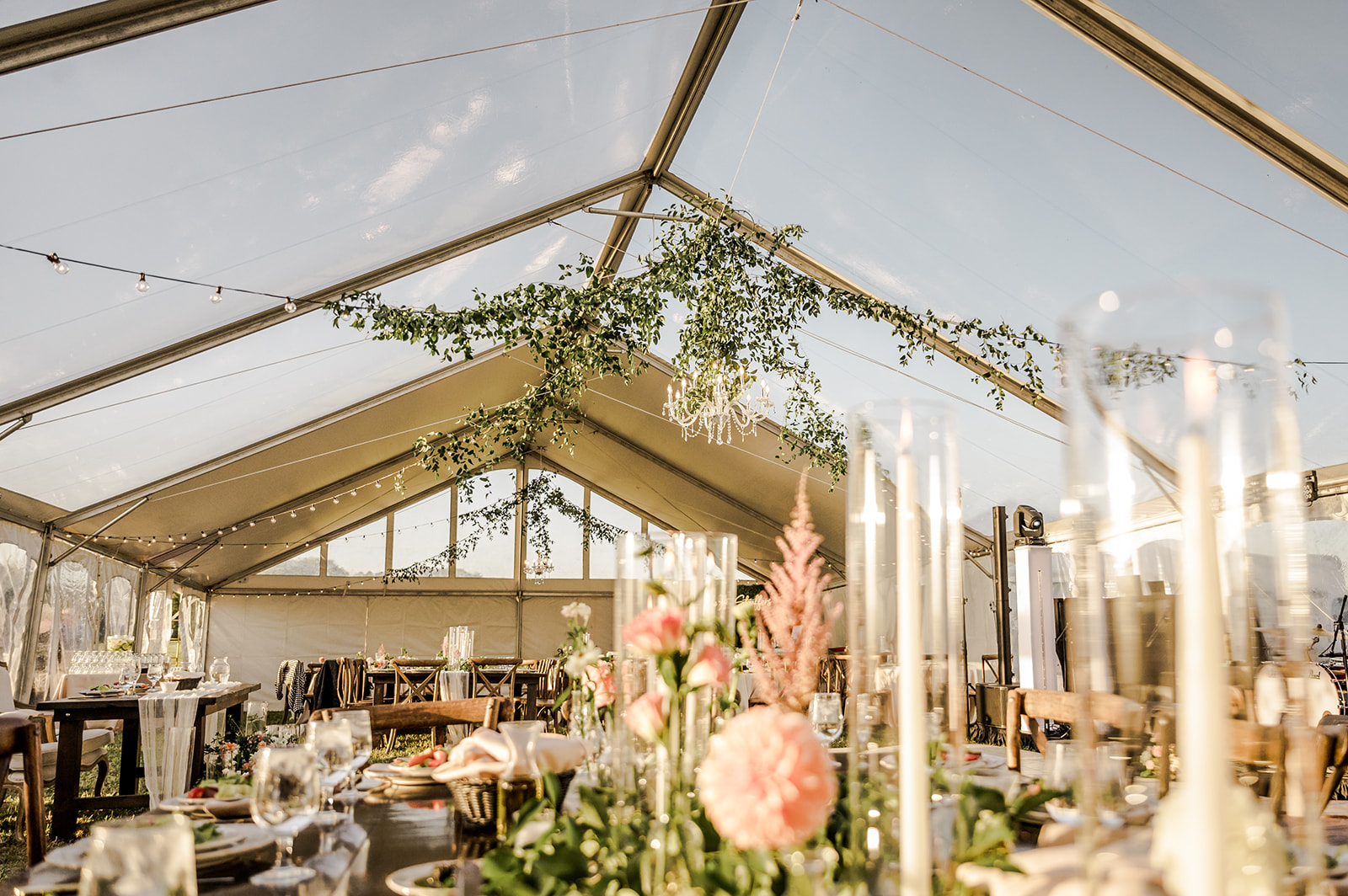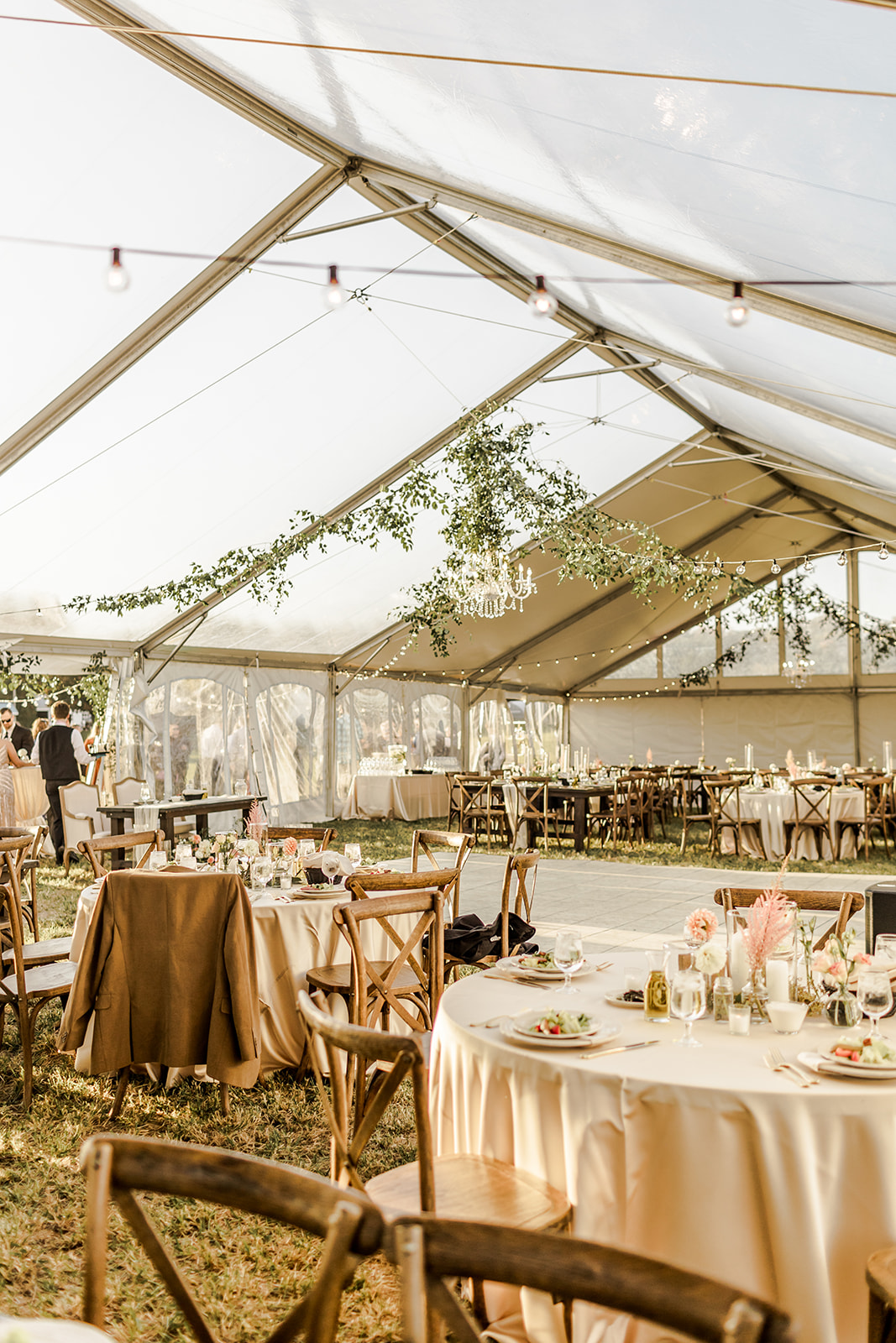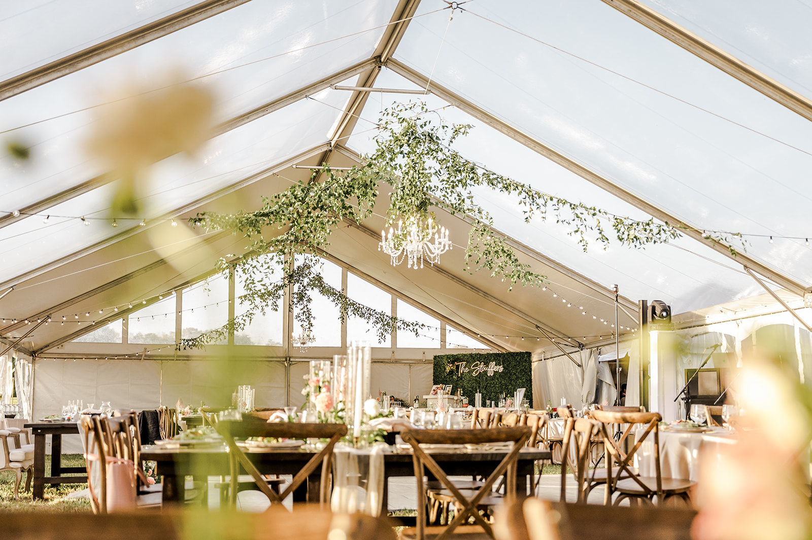 For this Maryland wedding, Collective Event Group provided the clear top tent, stage, and heating needed to create a comfortable reception space for guests. A clear top tent was the perfect choice for the season, allowing the couple to embrace the open-air feeling of an outdoor wedding while still giving the celebration structure, coverage, and warmth.