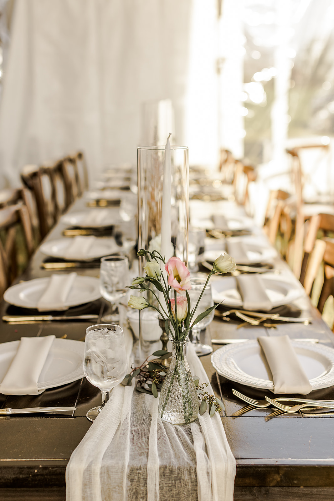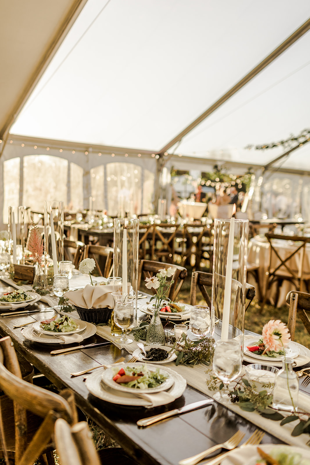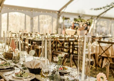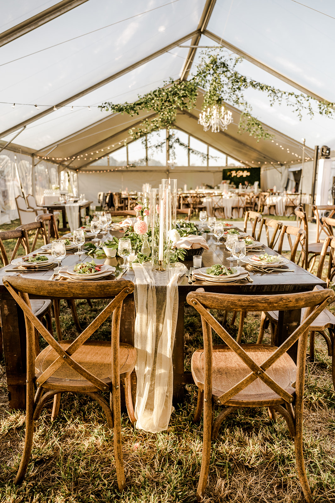 For this Maryland wedding, Collective Event Group provided the clear top tent, stage, and heating needed to create a comfortable reception space for guests. A clear top tent was the perfect choice for the season, allowing the couple to embrace the open-air feeling of an outdoor wedding while still giving the celebration structure, coverage, and warmth.
