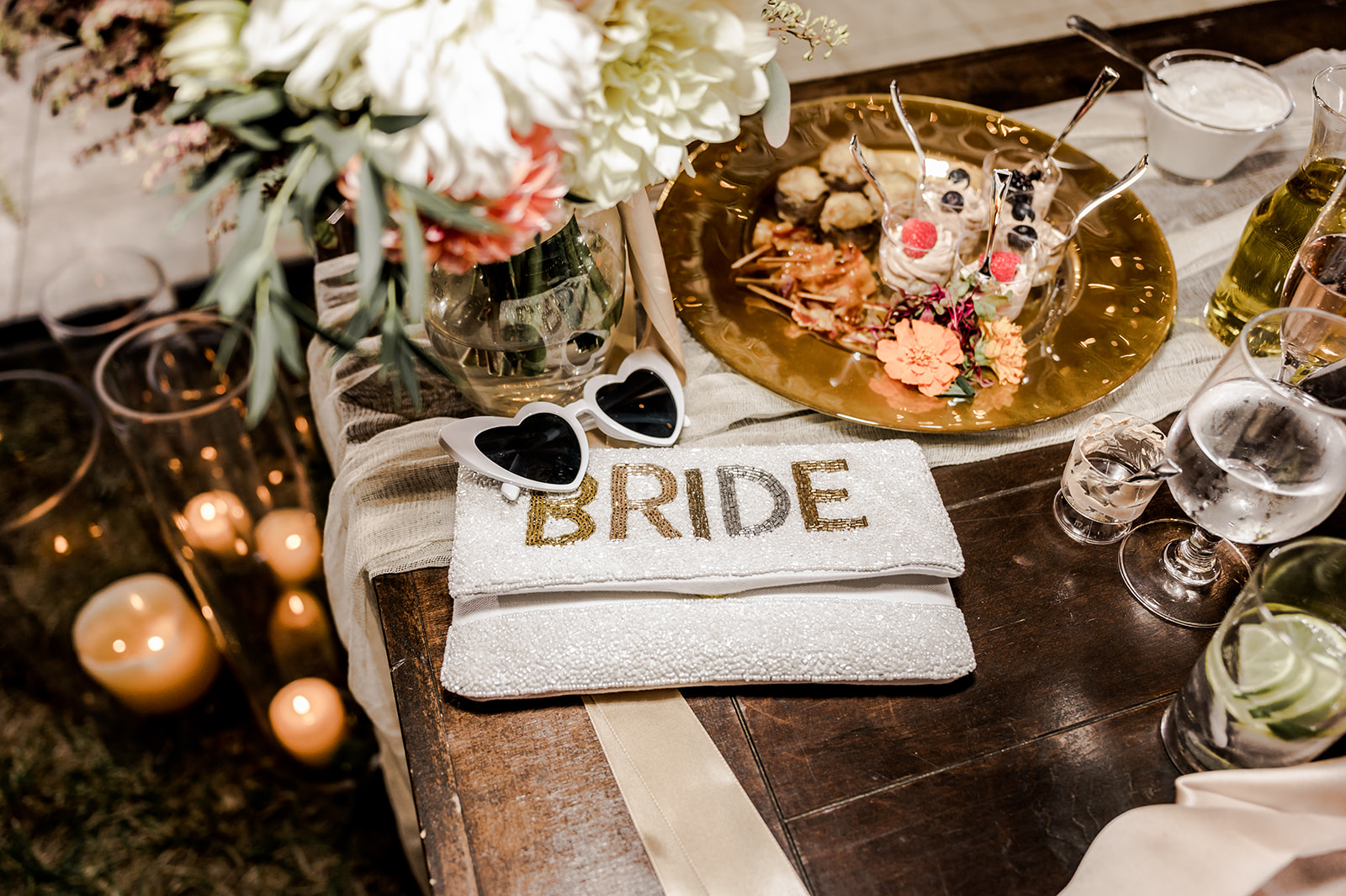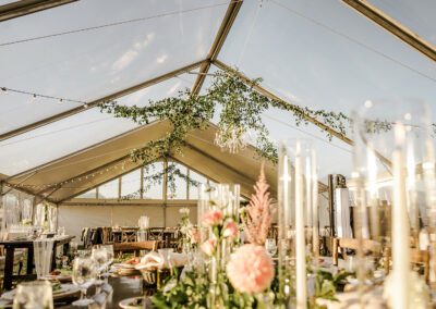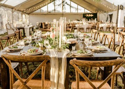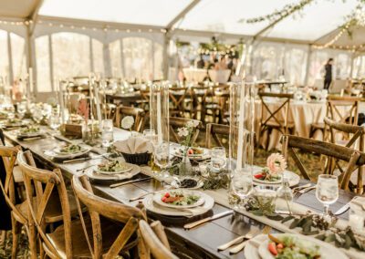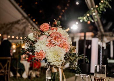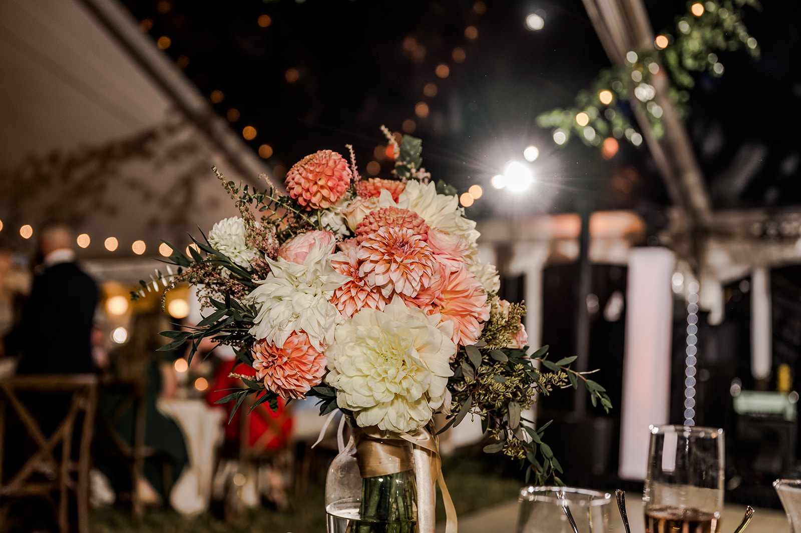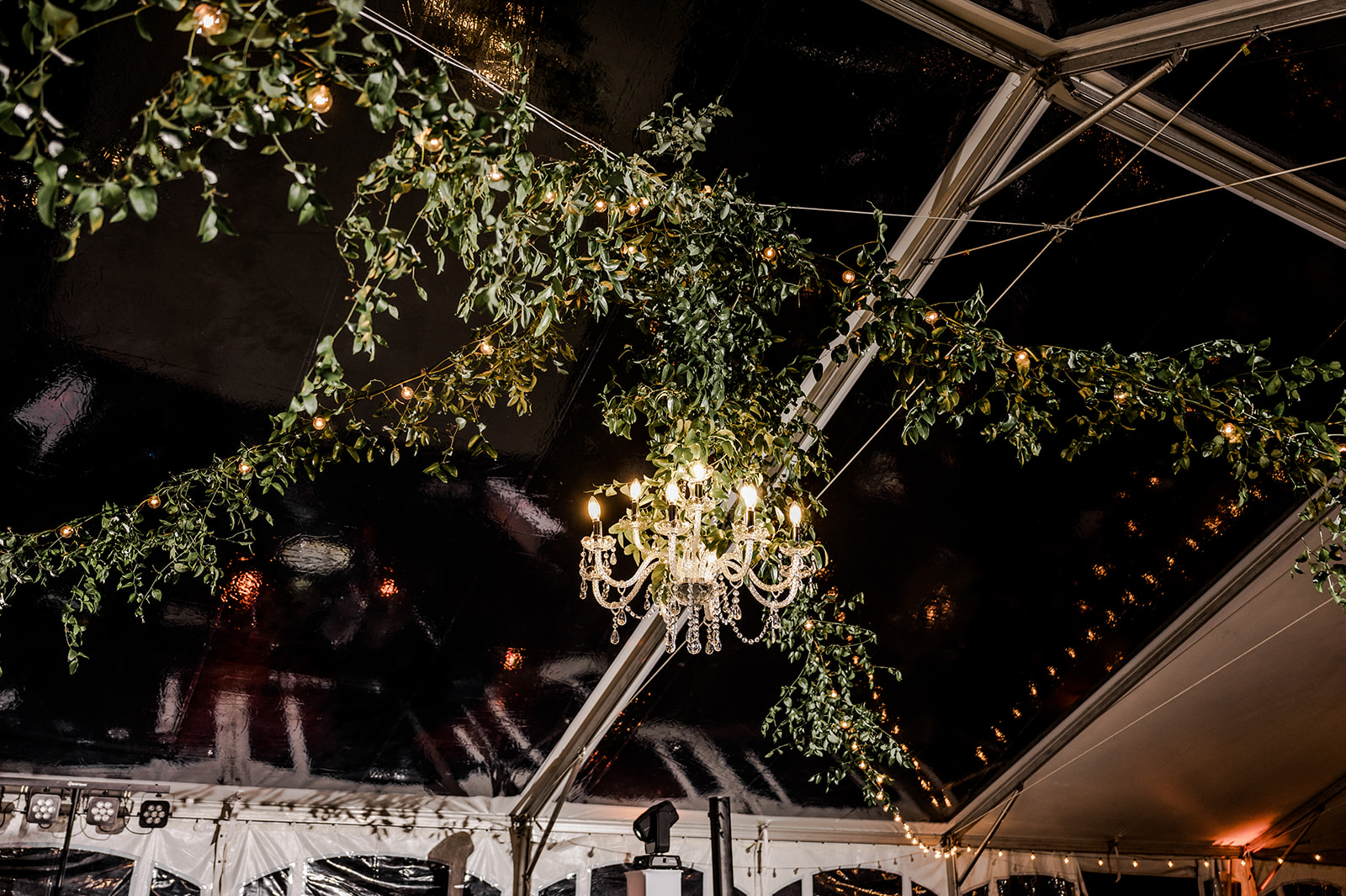 The reception design balanced natural surroundings with polished wedding details. Greenery installations, soft lighting, floral accents, and a clear tent ceiling created a romantic atmosphere that felt connected to the property. As the evening continued, the tent allowed guests to enjoy the beauty of the outdoor setting while staying protected from cooler late-October temperatures.