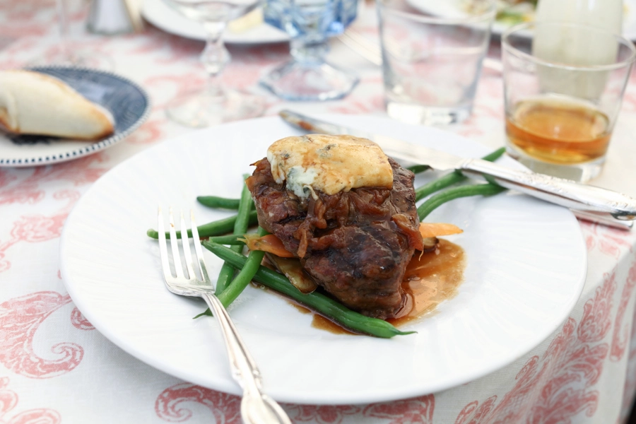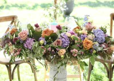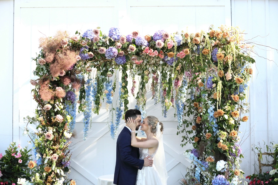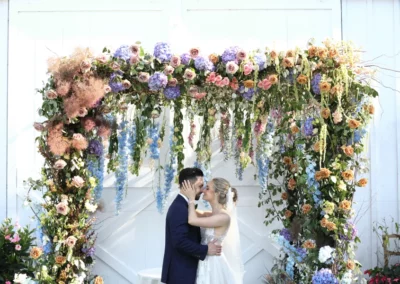 The overall design leaned into the garden party theme with lush florals, greenery, a floral wedding ceremony arbor, and layered reception details throughout the tent. The birch dance floor added a natural texture that worked beautifully with the vineyard surroundings, while the crossback chairs gave the reception a warm, timeless look.