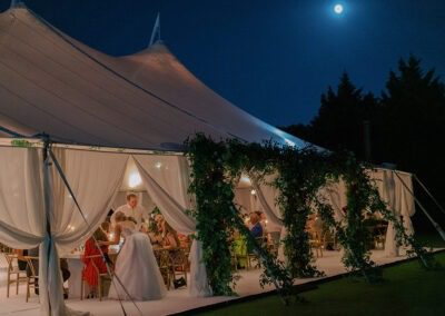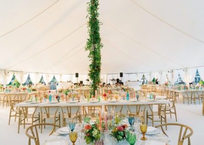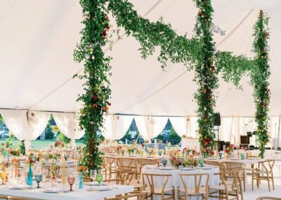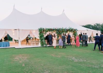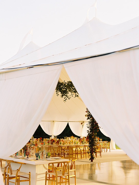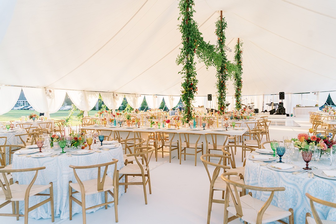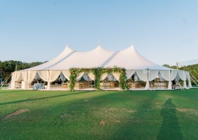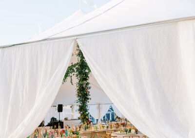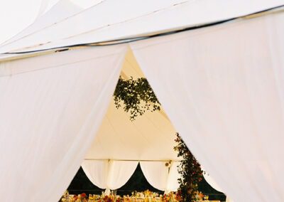 This sailcloth wedding at Kings Creek Country Club in Rehoboth Beach, Delaware blended coastal elegance with warm natural textures. Our team installed a classic sailcloth tent overlooking the golf course, creating an open-air reception space that felt both refined and relaxed.