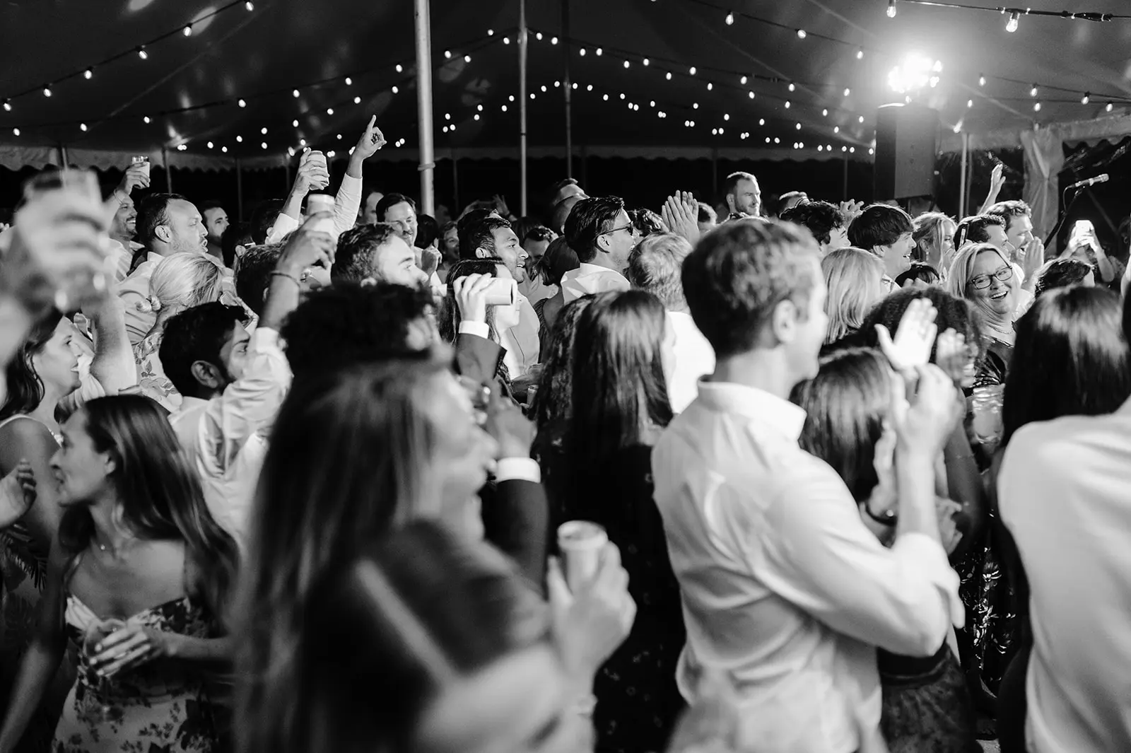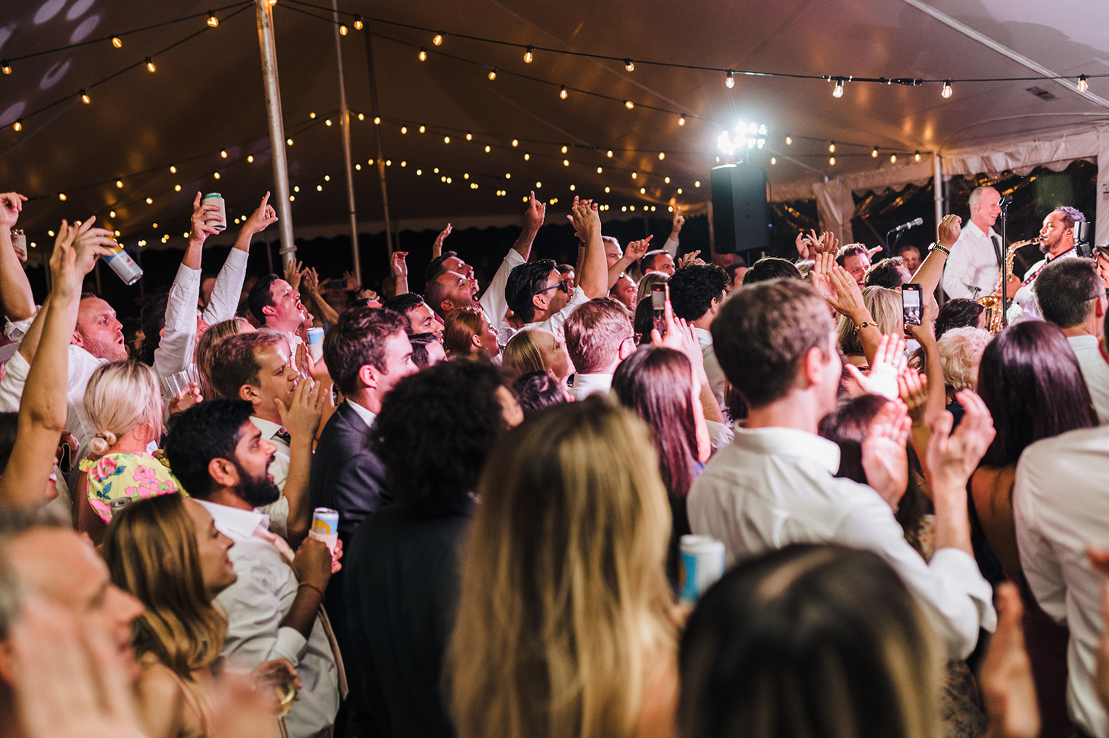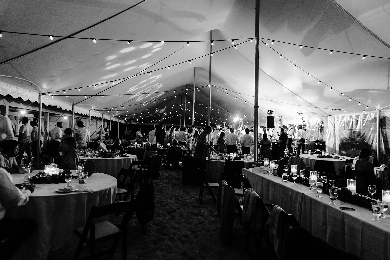 Delaware Beach Wedding by Collective Event Group showcasing a Pole Tent with Bistro Lighting and farmhouse tables.