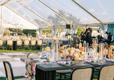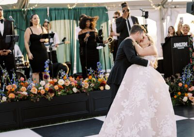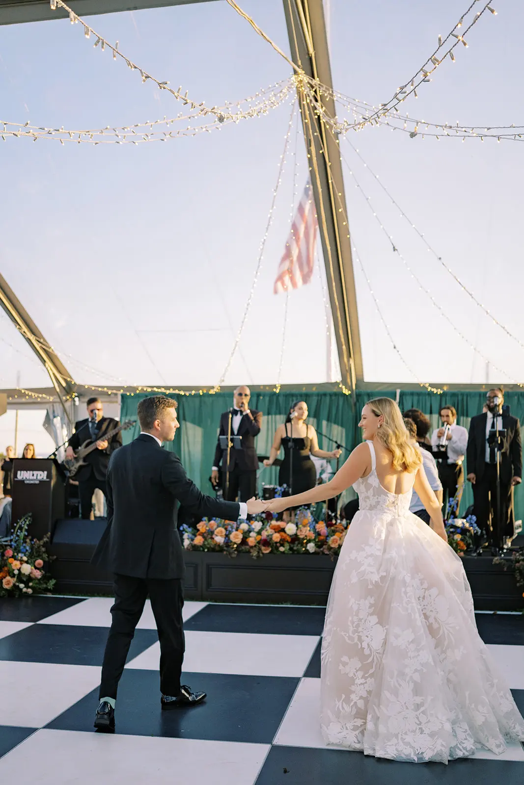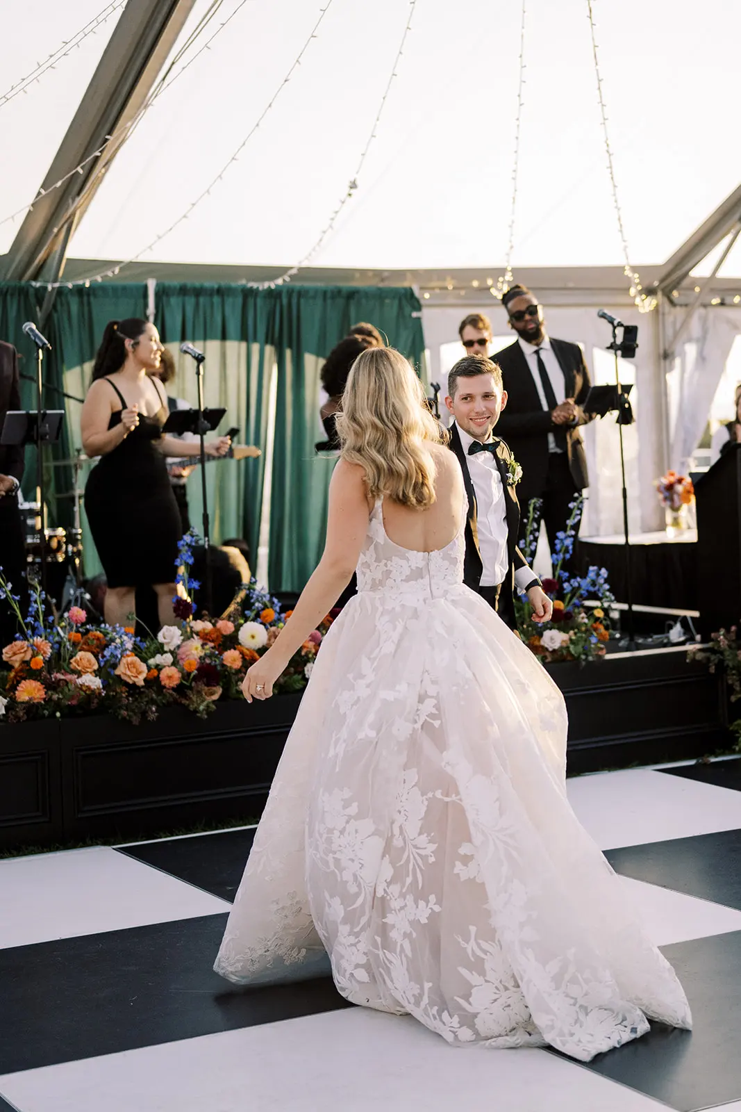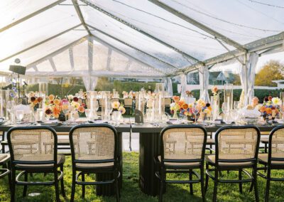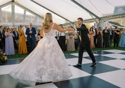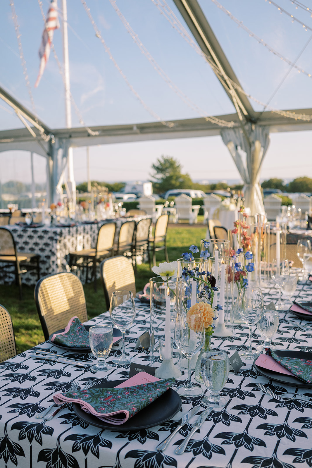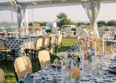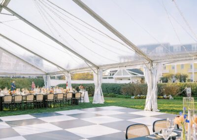 The design blended refined wedding details with a light, summery atmosphere. Draped twinkle lighting added warmth overhead, while the black and white dance floor gave the reception a bold focal point. Together, these rental elements helped create a polished tented wedding that felt sophisticated without losing the relaxed charm of a Cape May celebration.