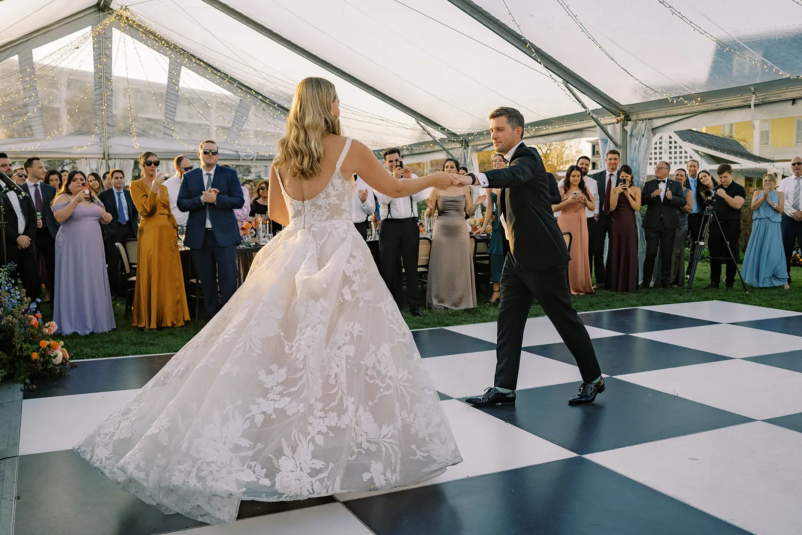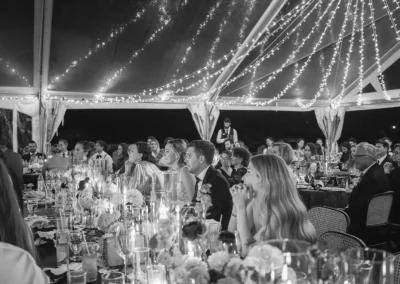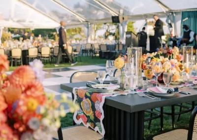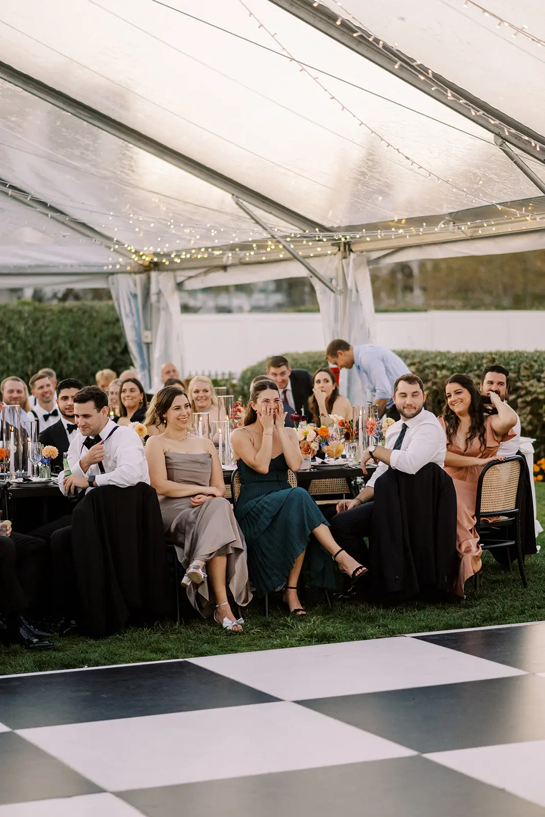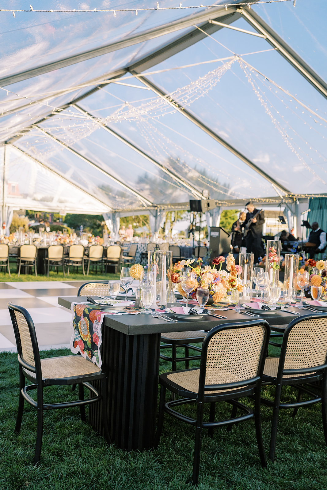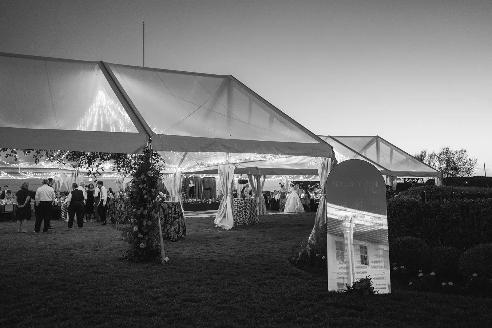 The design blended refined wedding details with a light, summery atmosphere. Draped twinkle lighting added warmth overhead, while the black and white dance floor gave the reception a bold focal point. Together, these rental elements helped create a polished tented wedding that felt sophisticated without losing the relaxed charm of a Cape May celebration.