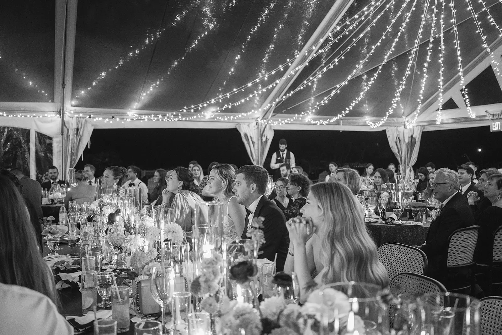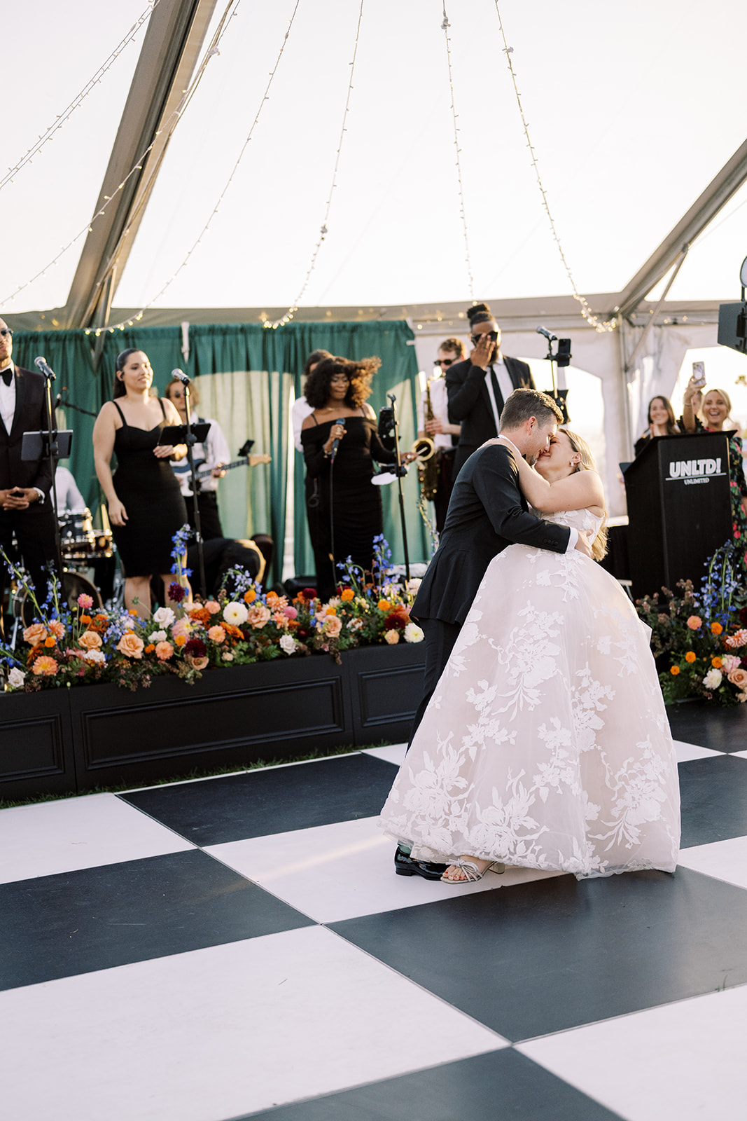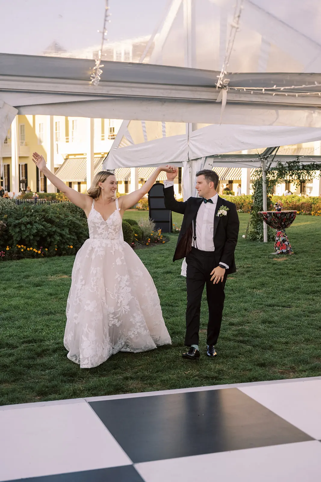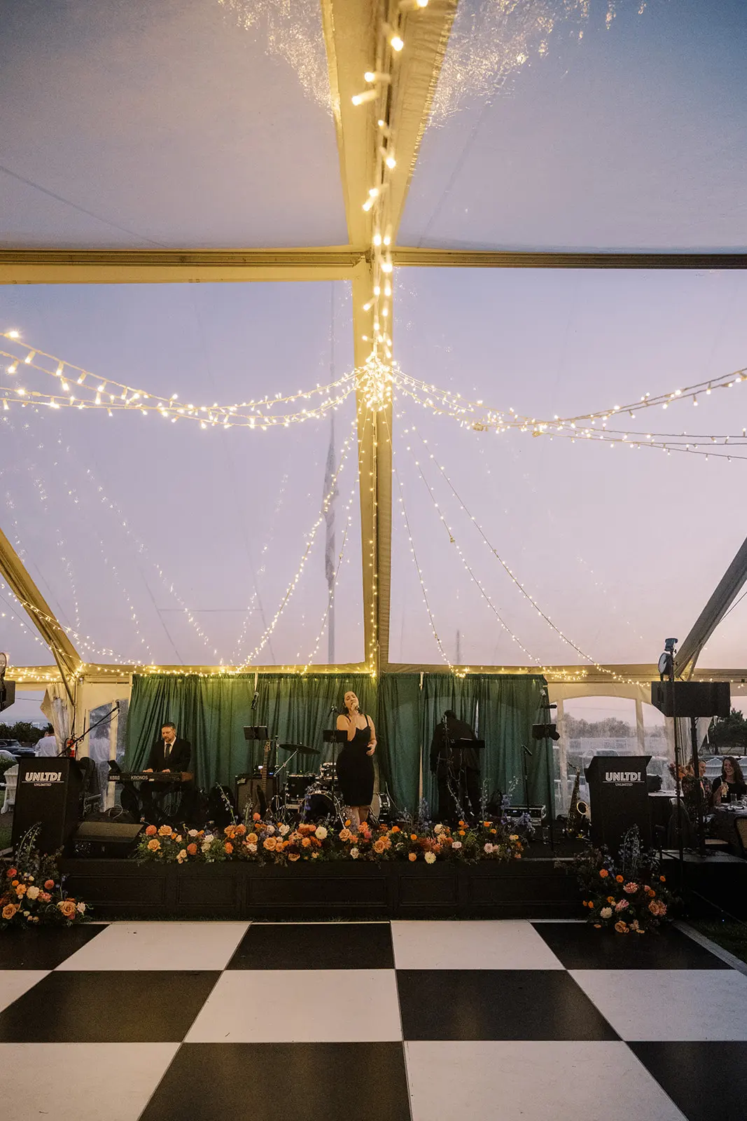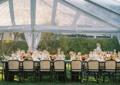 The design blended refined wedding details with a light, summery atmosphere. Draped twinkle lighting added warmth overhead, while the black and white dance floor gave the reception a bold focal point. Together, these rental elements helped create a polished tented wedding that felt sophisticated without losing the relaxed charm of a Cape May celebration.