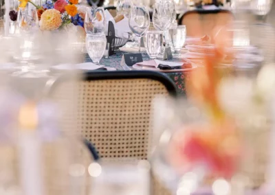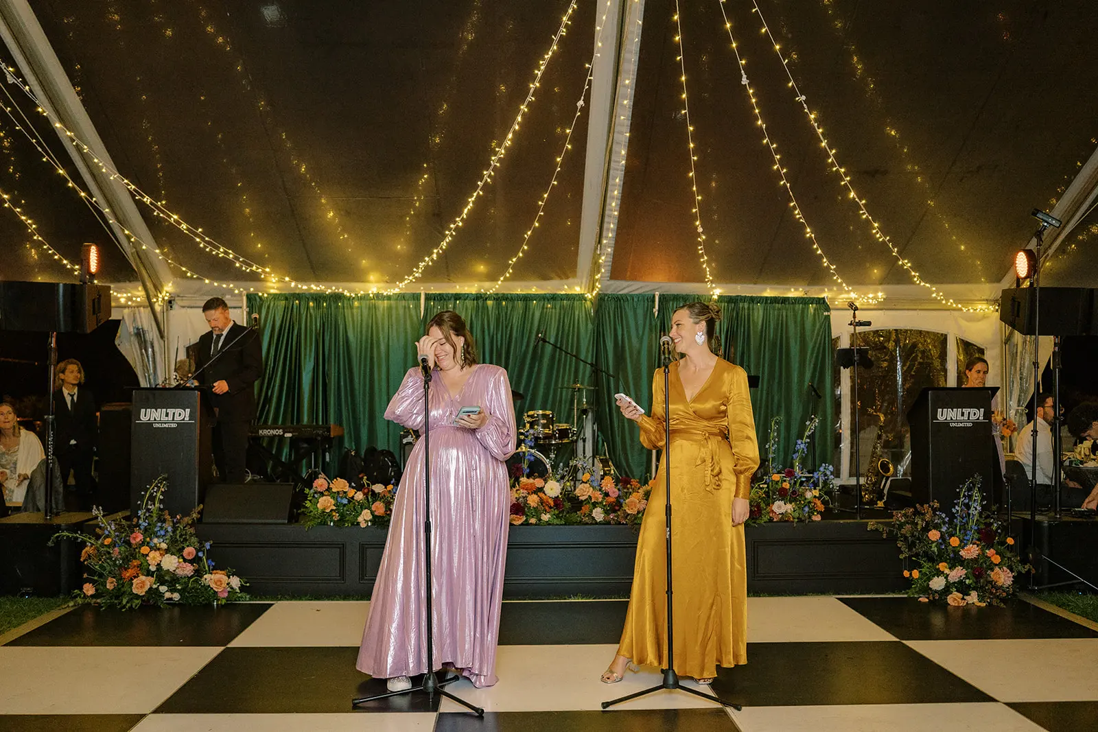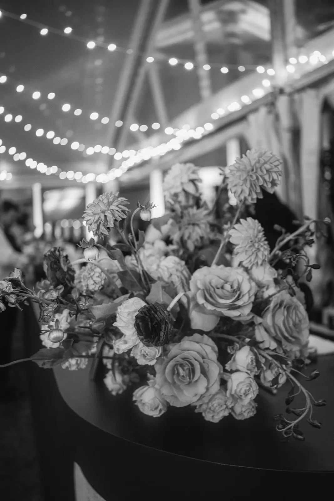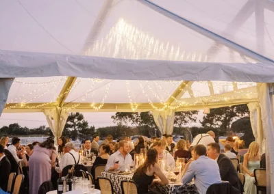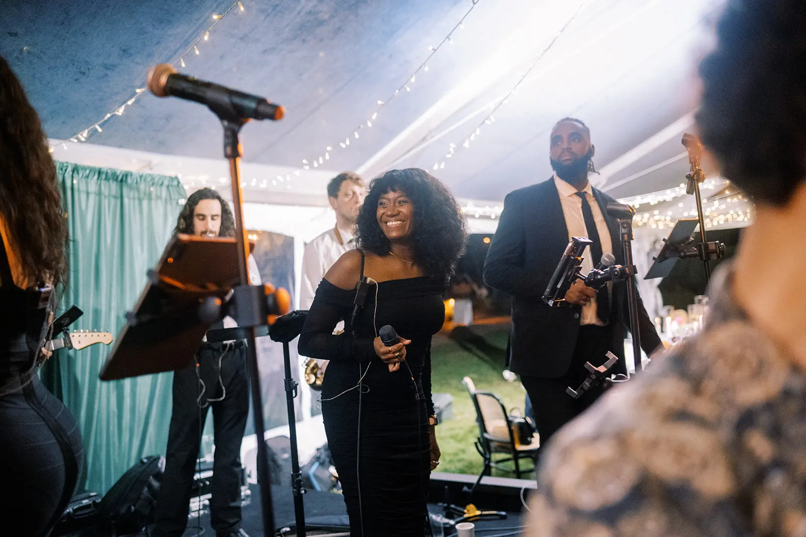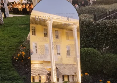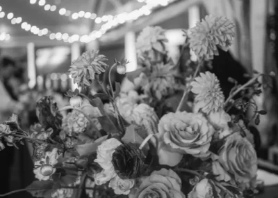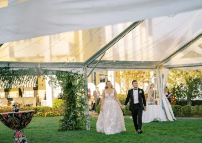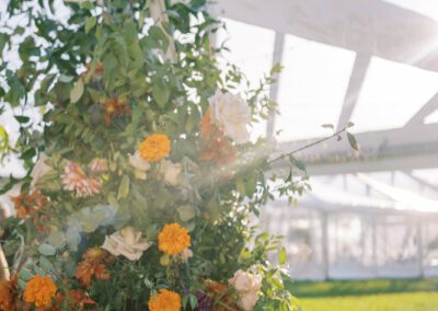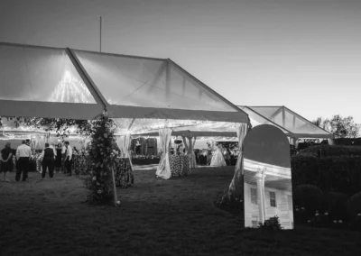 The design blended refined wedding details with a light, summery atmosphere. Draped twinkle lighting added warmth overhead, while the black and white dance floor gave the reception a bold focal point. Together, these rental elements helped create a polished tented wedding that felt sophisticated without losing the relaxed charm of a Cape May celebration.