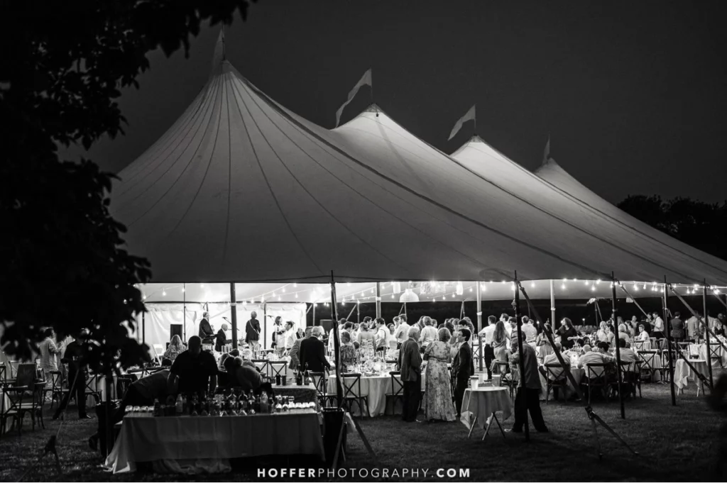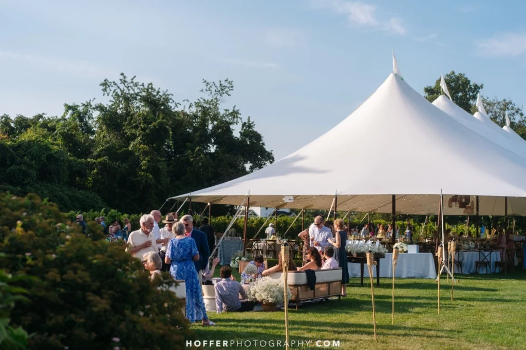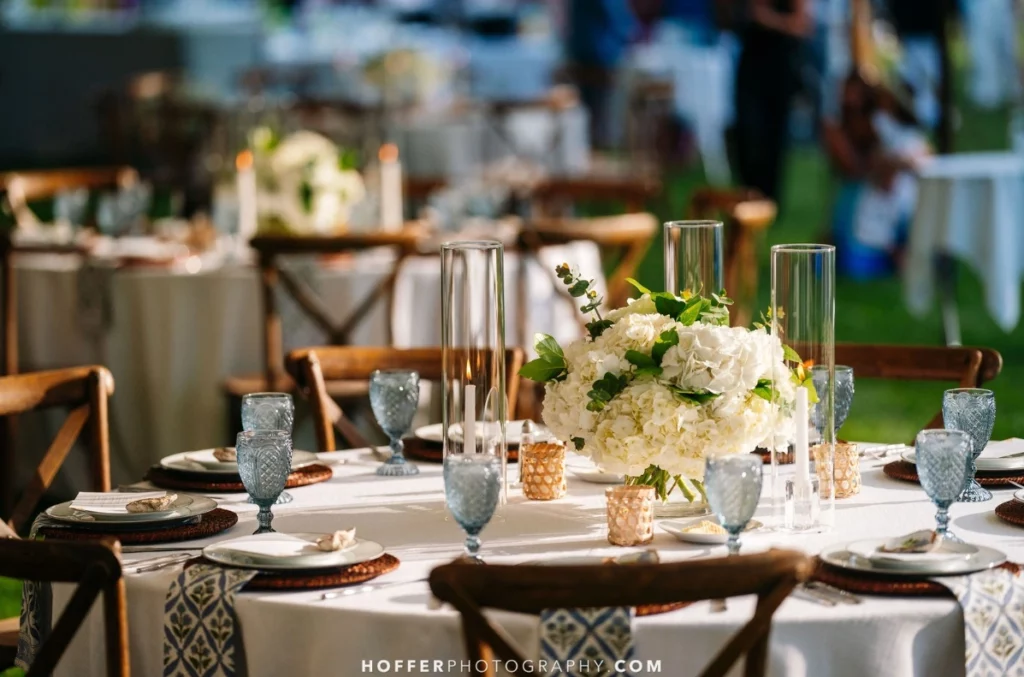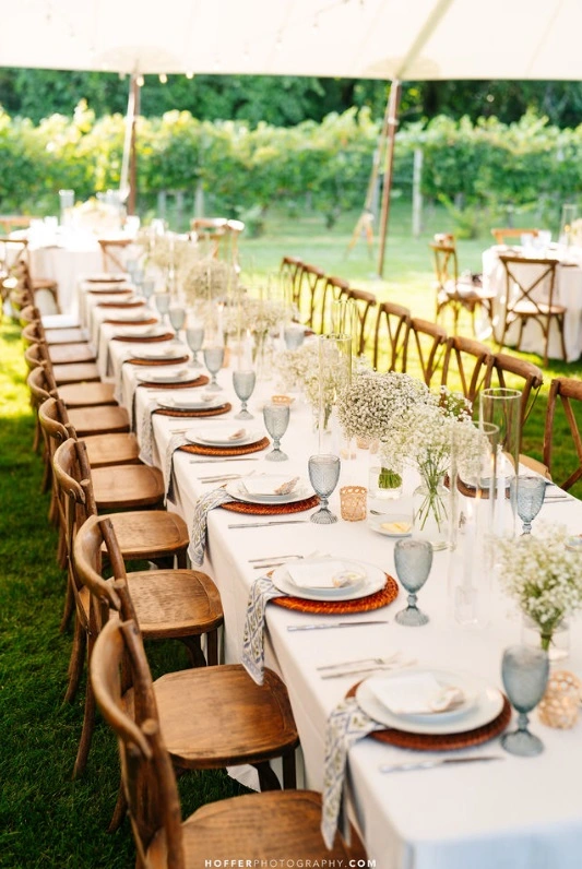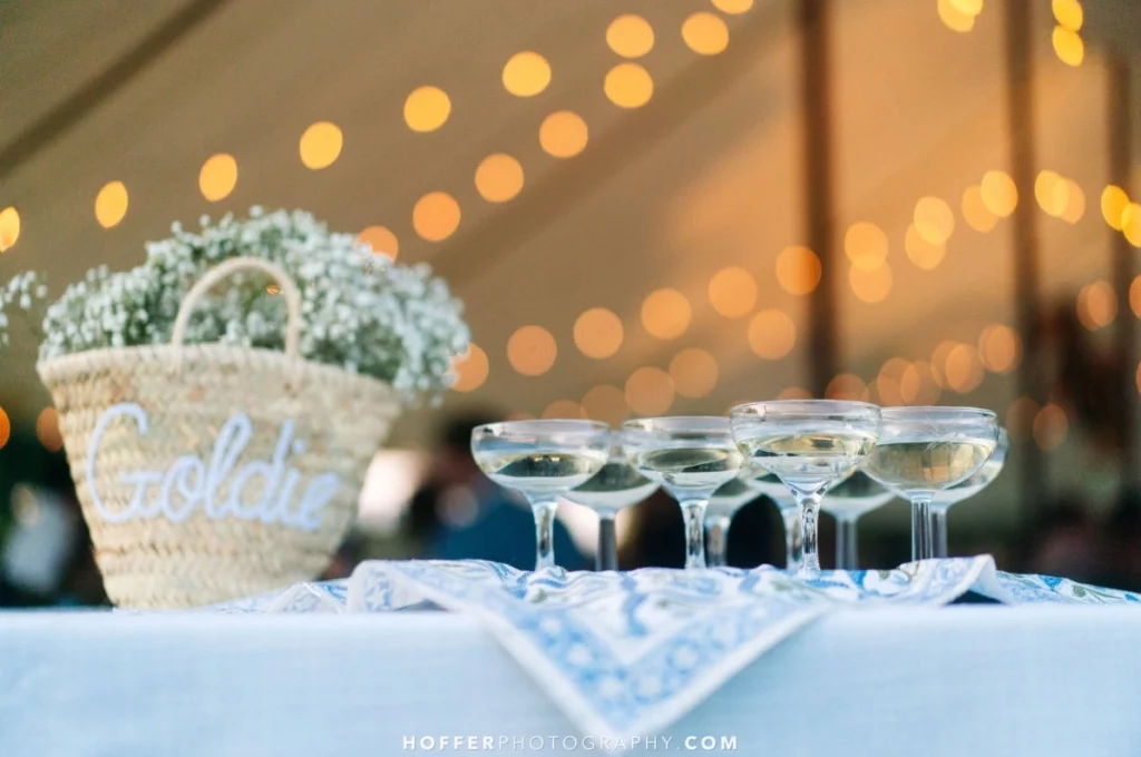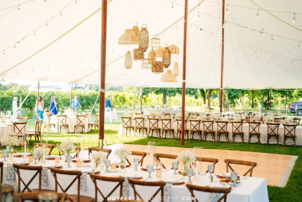 Guests then transitioned to our expansive sailcloth tent for an unforgettable reception. Tables were dressed in crisp white linens, paired with wood-tone cross-back chairs, rattan charger plates, and our ivory china with gold trim. Etched dusty blue water goblets added a subtle pop of color to the elegant table settings.