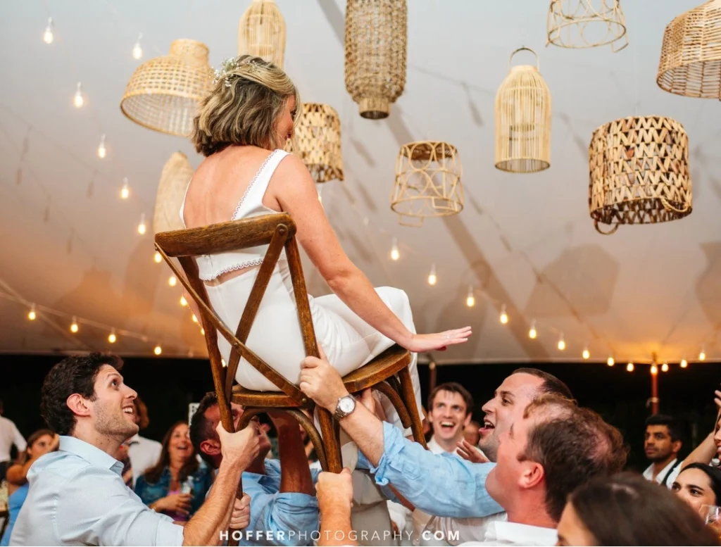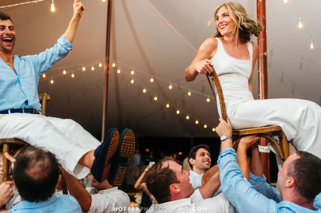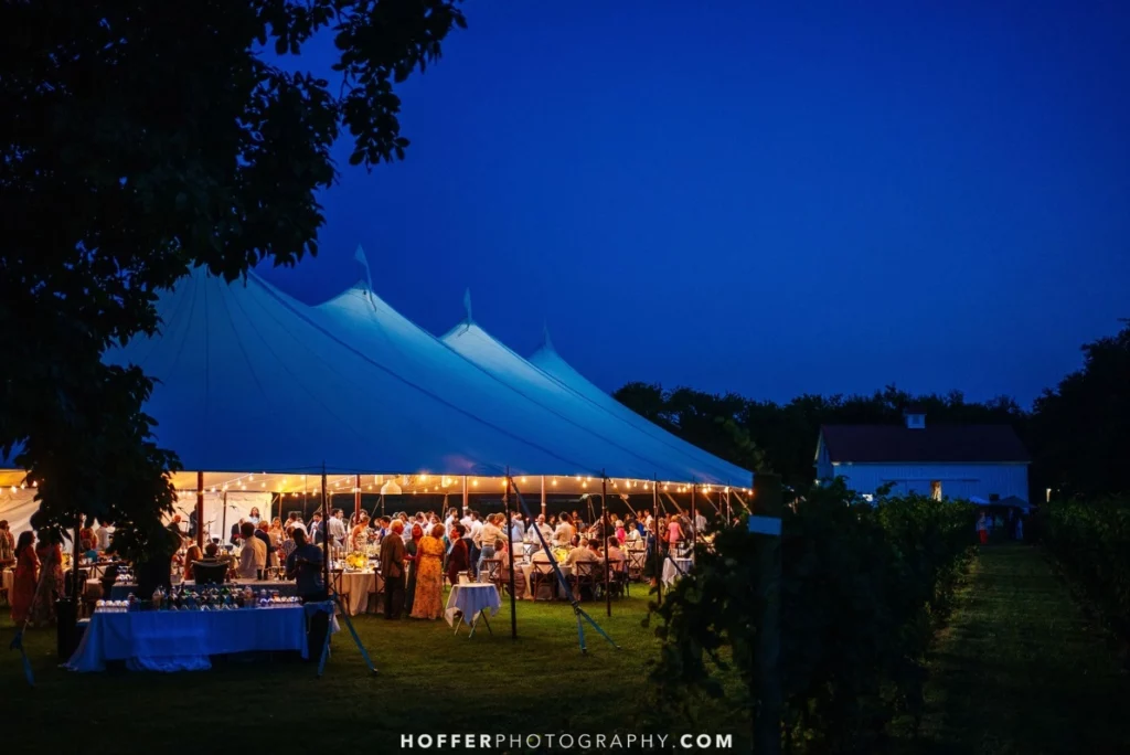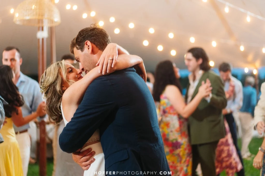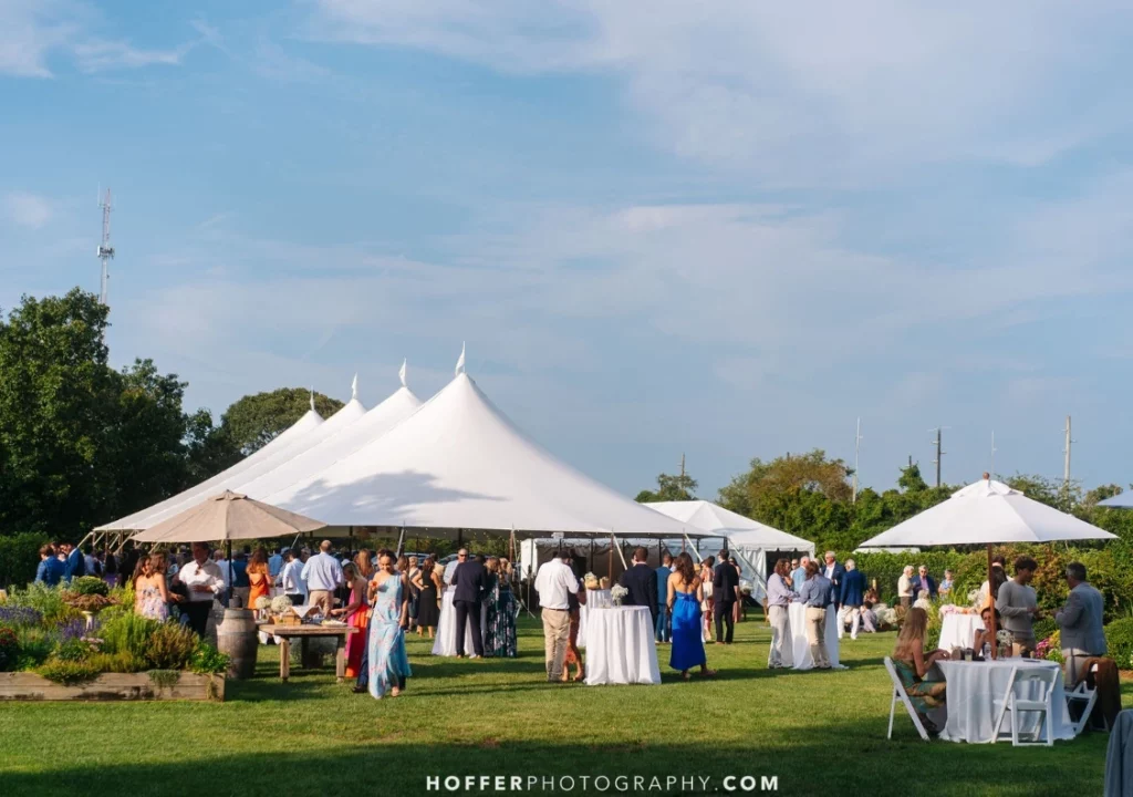 Guests then transitioned to our expansive sailcloth tent for an unforgettable reception. Tables were dressed in crisp white linens, paired with wood-tone cross-back chairs, rattan charger plates, and our ivory china with gold trim. Etched dusty blue water goblets added a subtle pop of color to the elegant table settings.