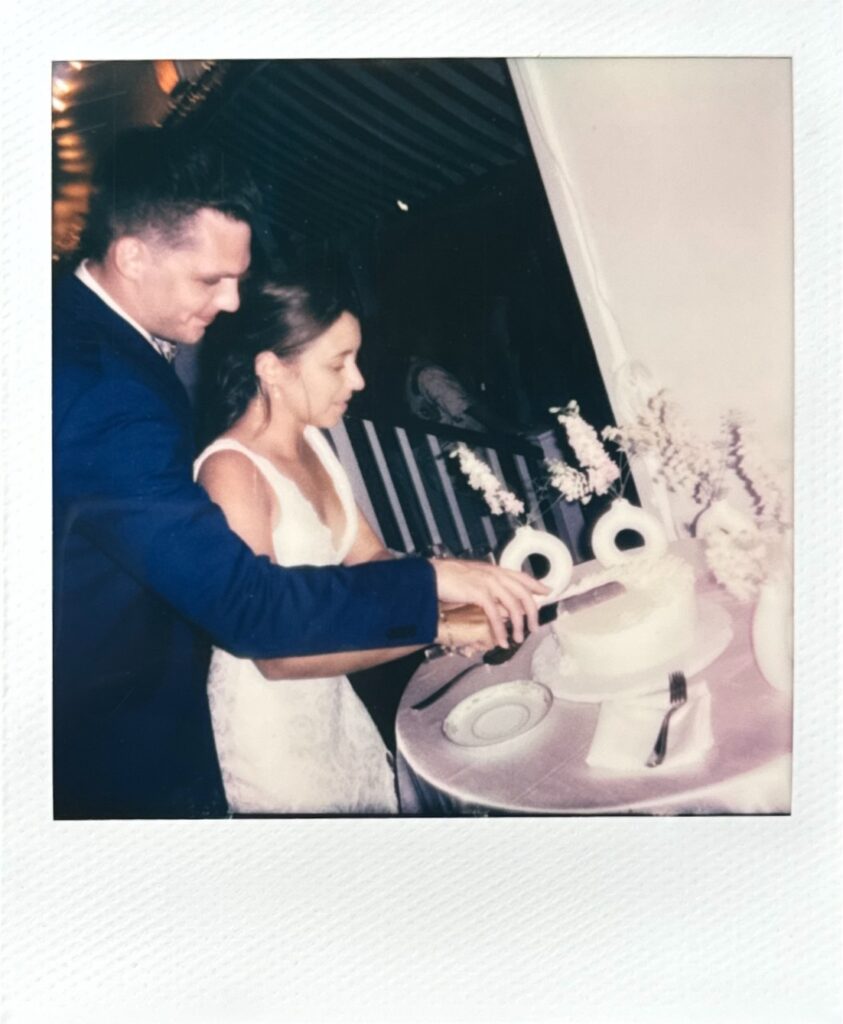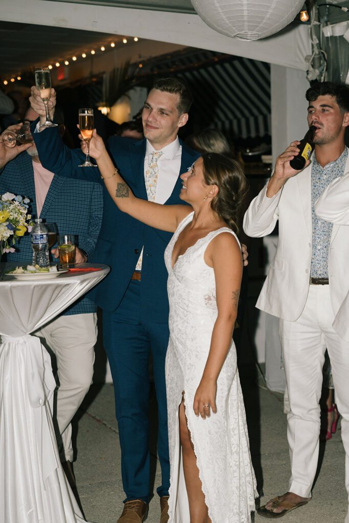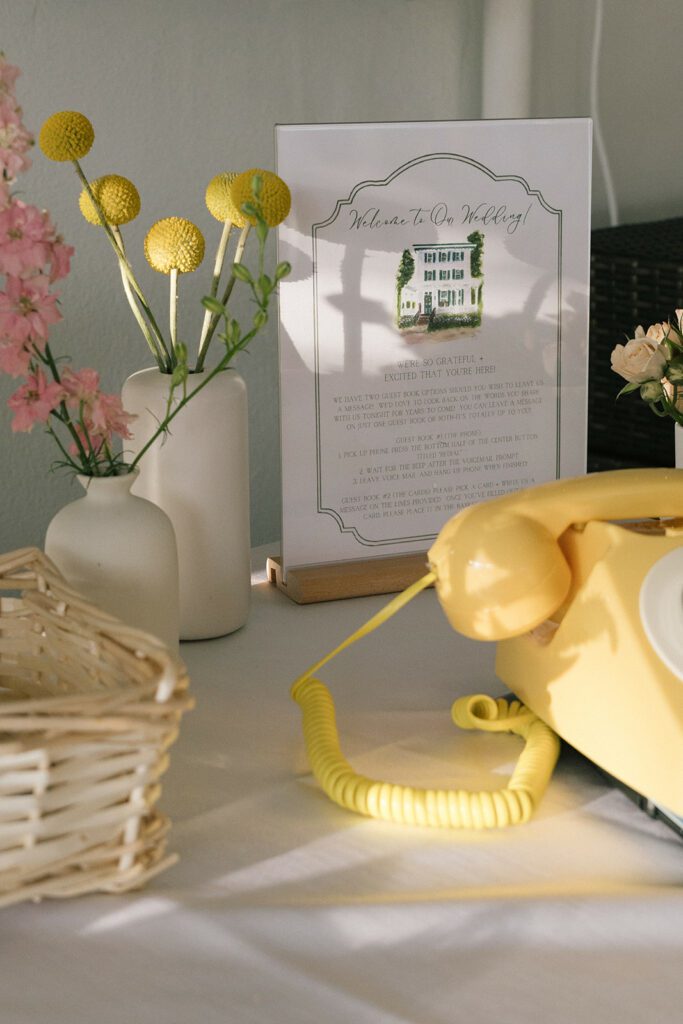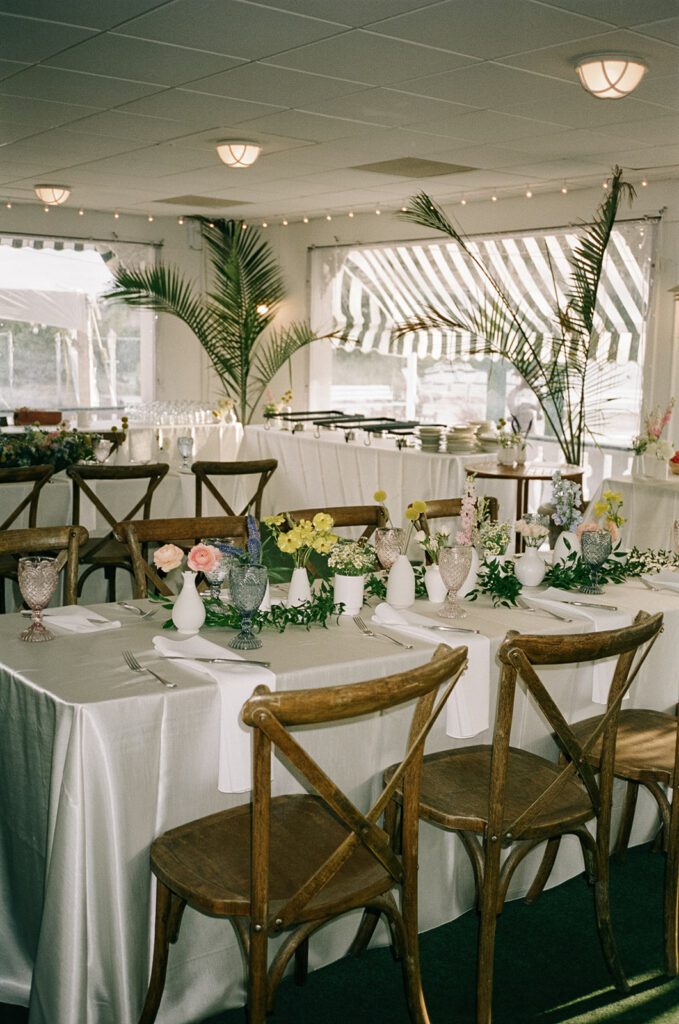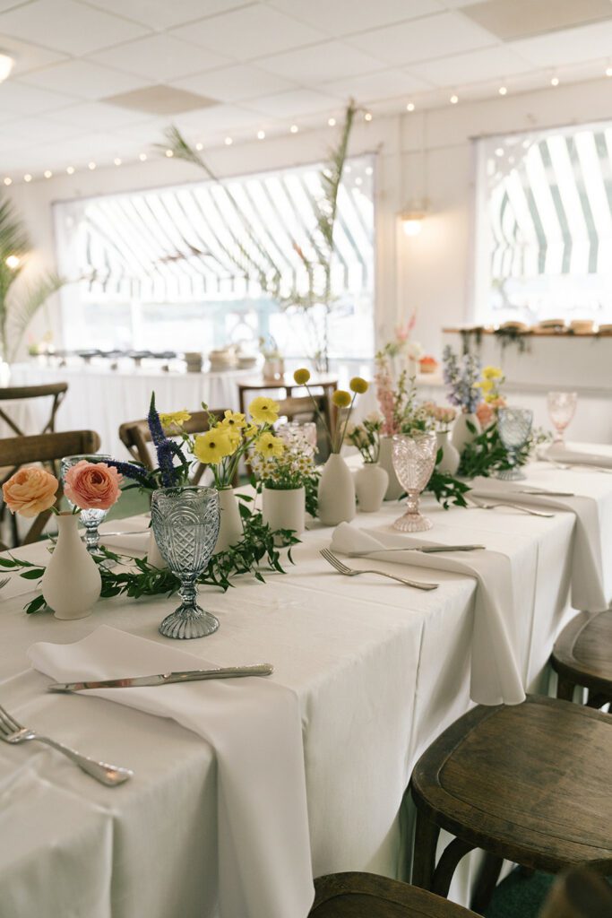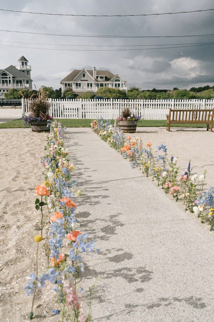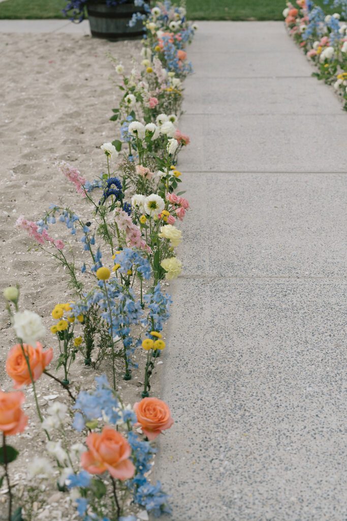 The couple embraced a cheerful palette of coral, yellow, and blue, which was beautifully woven throughout the day. From the playful floral aisleway lined with bouncy blooms to the charming bud vases decorating the reception tables, every detail exuded joy and whimsy. The couple’s creative food choices also made the day extra special, adding a fun and personalized touch to their wedding festivities.
