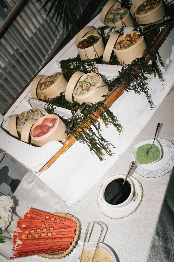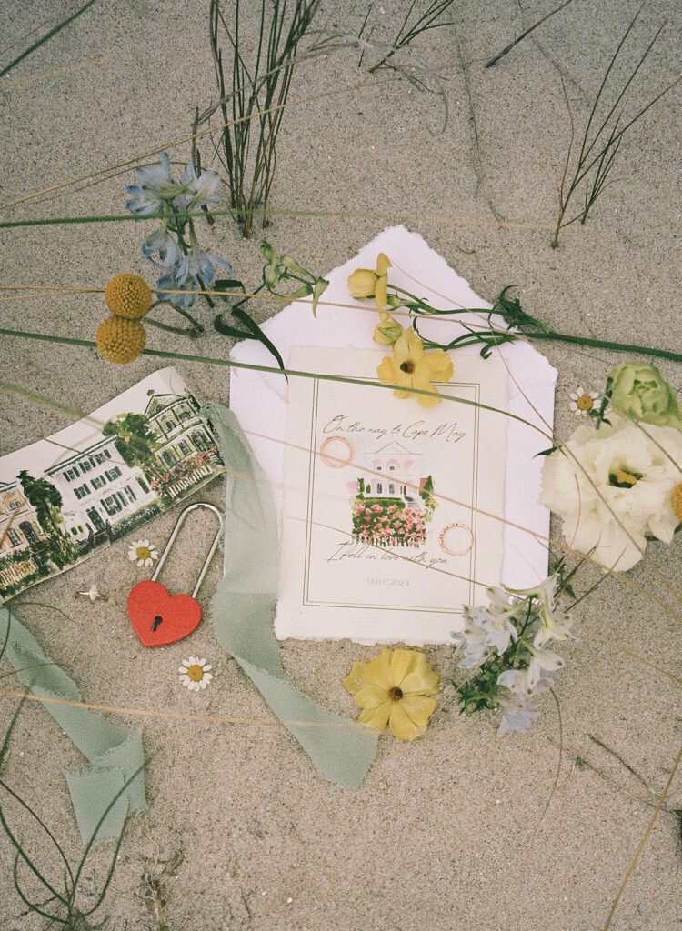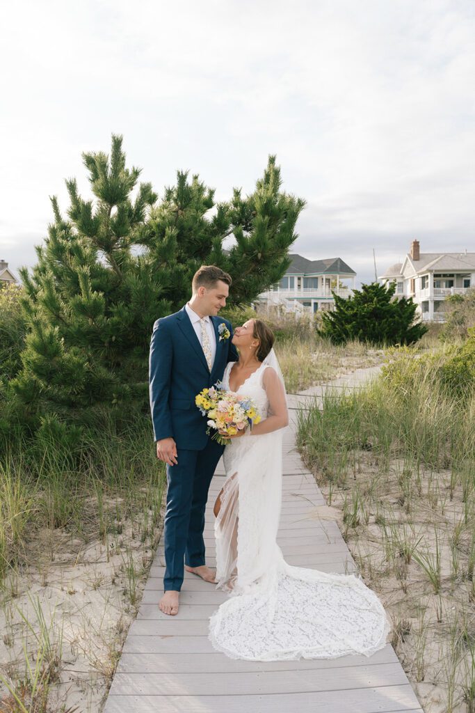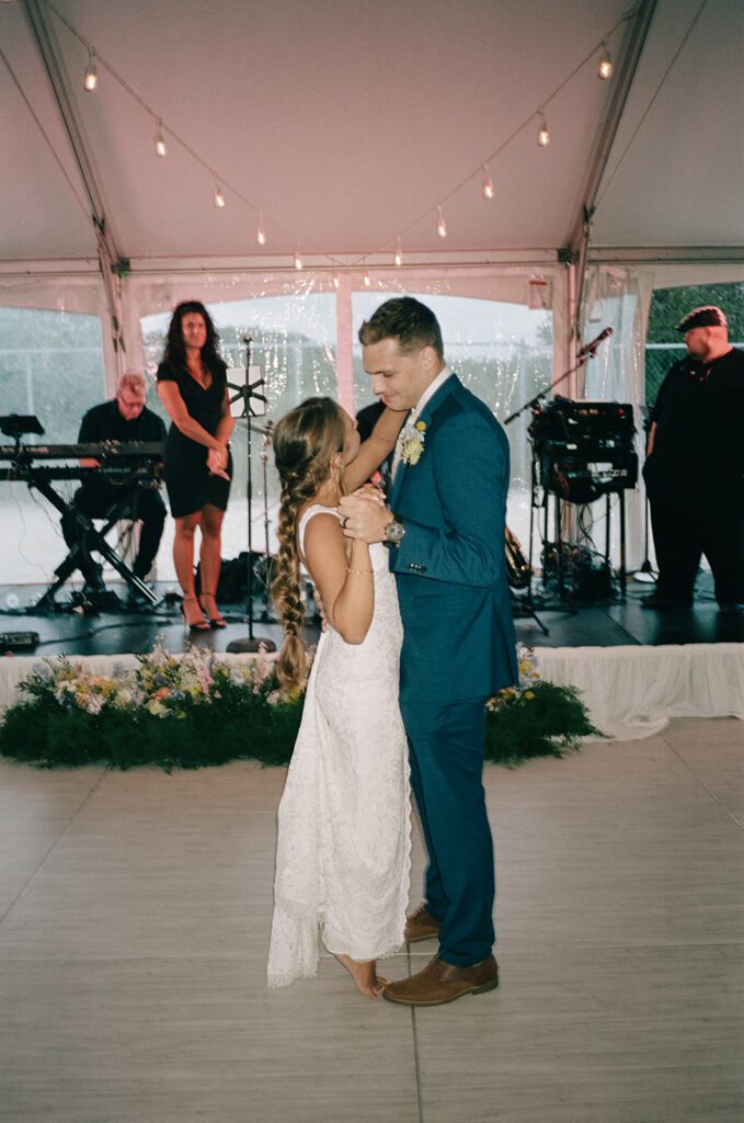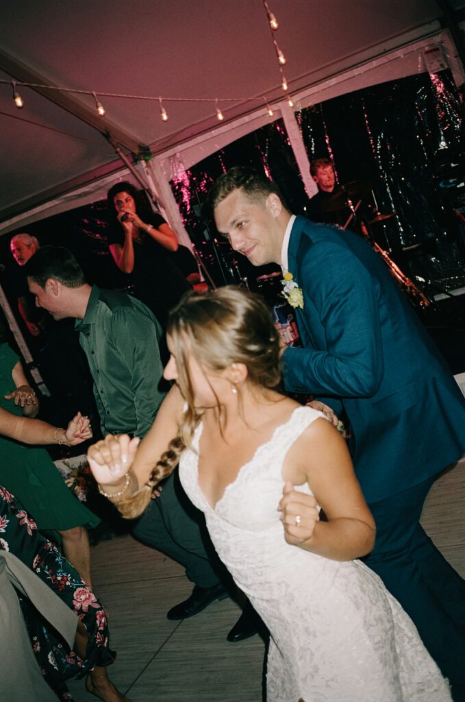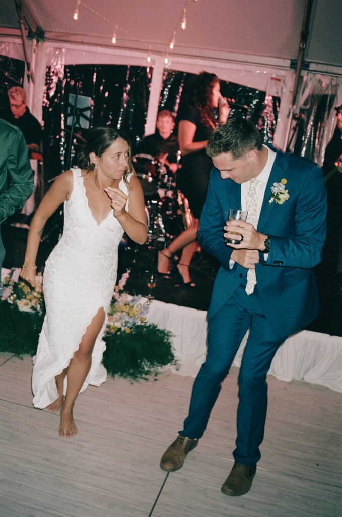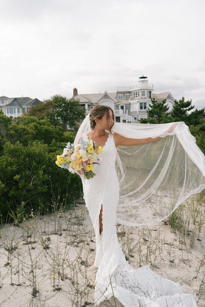 The couple embraced a cheerful palette of coral, yellow, and blue, which was beautifully woven throughout the day. From the playful floral aisleway lined with bouncy blooms to the charming bud vases decorating the reception tables, every detail exuded joy and whimsy. The couple’s creative food choices also made the day extra special, adding a fun and personalized touch to their wedding festivities.