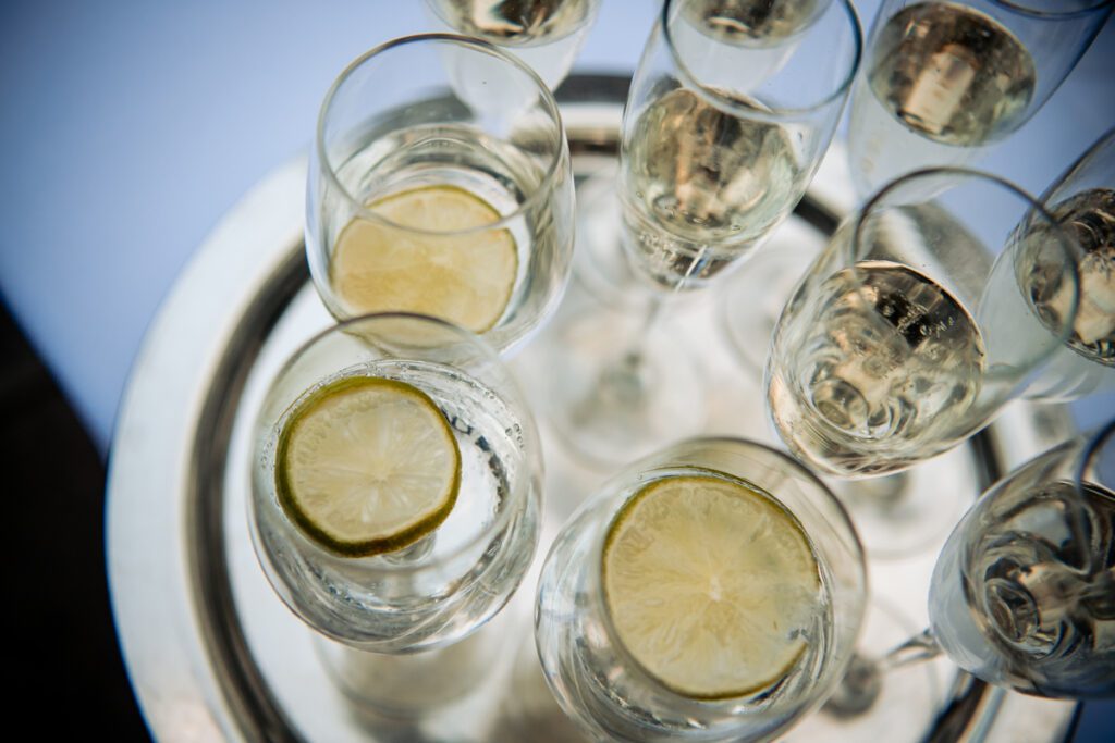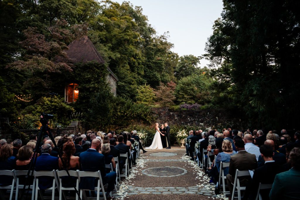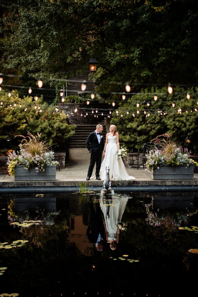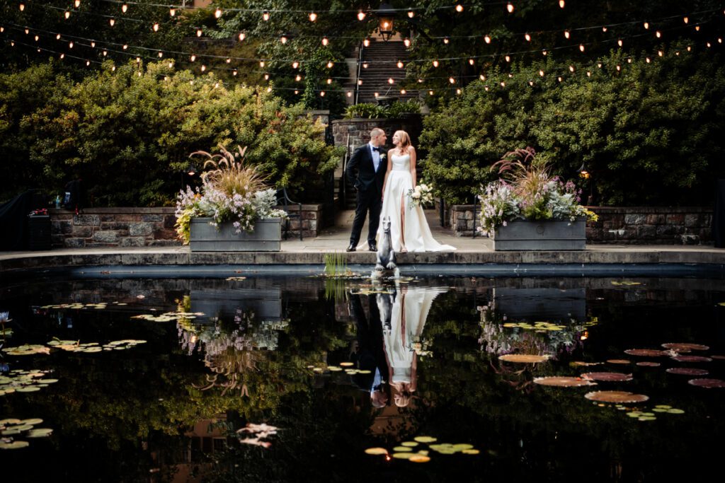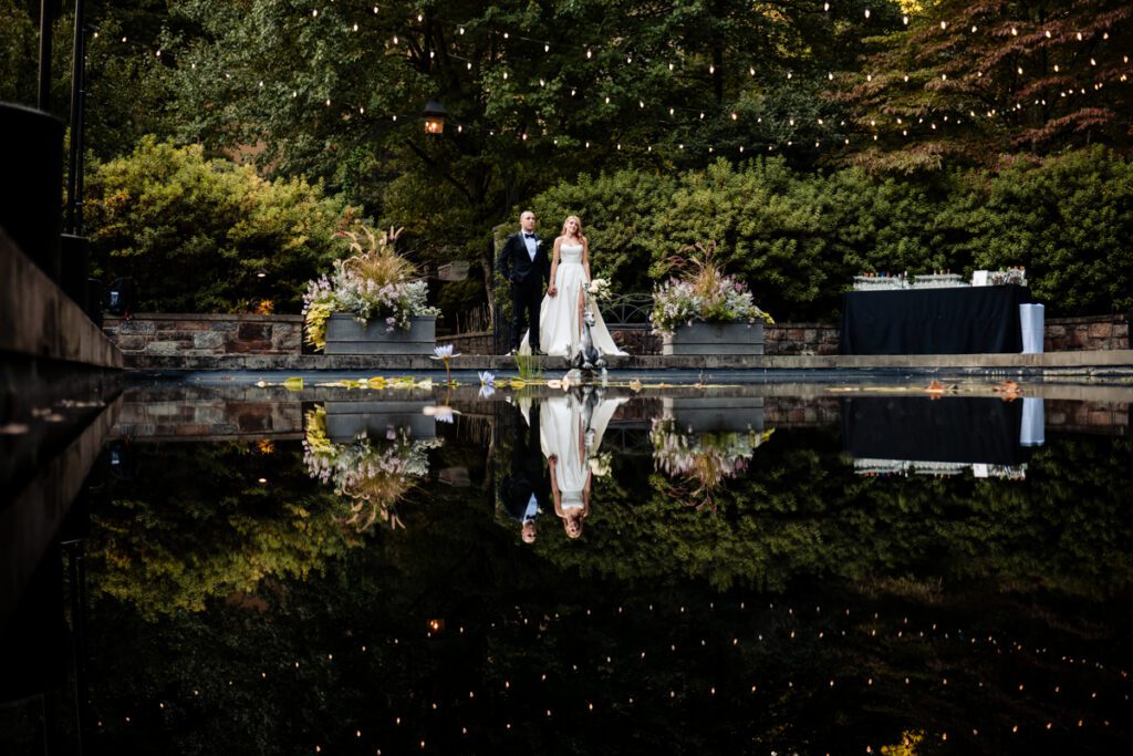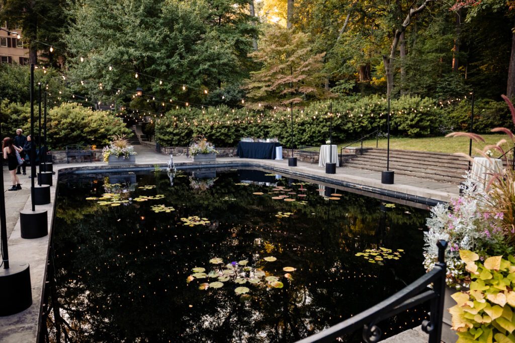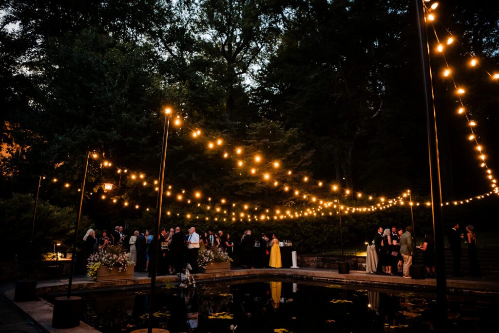 During cocktail hour, we suspended overhead lighting across the reflecting pond to create the perfect setting during the early evening cocktail hour.