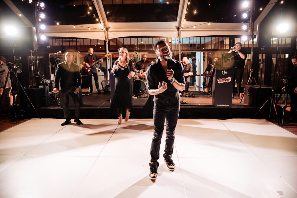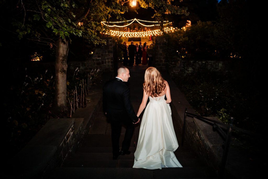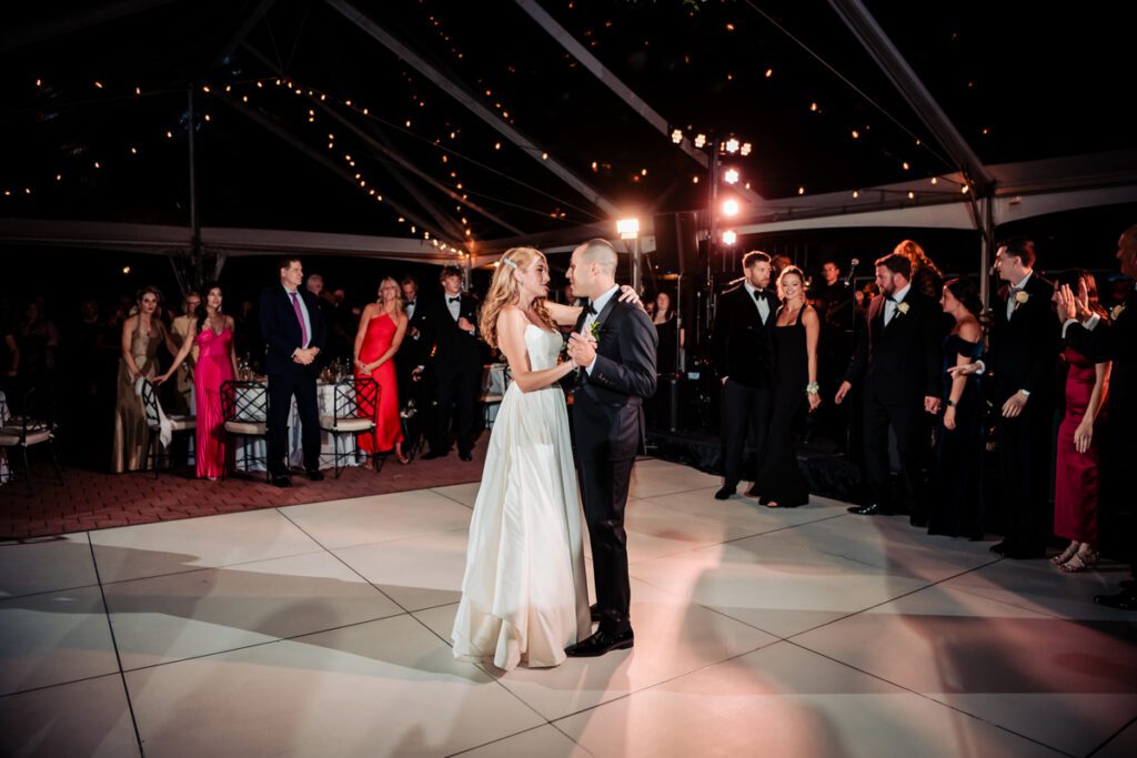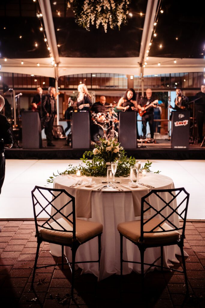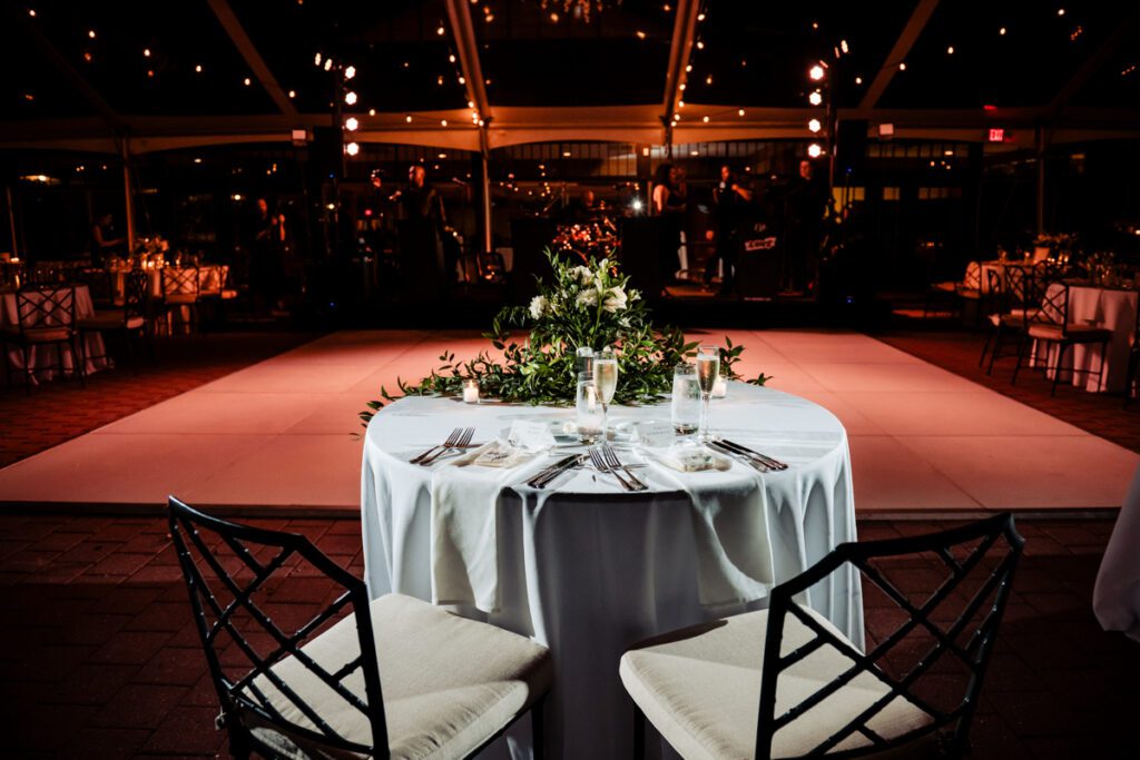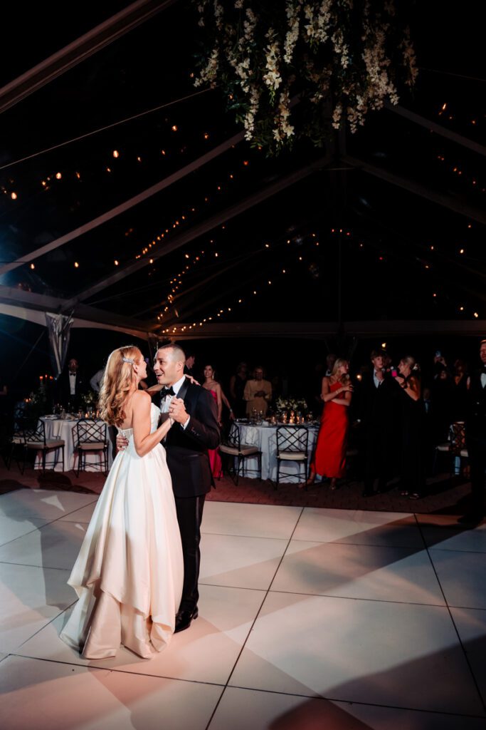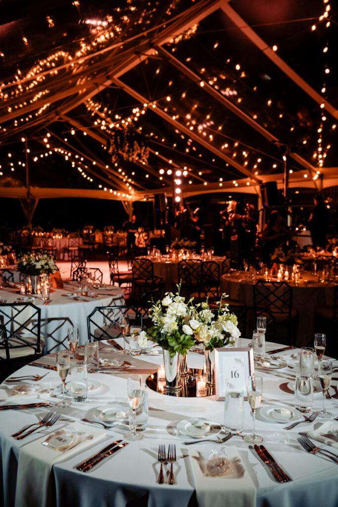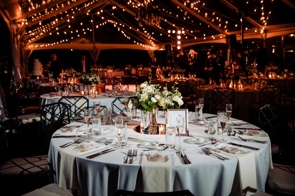This beautiful September wedding, held at Winterthur Museum, and planned with Erin at Proud to Plan, showcases our clear top tent, installed over the patio off of the visitors center, draped with tuscan bistro lighting to illuminate the interior. Inside of the tent, you will find a band stage, and our all white dance floor.