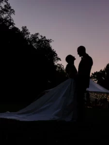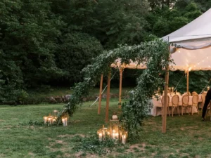 Wedding rentals included our sailcloth tent, white padded chairs, cocktail tables, and lighting.