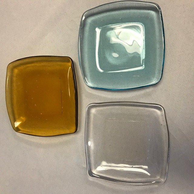 Our Square glass plates come in clear, aqua, and amber colors. Their 5″ size makes them a great option for appetizers, desserts, or small plate courses.
