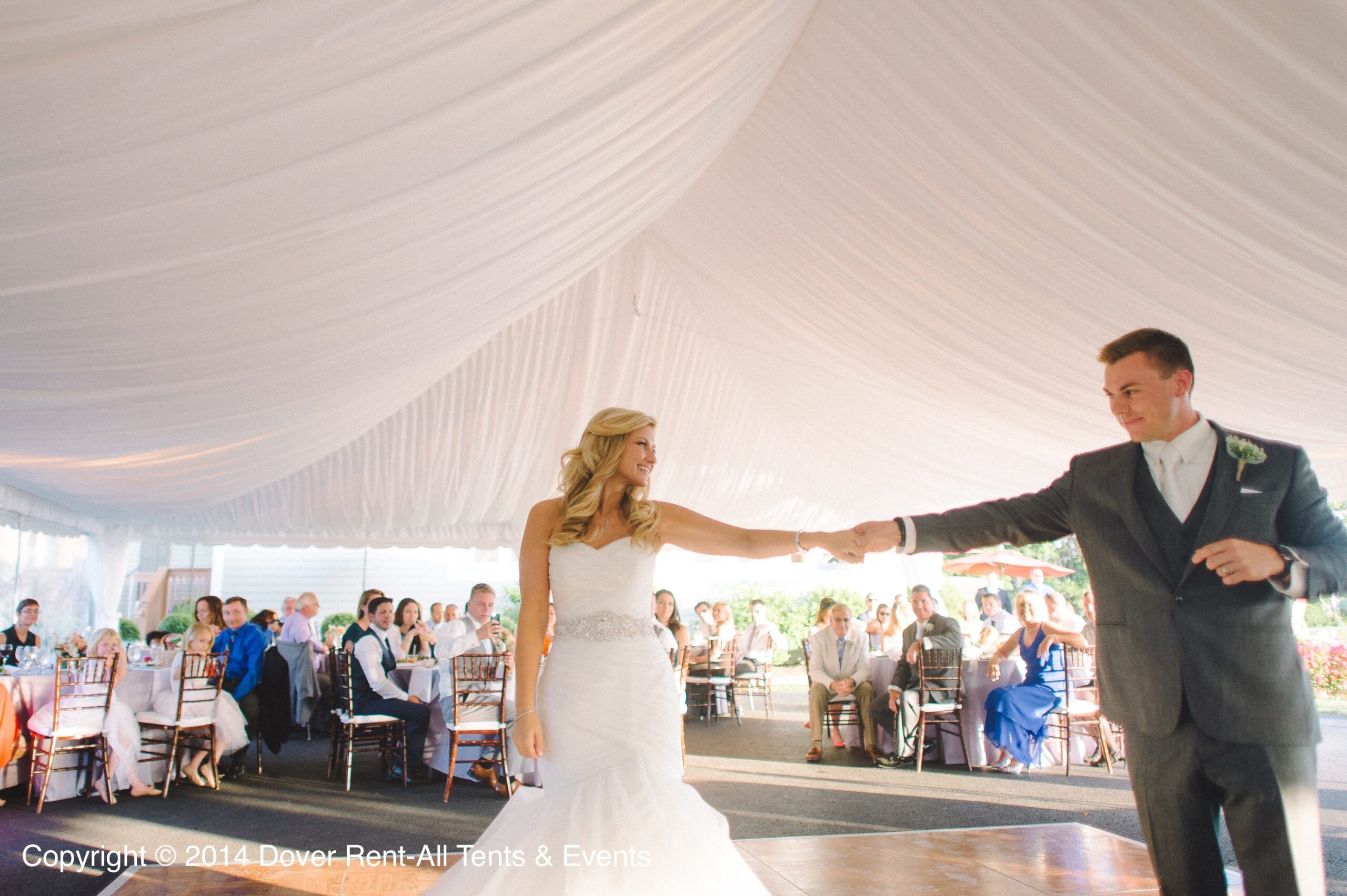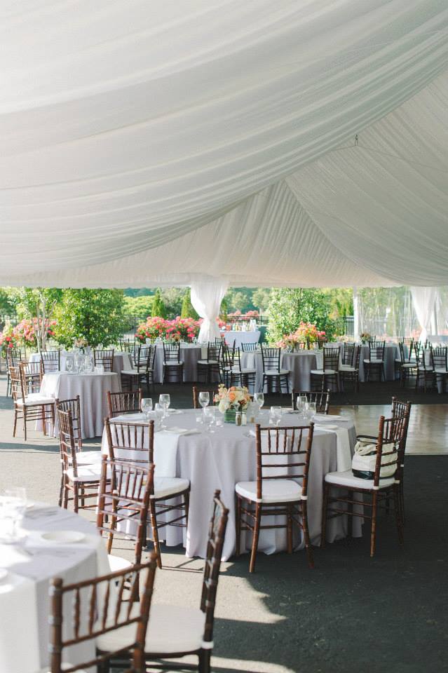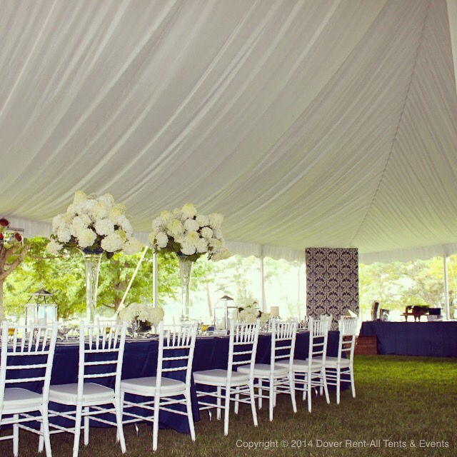 Our white fabric ceiling liner draping for frame tents, are secured to the tent ceiling to cover the metal frame work of the tent, giving it a soft and airy feel. The ceiling liner is often paired with our side pole drapes.