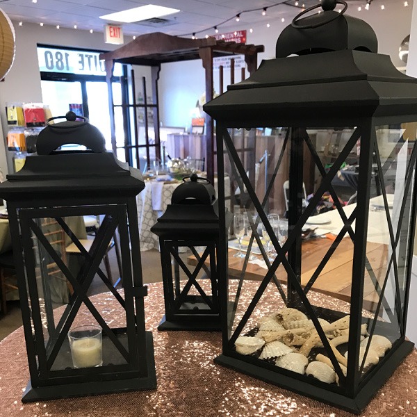 We offer tabletop black Lanterns in three sizes, a great center piece accent or frame for your ceremony aisleway! Ask about our 3 size options!