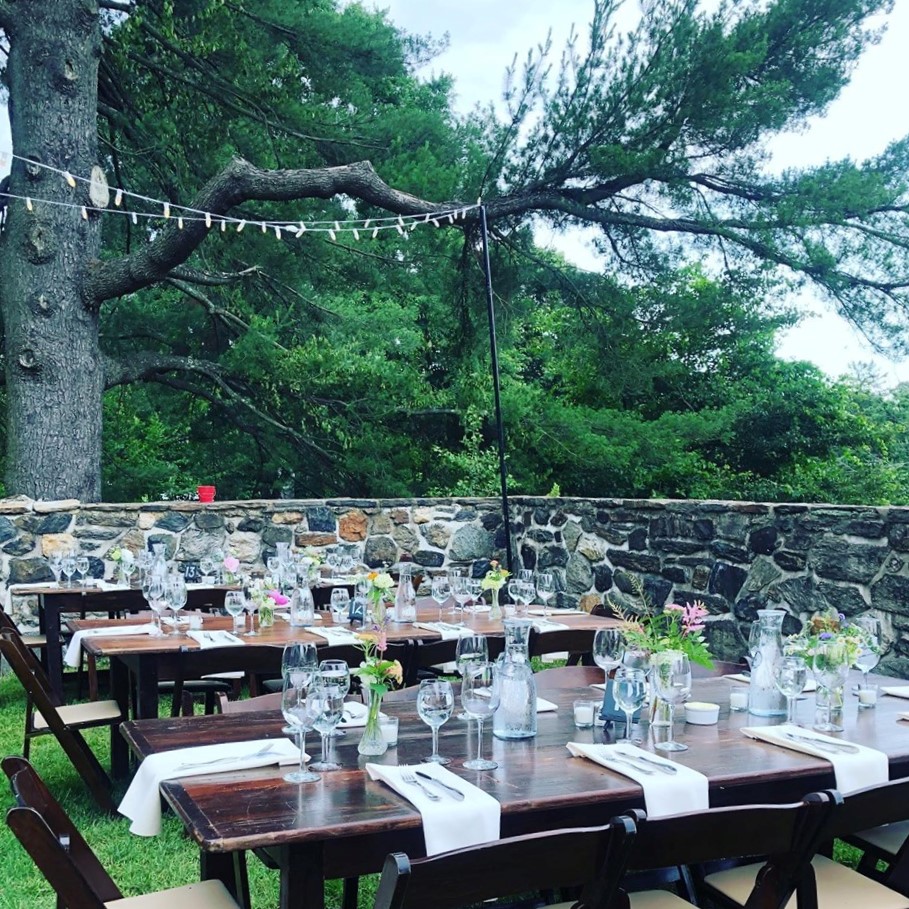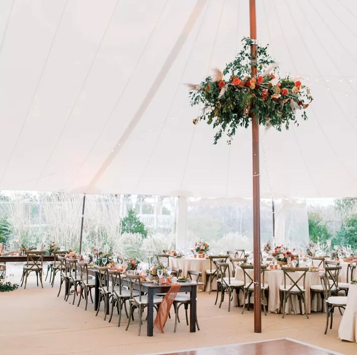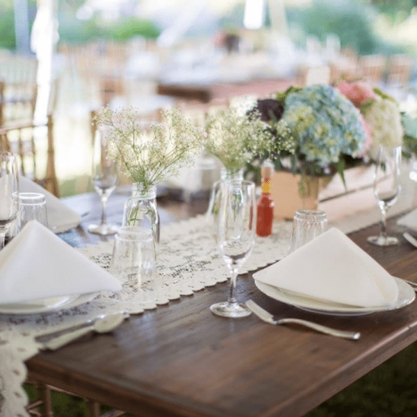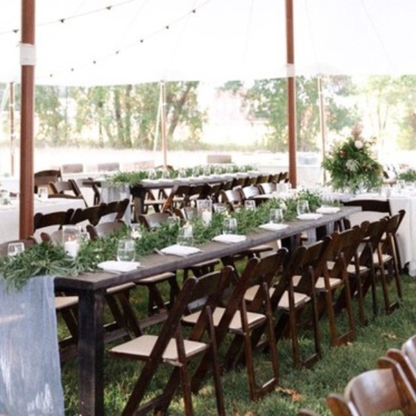 Our mahogany farmhouse tables have a rich dark wood stain with wooden tops and legs. They seat 8-10 guests per table and are a great way to bring in warm tones for your wedding or event!