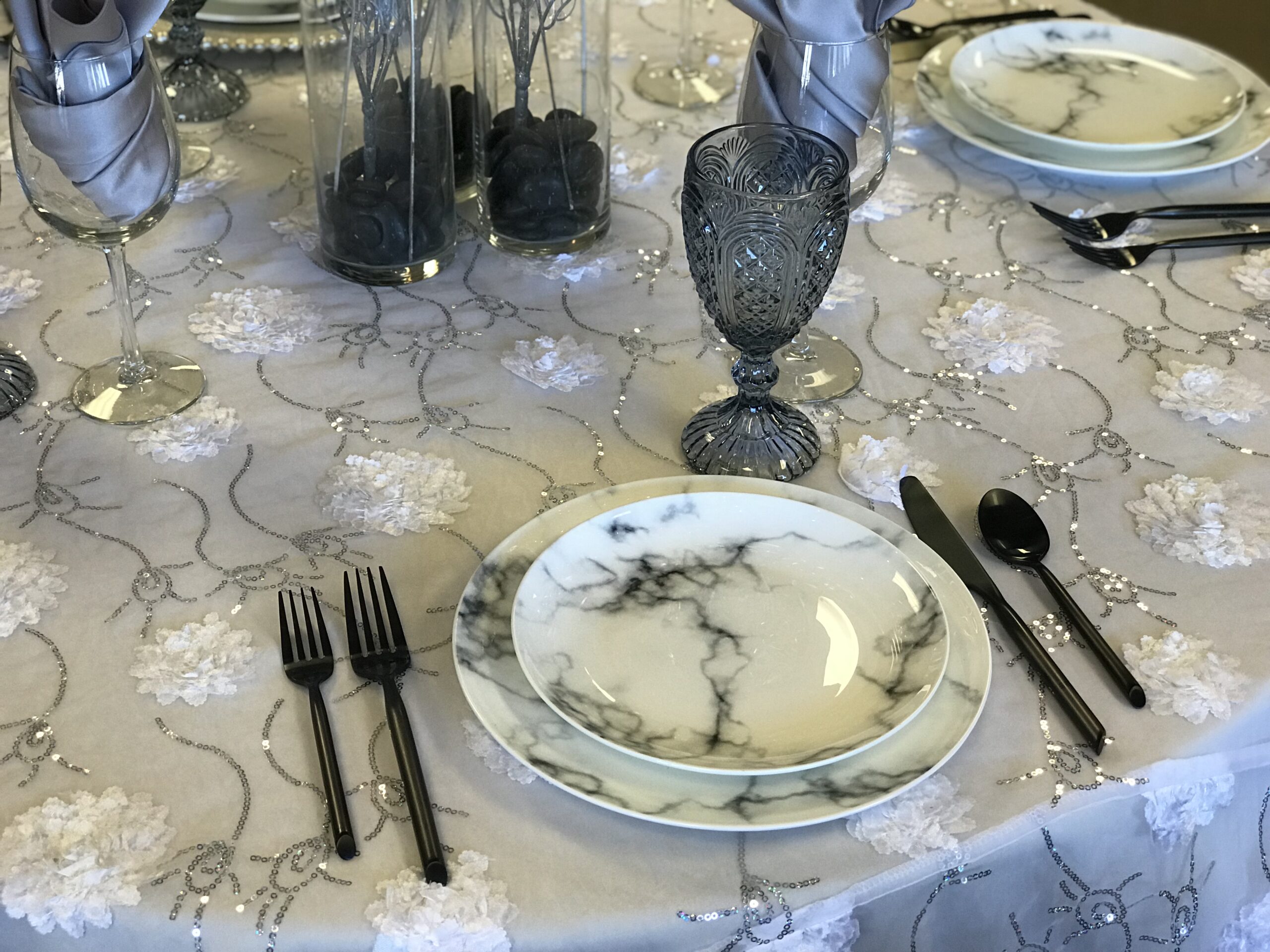 Our Bella Marbled china pattern is the perfect modern touch to your table top and pair nicely with our Capri matte black flatware.