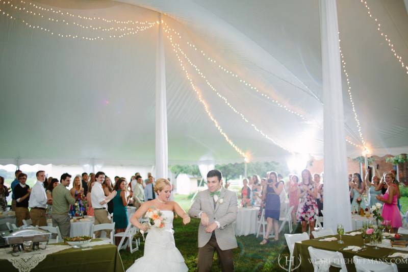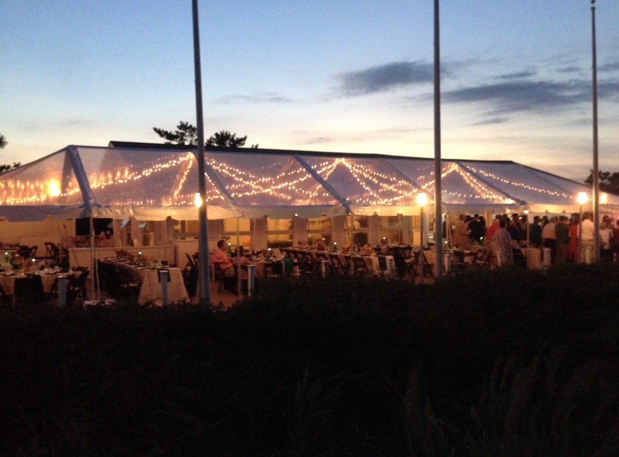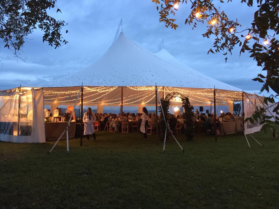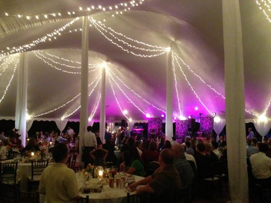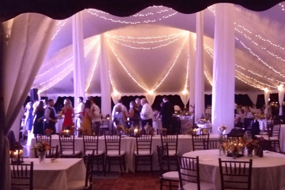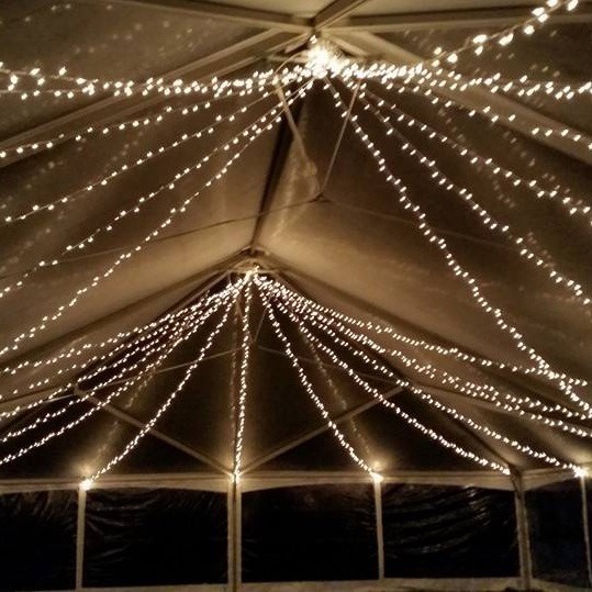 Twinkle Swag Tent Lighting is available for both frame, sailcloth, and high peak tents. The lighting is elegantly draped from the center out to the eave of the tent, creating a blanket of twinkle lights in your wedding tent, for a starry night look!