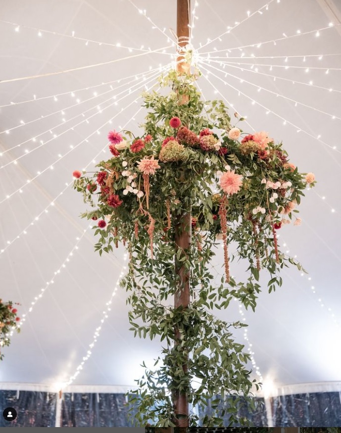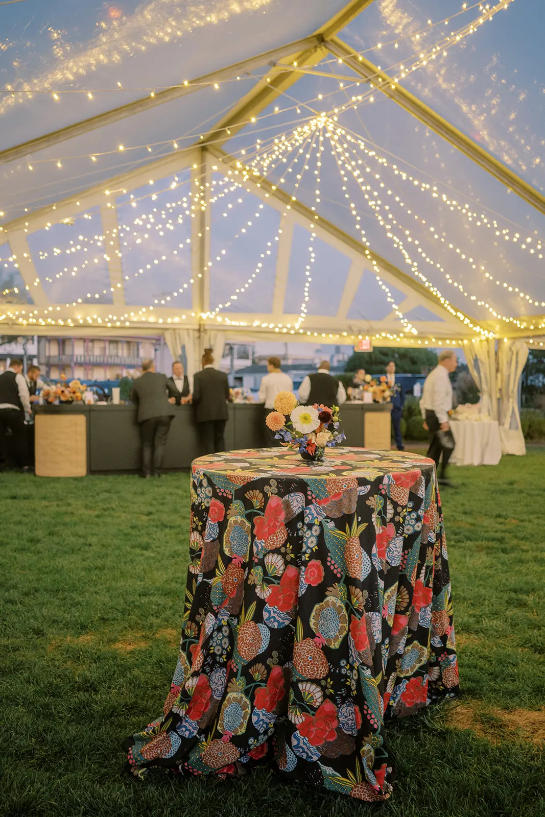 clear tent with twinkle lights, table with floral linen