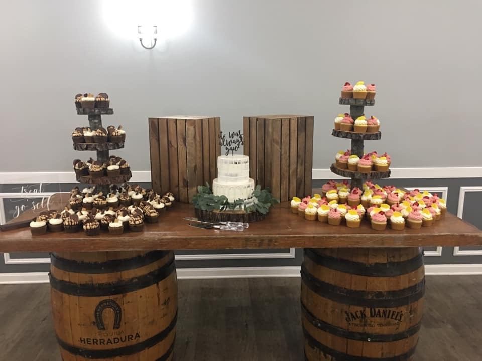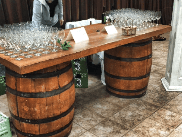Our wine barrel bar is made up of two wine barrels, and a reclaimed wood top. The wine barrel bar can also be used as a food station, dessert display table, or accent table for your event!
