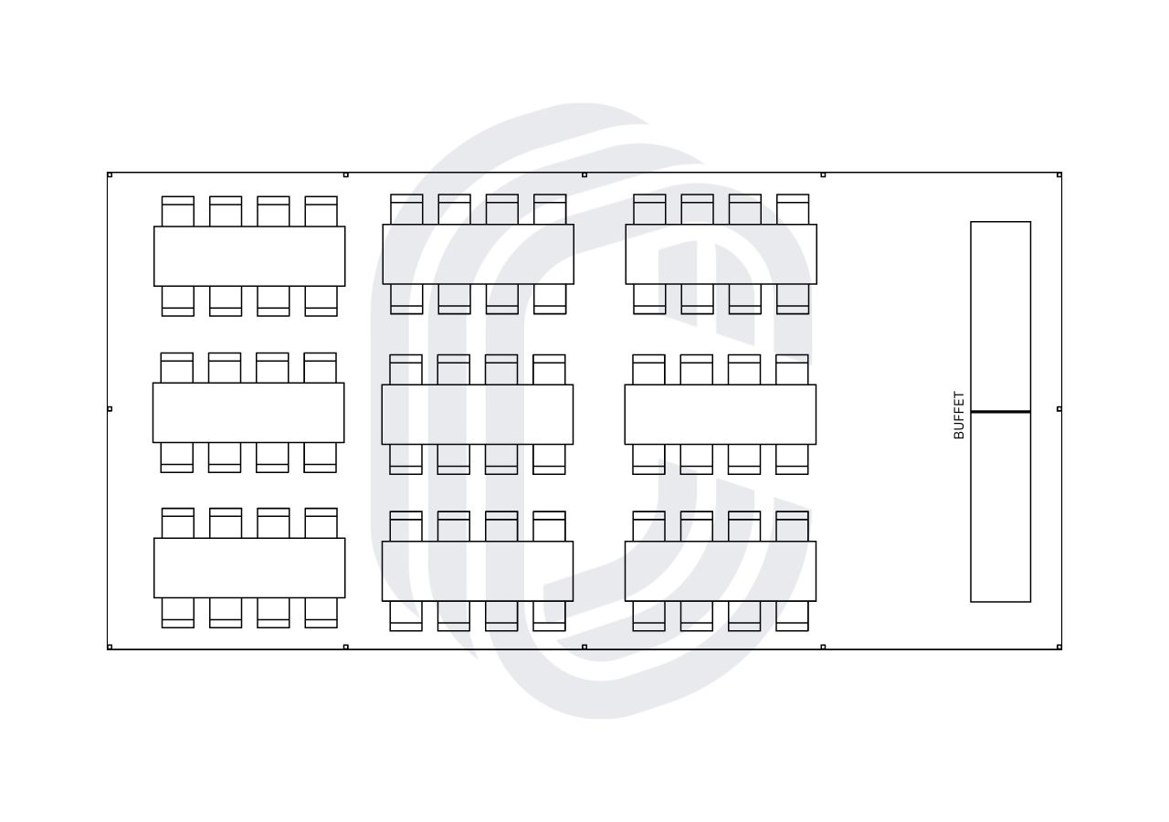 Sample tent floor plan, under our 20×40 tent, showing seating at long banquet tables for up to 72 guests, with space for food or beverage service. This floor plan is great for your next backyard party!