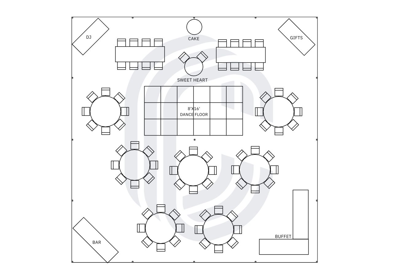 40′ by 40′ Tent Layout for a 74 Guest Wedding