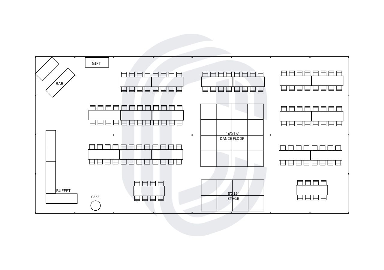 This 40′ by 80′ Tent wedding layout shows seating for up to 144 guests at family style groupings of 8′ Banquet tables. In addition, this sample wedding tent layout has ample space for a dance floor, band stage, buffet tables, bar, cake, and gift tables.