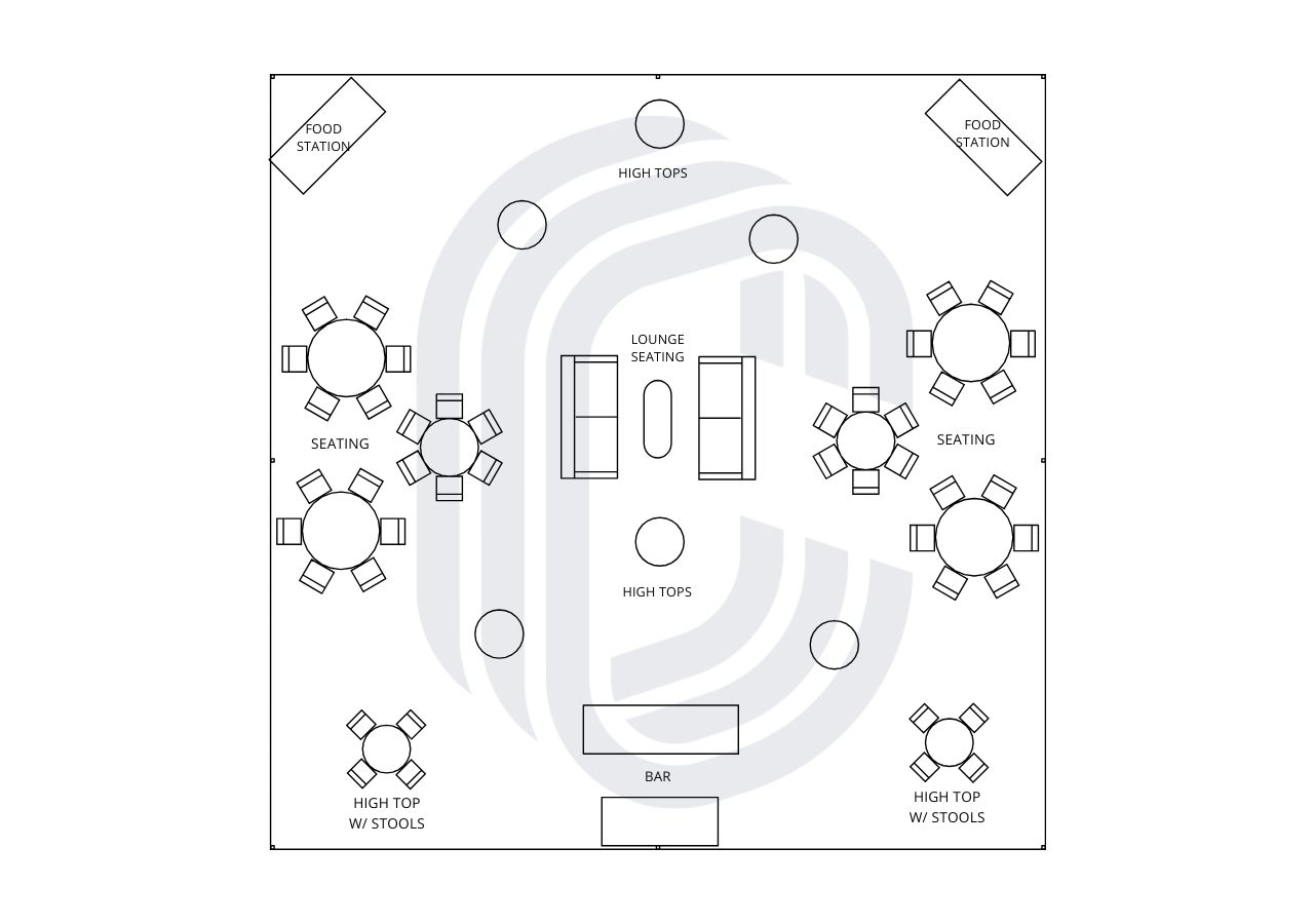 Shown here, is a sample tent layout for a cocktail party for 100 guests. This 40′ by 40′ Tent provides ample space to house 100 of your closest friends. Providing space for a bar area, food stations, lounge seating, high top tables for standing room plus the option to add in bar stools, and a variety of round table sizes for seating.