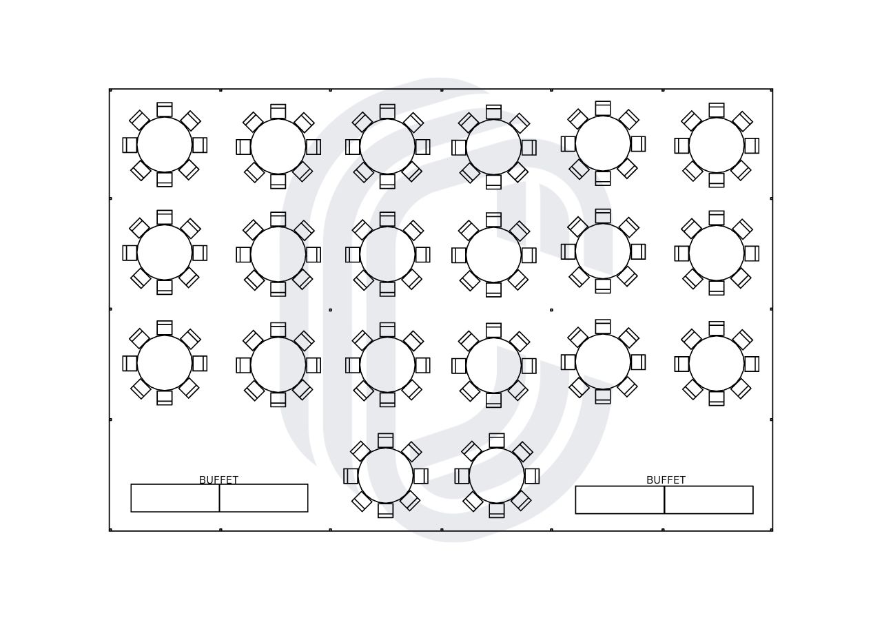 40' by 60' Pole Tent Layout for 160 Guests with Round Tables and Buffet Space Only
