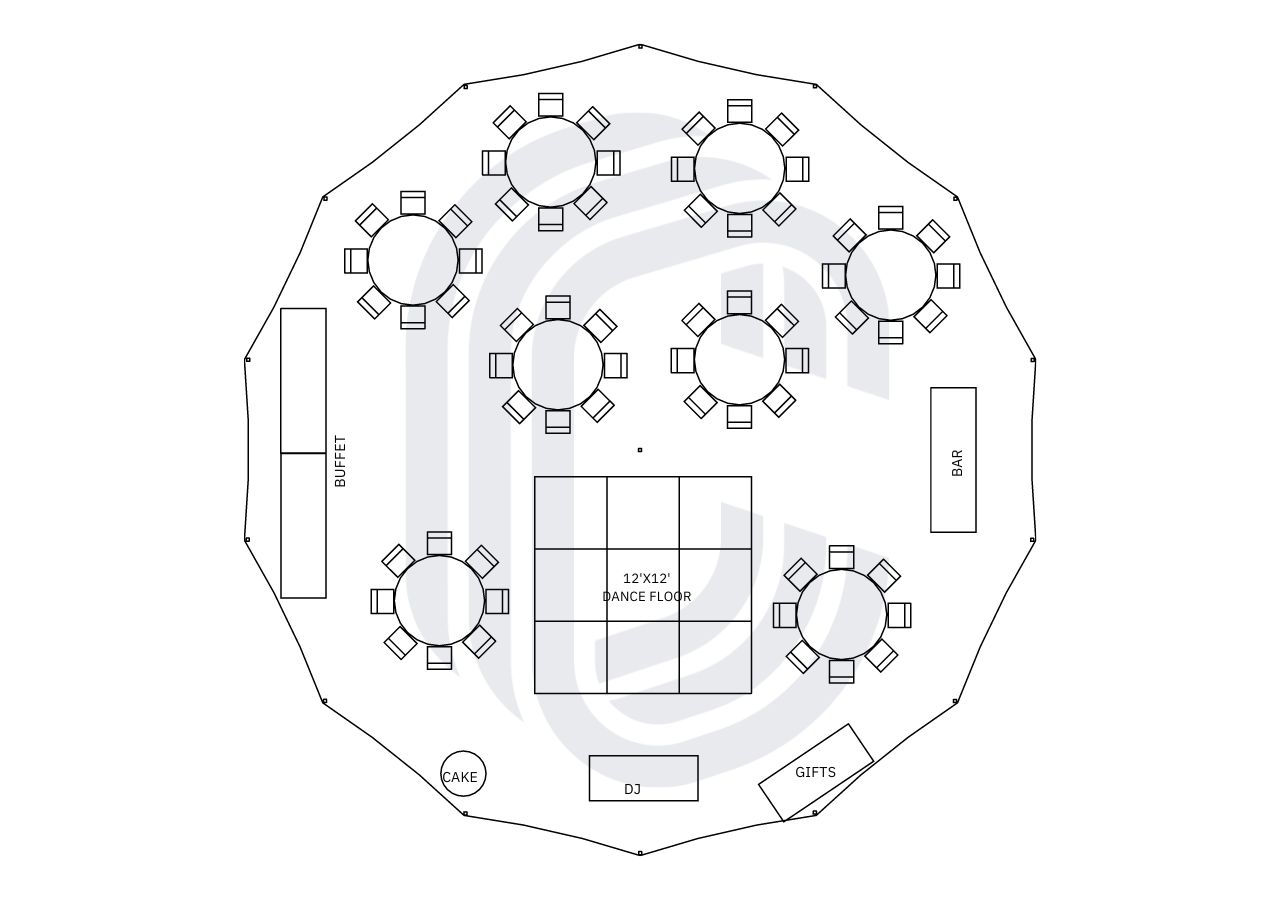 Sample Sailcloth Tent layout for an smaller wedding or event of up to 64 guests. The sailcloth tent offers a unique rounded footprint, and sweeping peaked style. This sample layout in our 45′ by 44′ Sailcloth tent, shows seating for 64 guests, dance floor, food and beverage service, and more!