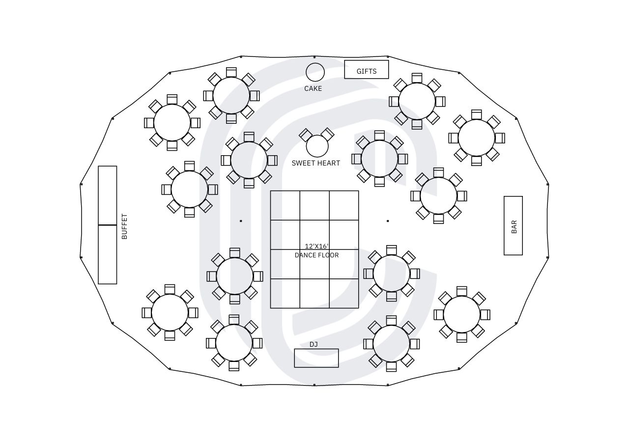 45′ by 64′ Sailcloth Tent Layout for a 115 Guest Wedding