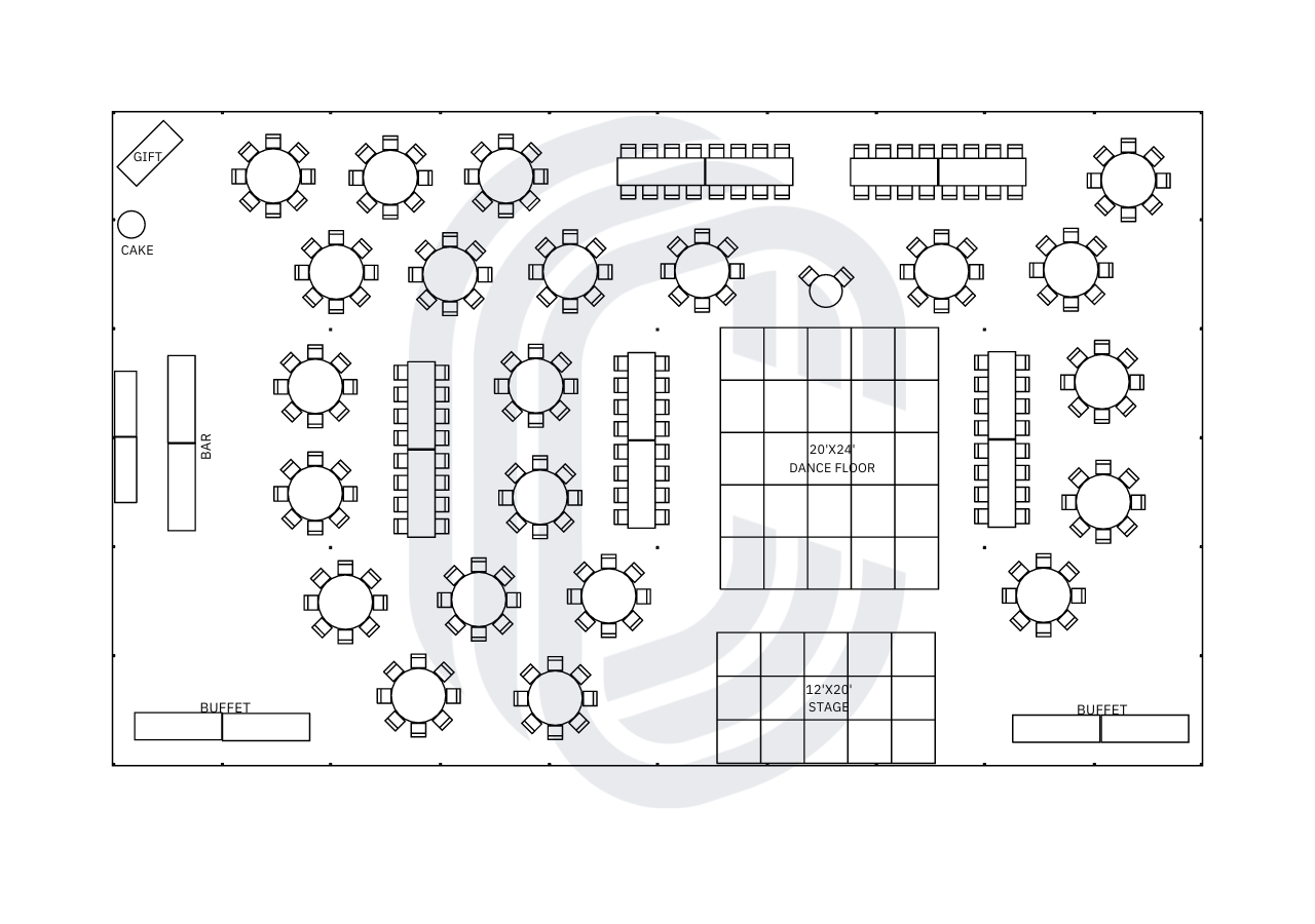 If you are hosting a wedding or special event for 250 guests, this wedding reception layout in our 60′ by 100′ tent size will be perfect for you. This sample tent layout showcases ample space to seat over 250 guests, space for a band stage, large dance floor, plus multiple buffet stations or beverage stations!