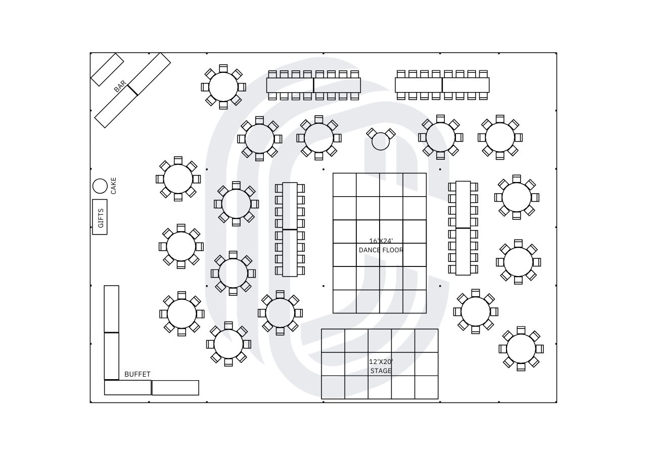 This 60′ by 80′ Tent wedding layout shows seating for up to 194 guests, seating at a mix of long banquet and round tables. In addition, this sample wedding tent layout has ample space for a spacious dance floor, band stage, buffet tables, large bar area, cake, and gift tables.